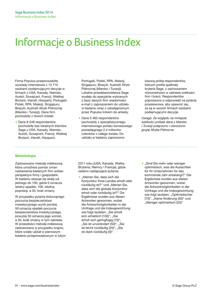Sage Business Index 2014 Informacje o Business Index Informacje o Business Index Firma Populus przeprowadziła wywiady internetowe z 13 710 osobami podejmującymi decyzje w firmach z USA, Kanady, Niemiec, Austrii, Szwajcarii, Francji, Wielkiej Brytanii, Irlandii, Hiszpanii, Portugalii, Polski, RPA, Malezji, Singapuru, Brazylii, Australii Afryki Północnej (Maroko i Tunezji). Dane firm pochodziły z dwóch źródeł: • Dane 8 248 respondentów pochodziły baz lokalnych klientów Sage z USA, Kanady, Niemiec, Austrii, Szwajcarii, Francji, Wielkiej Brytanii, Irlandii, Hiszpanii, Portugalii, Polski, RPA, Malezji, Singapuru, Brazylii, Australii Afryki Północnej (Maroko i Tunezji). Lokalne przedstawicielstwa Sage wysłały do specjalnie wybranych z bazy danych firm wiadomości e-mail z zaproszeniem do udziału w badaniu wraz z udostępnionym przez Populus linkiem do ankiety. losową próbę respondentów, których profile spełniały kryteria Sage, z zachowaniem różnorodności w zakresie wielkości firm i branż. Respondentów poproszono o odpowiedź na pytania przesiewowe, aby upewnić się, że są w swoich firmach osobami podejmującymi decyzje. • Dane 5 462 respondentów pochodziły z specjalistycznego internetowego portalu biznesowego posiadającego 2,4 milionów członków z całego świata. Do udziału w badaniu zaproszono Uwaga: Ze względu na mniejsze wielkości próbek dane z Maroko i Tunezji połączono i utworzono grupę Afryka Północna 2011 roku (USA, Kanada, Wielka Brytania, Niemcy i Francja), gdzie zadano następujące pytania: • „Sind Sie mehr oder weniger optimistisch, was die Aussichten für Ihr Unternehmen für das kommende Jahr anbelangt?“ Die Ergebnisse wurden aus diesen Antworten gewonnen, wobei die Antwortmöglichkeiten in der Umfrage und die Indexgewichtung wie folgt lauteten: „Optimistischer (75)“, „Keine Änderung (50)“ und „Weniger optimistisch (25)“ Metodologia Zastosowano metodę indeksową, która umożliwia pomiar zmian nastawienia badanych firm wobec perspektyw firmy i gospodarki. W badaniu stosuje się skalę od jednego do 100, gdzie 0 oznacza istotny spadek, 100, istotną poprawę, a 50, brak zmiany. W przypadku pytania dotyczącego poczucia bezpieczeństwa inwestycyjnego wynik poniżej 50 oznacza spadek poczucia bezpieczeństwa inwestycyjnego, powyżej 50 oznacza jego wzrost, a 50, brak zmiany w tym zakresie. W przeszłości metodę indeksową zastosowano w przypadku krajów, które wzięły udział w pierwszym badaniu przeprowadzonym w lutym 01 - www.sage.com/businessindex • „Meinen Sie, dass sich die Konjunktur Ihres Landes erholt oder rückläufig ist?“ und „Meinen Sie, dass sich die globale Konjunktur erholt oder rückläufig ist?“ Die Ergebnisse wurden aus diesen Antworten gewonnen, wobei die Antwortmöglichkeiten in der Umfrage und die Indexgewichtung wie folgt lauteten: „Sie erholt sich erheblich (100)“, „Sie erholt sich geringfügig (75)“, „Sie ist unverändert (50)“, „Sie ist leicht rückläufig (25)“, „Sie ist stark rückläufig (0)“. © Sage Group PLC Sage Business Index 2014 Informacje o Business Index Informacje o Business Index O firmie Sage Oferujemy małym i średnim organizacjom szereg łatwych w użyciu, bezpiecznych i wydajnych systemów oprogramowania i usług z zakresu zarządzania firmą – od księgowości i płac, po planowanie zasobów przedsiębiorstwa, zarządzanie relacjami z klientem i płatności. Nasi klienci stale otrzymują porady i wsparcie od naszej globalnej sieci lokalnych ekspertów, którzy służą im pomocą w rozwiązywaniu problemów biznesowych, aby mogli osiągać swoje ambitne cele biznesowe. Spółkę Sage założono w 1981 roku. Od 1989 roku jest notowana na Giełdzie Papierów Wartościowych w Londynie, a w 1999 roku znalazła się w grupie 100 największych spółek notowanych na Giełdzie Papierów Wartościowych w Londynie. Sage ma ponad 6 milionów klientów i zatrudnia ponad 12 700 pracowników w 24 krajach, m.in. w Wielkiej Brytanii i Irlandii, Europie kontynentalnej, Ameryce Północnej, Republice Południowej Afryki, Australii, Azji i Brazylii. Aby uzyskać więcej informacji, proszę odwiedzić www.sage.com O firmie Populus Populus to firma zajmująca się przeprowadzaniem badań opinii publicznej i oferująca usługi doradcze, która specjalizuje się w interpretowaniu opinii ogółu społeczności, klientów, firm i najważniejszych zainteresowanych podmiotów. Najlepiej znana jest ze swoich społecznych i politycznych badań opinii publicznej dla takich organizacji medialnych, 02 - www.sage.com/businessindex jak The Times, the BBC i ITV News. Ponadto prowadzi duże, regularne programy badawcze dla bardzo różnorodnych klientów, na przykład dużych wielonarodowych przedsiębiorstw z sektora detalicznego, produkcji żywności, farmaceutycznego, usług finansowych i komunikacyjnych, a także instytucji publicznych oraz organizacji członkowskich i pozarządowych. © Sage Group PLC