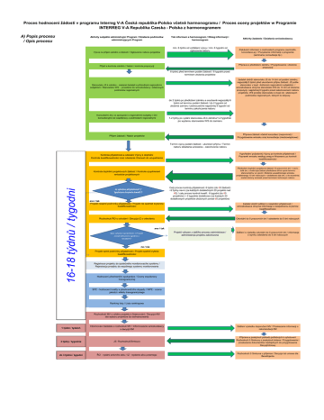 Proces hodnocení žádostí v programu Interreg V-A Česká republika-Polsko včetně harmonogramu / Proces oceny projektów w Programie INTERREG V-A Republika Czeska - Polska z harmonogramem A) Popis procesu / Opis procesu Aktivity subjektů administrující Program / Działania podmiotów administrujących Program Výzva na příjem záměrů a žádostí / Ogłoszenie naboru projektów Tok informací a harmonogram / Obieg informacji i harmonogram min. 6 týdnů od vyhlášení výzvy / min. 6 tygodni od ogłoszenia naboru Aktivity žadatele / Działania wnioskodawcy Získávání informací o možnostech programu (semináře, konzultace,aj.) / Pozyskanie informacji o programie (seminaria, konsultacje itp.) Příprava a předložení záměru / Pryzgotowanie i złożenie propozycji Přijetí a kontrola záměrů / Nabór i kontrola propozycji 8 týdnů před termínem podání žádostí / 8 tygodni przed terminem złożenia projektów žadatel obdrží stanovisko JS do 14 dní od podání záměru, nejpozději 6 týdnů před ukončením příjmu žádostí. JS pošle stanovisko v kopii dotčeným regionálním subjektům / wnioskodawca otrzyma stanowisko WS do 14 dni od złożenie propozycji, najpóźniej 6 tygodni przed zakończeniem naboru projektów. WS prześle stanowisko w kopii do właściwych podmiotów regionalnych, których to dotyczy Stanovisko JS k záměru - zaslané žadateli a příslušným regionálním subjektům / Stanowisko WS - przesłane do wnioskodawcy i właściwych podmiotów regionalnych do 2 týdnů po předložení záměru a současně nejpozději 6 týdnů od termínu podání žádosti / do 2 tygodni od złożenia zamiaru i jednocześnie najpóźniej 6 tygodni od terminu zakończenia naboru Konzultační dny ve spolupráci s regionálními subjekty / Dni konsultacyjne we współpracy z podmiotami regionalnymi 1-2 týdny po vydání stanoviska JS k záměru/ 1-2 tygodnie po wydaniu stanowiska WS do zamiaru Příprava žádosti včetně konzultací (nepovinné) / Przygotowanie wniosku oraz konsultacje (nieobowiązkowe) Příjem žádosti / Nabór projektów 16-18 týdnů / tygodni Termín výzvy podání žádosti - ukončení příjmu / Termin naboru składania wniosków - zakończenie naboru Kontrola přijatelnosti a odeslání Výzvy k doplnění Kontrola kwalifikowalności oraz odesłanie Wezwań do uzupełnienia Vypořádání požadavků Výzvy po kontrole přijatelnosti / Poprawki wniosku według uwag w Wezwaniu po kontroli kwalifikowalności Kontrola doplnění projektových žádostí / Kontrola uzupłnienień wniosków projektowych Předložení doplnění projektové žádosti 10 pracovních dní + navíc tolik dní, o kolik byla žádost předložena dříve oproti termínu stanovenému ve výzvě / Złożenie uzupełnionego wniosku projektowego 10 dni roboczych + dodatkowo tyle dni, o ile wcześniej został złożony wniosek przed terminem końcowym naboru Je splněna přijatelnost? / Spełniono kryteria kwalif.? ne ano / tak Projekt nesplnil podmínky přijatelnosti / Projekt nie spełnieł kryteriów kwalifikowalności Celý proces kontroly přijatelnosti: 6 týdnů (do 60 žádostí) +2 týdny navíc (za každých dodatečných 20 projektů nad 60) / cały proces kontroli kwalif.: 6 tygodni (do 60 projektów) + 2 tygodnie dodatkowo (za każdych 20 dodatkowych projektów złożonych ponad 60 projektów) žadatel obdrží sdělení o nesplnění přijatelnosti / wnioskodawca otrzyma informację o niespełnieniu kryteriów kwalifikowlności Rozhodnutí ŘO o odvolání / Decyzja IZ o odwołaniu Odvolání do 5 pracovních dní / odwołanie do 5 dni roboczych ano / tak Bylo vyřazení oprávněné? / Projekt został odrzucony zgodnie z zasadami? Projekt vyřazen z dalšího procesu administrace / administarcja projektu zakończona Sdělení o výsledku odvolání do 5 pracovních dní / informacja o wyniku odwołania do 5 dni roboczych ne / nie Projekt splnil podmínky přijatelnosti / Projekt spełnił kryteria kwalifikowalności Registrace projektu do společného monitorovacího systému / Rejestracja proejktu do wspólnego systemu monitorowania Hodnocení přeshraniční spolupráce / Oceny współpracy transgranicznej SPE - hodnocení kvality a přeshraničního dopadu / WPE - ocena jakości i efektu transgranicznego Ranking listy / Lista rankingowa Rozhodnutí MV o výběru projektů k financování / Decyzja KM dot.wyboru projektów do dofinansowania 1 týden / tydzień Informování žadatele o rozhodnutí MV / Informowanie wnioskodawcy o decyzji KM Sdělení výsledku doporučení MV / Przekazanie informacji o rekomendacji KM 3 týdny / tygodnie JS -Rozhodnutí/Smlouvy Příprava a poskytnutí pokladů potřebných k vyhotovení Rozhodnutí či Smlouvy o poskytnutí dotace / Przygotowanie i przekazanie dokumentów niezbędnych do przygotowania Decyzji/Umowy do 3 týdnů / tygodni ŘO - vydání právního aktu / IZ - wydanie aktu prawnego Rozhodnutí či Smlouva u příjemce / Decyzja lub umowa dla Beneficjenta