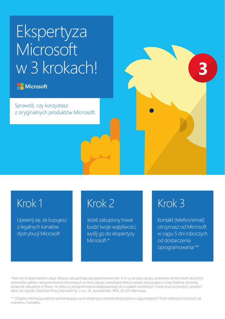 Ekspertyza Microsoft w 3 krokach! 3 Sprawdź, czy korzystasz z oryginalnych produktów Microsoft. Krok 1 Krok 2 Krok 3 Upewnij się, że kupujesz z legalnych kanałów dystrybucji Microsoft Jeżeli zakupiony towar budzi twoje wątpliwości, wyślij go do ekspertyzy Microsoft * Kontakt (telefon/email) otrzymasz od Microsoft w ciągu 5 dni roboczych od dostarczenia oprogramowania ** *Warunki funkcjonowania usługi: dotyczy zakupionego oprogramowania max. 6 m-cy od daty zakupu; przesłanie do Microsoft wszystkich elementów pakietu oprogramowania otrzymanych w chwili zakupu; kserokopia faktury zakupu lub paragonu z kasy fiskalnej; produkty wyłącznie zakupione w Polsce; nie dotyczy oprogramowania dedykowanego do urządzeń określonych marek oraz oczywistych „piratów”. Adres do wysyłki: Dział Anti-Piracy Microsoft Sp. z o.o., Al. Jerozolimskie 195A, 02-222 Warszawa. ** Oficjalna informacja pisemna potwierdzająca wynik ekspertyzy zostanie dostarczona w ciągu kolejnych 10 dni roboczych liczonych od momentu 1 kontaktu.