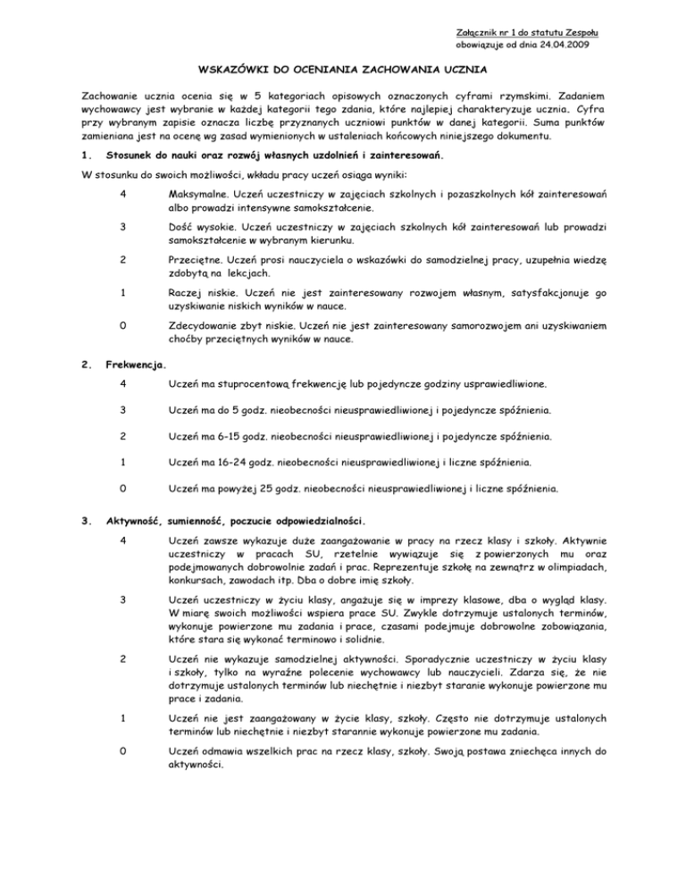 Załącznik nr 1 do statutu Zespołu obowiązuje od dnia 24.04.2009 WSKAZÓWKI DO OCENIANIA ZACHOWANIA UCZNIA Zachowanie ucznia ocenia się w 5 kategoriach opisowych oznaczonych cyframi rzymskimi. Zadaniem wychowawcy jest wybranie w każdej kategorii tego zdania, które najlepiej charakteryzuje ucznia. Cyfra przy wybranym zapisie oznacza liczbę przyznanych uczniowi punktów w danej kategorii. Suma punktów zamieniana jest na ocenę wg zasad wymienionych w ustaleniach końcowych niniejszego dokumentu. 1. Stosunek do nauki oraz rozwój własnych uzdolnień i zainteresowań. W stosunku do swoich możliwości, wkładu pracy uczeń osiąga wyniki: 2. 3. 4 Maksymalne. Uczeń uczestniczy w zajęciach szkolnych i pozaszkolnych kół zainteresowań albo prowadzi intensywne samokształcenie. 3 Dość wysokie. Uczeń uczestniczy w zajęciach szkolnych kół zainteresowań lub prowadzi samokształcenie w wybranym kierunku. 2 Przeciętne. Uczeń prosi nauczyciela o wskazówki do samodzielnej pracy, uzupełnia wiedzę zdobytą na lekcjach. 1 Raczej niskie. Uczeń nie jest zainteresowany rozwojem własnym, satysfakcjonuje go uzyskiwanie niskich wyników w nauce. 0 Zdecydowanie zbyt niskie. Uczeń nie jest zainteresowany samorozwojem ani uzyskiwaniem choćby przeciętnych wyników w nauce. Frekwencja. 4 Uczeń ma stuprocentową frekwencję lub pojedyncze godziny usprawiedliwione. 3 Uczeń ma do 5 godz. nieobecności nieusprawiedliwionej i pojedyncze spóźnienia. 2 Uczeń ma 6-15 godz. nieobecności nieusprawiedliwionej i pojedyncze spóźnienia. 1 Uczeń ma 16-24 godz. nieobecności nieusprawiedliwionej i liczne spóźnienia. 0 Uczeń ma powyżej 25 godz. nieobecności nieusprawiedliwionej i liczne spóźnienia. Aktywność, sumienność, poczucie odpowiedzialności. 4 Uczeń zawsze wykazuje duże zaangażowanie w pracy na rzecz klasy i szkoły. Aktywnie uczestniczy w pracach SU, rzetelnie wywiązuje się z powierzonych mu oraz podejmowanych dobrowolnie zadań i prac. Reprezentuje szkołę na zewnątrz w olimpiadach, konkursach, zawodach itp. Dba o dobre imię szkoły. 3 Uczeń uczestniczy w życiu klasy, angażuje się w imprezy klasowe, dba o wygląd klasy. W miarę swoich możliwości wspiera prace SU. Zwykle dotrzymuje ustalonych terminów, wykonuje powierzone mu zadania i prace, czasami podejmuje dobrowolne zobowiązania, które stara się wykonać terminowo i solidnie. 2 Uczeń nie wykazuje samodzielnej aktywności. Sporadycznie uczestniczy w życiu klasy i szkoły, tylko na wyraźne polecenie wychowawcy lub nauczycieli. Zdarza się, że nie dotrzymuje ustalonych terminów lub niechętnie i niezbyt staranie wykonuje powierzone mu prace i zadania. 1 Uczeń nie jest zaangażowany w życie klasy, szkoły. Często nie dotrzymuje ustalonych terminów lub niechętnie i niezbyt starannie wykonuje powierzone mu zadania. 0 Uczeń odmawia wszelkich prac na rzecz klasy, szkoły. Swoją postawa zniechęca innych do aktywności. 4. 5. Kultura osobista, postawa moralna i społeczna. 4 Uczeń zawsze jest taktowny, prezentuje wysoką kulturę słowa i dyskusji, wykazuje się uczciwością, szanuje godność osobistą a także mienie publiczne i własność prywatną; zawsze dba o swój wygląd zewnętrzny i higienę osobistą. 3 Uczeń jest zwykle taktowny, życzliwie usposobiony, w rozmowach zachowuje kulturę słowa, nie używa wulgaryzmów, zwykle postępuje uczciwie, stara się nie uchybiać godności własnej i innych. Zwykle dba o swój wygląd zewnętrzny i higienę osobistą. 2 Zdarzyło się (1-2 razy), że uczeń zachował się nietaktownie lub nie zapanował nad emocjami, użył mało kulturalnego słowa w rozmowie lub dyskusji. Postąpił niezgodnie z zasadą uczciwości w stosunkach międzyludzkich, uchybił godności własnej lub cudzej. Złamał zapisy statutu dot. ubioru. 1 Uczeń często bywa nietaktowny, używa wulgaryzmów w rozmowach czy dyskusjach, często zwracano mu uwagę nt. niestosowności stroju. Często nie przestrzega zasady uczciwości, narusza godność osobistą własną i innych osób. 0 Uczeń zwykle jest nietaktowny, używa wulgaryzmów, jest agresywny, nie stara się nawet o zachowanie kulturalnych form w rozmowach czy dyskusji. Jego postępowanie jest sprzeczne z zasada uczciwości, nie szanuje godności własnej i innych osób. Nagminnie łamie zapisy statutu dot. ubioru. Postawa wobec nałogów i uzależnień. 4 Nie stwierdzono u ucznia żadnych nałogów czy uzależnień, on sam deklaruje, że jest od nich wolny, swoją postawą zachęca innych do naśladowania. 3 Jeden raz zdarzyło się, że uczeń palił papierosy i sytuacja taka nie powtórzyła się. 2 Kilkakrotnie (2-3 razy) stwierdzono, że uczeń palił lub posiadał papierosy. 1 Stwierdzono, że uczeń często pali papierosy. 0 Stwierdzono, że uczeń nałogowo pali papierosy, spożywał (posiadał) alkohol lub przyjmował (posiadał) narkotyki. USTALENIA KOŃCOWE: 1. Uczeń, który chociaż w jednym przypadku otrzymał 0 punktów nie może mieć oceny wyższej niż POPRAWNA. 2. Uczeń, który w kategorii II i V otrzymał 0 punktów nie może otrzymać oceny wyższej niż NIEODPOWIEDNIA. 3. Uczeń, który otrzymał karę skreślenia z listy uczniów z obligatoryjnym zawieszeniem wykonania kary na rok czasu nie może mieć oceny wyższej niż NAGANNA. 4. Uczeń, który w pierwszym semestrze otrzymał ocenę NAGANNĄ lub NIEODPOWIEDNIĄ nie może otrzymać oceny końcoworocznej WZOROWEJ. 5. W innych przypadkach sumuje się punkty uzyskane w poszczególnych kategoriach (I-V) i stosuje się następującą tabelę przeliczeniową: Łączna liczba punktów 19-20 16-18 13-15 6-12 3-5 0-2 Ocena zachowania WZOROWA BARDZO DOBRA DOBRA POPRAWNA NIEODPOWIEDNIA NAGANNA 6. W przypadku jawnego lekceważenia obowiązku noszenia identyfikatorów, posługiwania się innym identyfikatorem lub celowego niszczenia należy obniżyć uczniowi ocenę z zachowania. 7. W sytuacji, gdy: 1) uczeń wykazał się trwałą zmianą zachowania lu