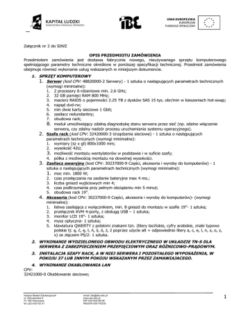 Załącznik nr 2 do SIWZ OPIS PRZEDMIOTU ZAMÓWIENIA Przedmiotem zamówienia jest dostawa fabrycznie nowego, nieużywanego sprzętu komputerowego spełniającego parametry techniczne określone w poniższej specyfikacji technicznej. Przedmiot zamówienia obejmuje również wykonanie usług wskazanych w niniejszym dokumencie. 1. SPRZĘT KOMPUTEROWY 1. Serwer (kod CPV: 48820000-2 Serwery) - 1 sztuka o następujących parametrach technicznych (wymogi minimalne): 1. 2 procesory 6-rdzeniowe min. 2.6 GHz; 2. 32 GB pamięci RAM 800 MHz; 3. macierz RAID5 o pojemności 2.25 TB z dysków SAS 15 tys. obr/min w kieszeniach hot-swap; 4. napęd dvd-rw; 5. min dwie karty sieciowe 1 Gbit; 6. zasilacz redundantny; 7. obudowa rack; 8. moduł umożliwiający zdalną diagnostykę stanu serwera przez sieć (np. zdalne włączenie serwera, czy zdalny nadzór procesu uruchamiania systemu operacyjnego). 2. Szafa rack (kod CPV: 32420000-3 Urządzenia sieciowe) - 1 sztuka o następujących parametrach technicznych (wymogi minimalne): 1. wymiary (sz x gł) 800x1000 mm; 2. wysokość 42U; 3. możliwość montażu wentylatorów w podstawie i w suficie szafy; 4. półka z możliwością montażu na dowolnej wysokości. 3. Zasilacz awaryjny (kod CPV: 30237000-9 Części, akcesoria i wyroby do komputerów) - 1 sztuka o następujących parametrach technicznych (wymogi minimalne): 1. moc min. 1800 W; 2. czas przełączania na zasilanie bateryjne max 4 ms.; 3. liczba gniazd wyjściowych min 4; 4. czas podtrzymania przy pełnym obciążeniu min 5 minut; 5. obudowa rack 19”. 4. Akcesoria (kod CPV: 30237000-9 Części, akcesoria i wyroby do komputerów)- (wymogi minimalne): 1. listwa zasilająca z wyłącznikiem, min. 8 gniazd do montażu w szafie 19”- 1 sztuka; 2. przełącznik KVM 4-porty, z obsługą USB – 1 sztuka; 3. monitor LCD 19”- 1 sztuka; 4. mysz optyczna- 1 sztuka; 5. klawiatura QWERTY z polskimi znakami tzn. (litery łacińskie, cyfry arabskie, znaki typowo polskie tj: ą, ć, ę, ł, ń, ś, ó, ż, ź poprzez użycie alt + odpowiednio litery a, c, e, l, n, s, o, z, x) ze złączem PS/2- 1 sztuka. 2. WYKONANIE WYDZIELONEGO OBWODU ELEKTRYCZNEGO W UKŁADZIE TN-S DLA SERWERA Z ZABEZPIECZENIEM PRZEPIĘCIOWYM ORAZ RÓŻNICOWO-PRĄDOWYM. 3. INSTALACJA SZAFY RACK, A W NIEJ SERWERA I POZOSTAŁEGO WYPOSAŻENIA, W POKOJU 37 LUB INNYM POKOJU WSKAZANYM PRZEZ ZAMAWIAJACEGO. 4. WYKONANIE OKABLOWANIA LAN CPV: 32421000-0 Okablowanie sieciowe; Instytut Badań Edukacyjnych ul. Górczewska 8 01-180 Warszawa tel.:(22) 632-02-21 email: [email protected] www.ibe.edu.pl NIP 525-000-86-95 REGON 000178235 1 32422000-7 Elementy składowe sieci; 32410000-0 Lokalna sieć komputerowa; 72700000-7 Usługi w zakresie sieci komputerowej. 1. Wymagania techniczne: 1. Okablowanie ułożone w rynienkach z miejscem na: kable sieci LAN, kable telefoniczne oraz, w wydzielonej przegrodzie, miejscem dla kabli elektrycznych instalacji 230V (przy czym wykonanie instalacji elektrycznej i telefonicznej nie jest przedmiotem zamówienia); 2. Gniazdka końcowe typu RJ-45, rozmieszczone zgodnie z załącznikiem nr 1 do niniejszego opisu przedmiotu zamówienia. 3. W dniu 17.11.2009r. o godz. 12:00 Zamawiający zaprasza wszystkich chętnych Wykonawców do dokonania wizji lokalnej obiektu w którym wykonywana będzie usługa. 4. Przystosowanie sieci do dołączenia w przyszłości po 2 przełączników, po 48 portów każdy, na parterze i I piętrze (czyli łącznie 4 przełączników, po 2 na każdym piętrze). Przełączniki te będą się znajdować w części budynku oznaczonej na planach jako wynajmowane pomieszczenia. Przystosowanie powinno polegać na: 1. doprowadzeniu rynienek do końców budynku na parterze i I piętrze, zgodnie z załącznikiem nr 1 do niniejszego opisu przedmiotu zamówienia; 2. pozostawienie w zamontowanych urządzeniach aktywnych (i krosownicach) wolnych portów, tak by możliwe było dołączenie opisanych urządzeń (4 przełączników), z zachowaniem warunku h). 5. Sygnał w gniazdkach końcowych zgodny ze standardem Ethernet 100BASE-TX lub 1000BASE-T (standard może się różnić w poszczególnych gniazdkach końcowych). 6. Okablowanie wykonane ze skrętki UTP kategorii 5e zgodnej ze standardem TSB-95 (tzn. tak, by spełniało wymagania sieci Ethernet 1000BASE-T) lub z kabli światłowodowych o takiej liczbie włókien, by w chwili odbioru sieci LAN na każde wykorzystywane włókno przypadało jedno włókno zapasowe. 7. Wszystkie elementy aktywne oraz krosownice w obudowach dostosowanych do montażu w szafach rack, zamontowane w zamykanych na kluczyk szafkach rack. 8. Przed montażem szafek Zamawiający wymaga aby Wykonawca uzyskał zgodę Zamawiającego na montaż szafki w proponowanej przez Wykonawcę lokalizacji. W przypadku gdy Wykonawca zamontuje szafkę bez zgody Zamawiającego, a Zamawiający uzna, że szafka nie może być zainstalowana w miejscu instalacji, Wykonawca jest zobowiązany do zdemontowania i montażu szafki we wskazanej przez Zamawiającego lokalizacji na własny koszt. 9. Obecność krosownicy przed każdym urządzeniem aktywnym multipleksującym sygnał (przełączniki, firewall), w tej samej szafce rack, co urządzenie aktywne. 10. W wypadku instalacji w jednej szafce rack kilku przełączników, mają to być przełączniki stackowalne, połączone ze sobą w stos. 11. Przepustowość każdego połączenia pomiędzy elementami aktywnymi sieci LAN podzielona przez liczbę gniazdek końcowych, z jakich przekazuje ono ruch (liczoną w stronę od gniazdek końcowych do firewalla na styku sieci LAN z internetem), nie może być niższa niż 5 Mb/s; 12. Serwer przyłączony łączem o przepustowości 1 Gb/s bezpośrednio do firewalla na styku sieci LAN z internetem. Serwer będzie znajdował się w pokoju 37 lub w piwnicy,w pomieszczeniu wskazanym w załączniku nr 1 do niniejszego opisu przedmiotu zamówienia. Warunek powinien być spełniony niezależnie od tego, w której z wymienionych lokalizacji
