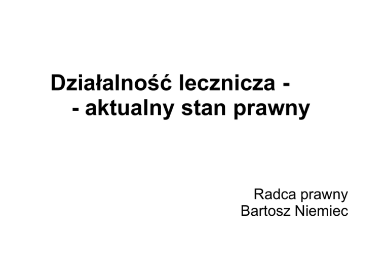 Działalność lecznicza - aktualny stan prawny Radca prawny Bartosz Niemiec Działalność lecznicza zdrowotnych polega na udzielaniu świadczeń Świadczenia zdrowotne to działania służące zachowaniu, ratowaniu, przywracaniu lub poprawie zdrowia oraz inne działania medyczne wynikające z procesu leczenia lub przepisów odrębnych regulujących zasady ich wykonywania. Poza udzielaniem świadczeń zdrowotnych lecznicza może również polegać na: działalność 1) promocji zdrowia lub 2) realizacji zadań dydaktycznych i badawczych w powiązaniu z udzielaniem świadczeń zdrowotnych i promocją zdrowia, w tym wdrażaniem nowych technologii medycznych oraz metod leczenia Zgodnie z komunikatem Ministra Zdrowia z dnia 28 maja 2012r. w sprawie dostosowania działalności podmiotów leczniczych do przepisów ustawy z dnia 15 kwietnia 2011 r. o działalności leczniczej dane przedsiębiorstwo podmiotu leczniczego może prowadzić tylko jeden z rodzajów działalności leczniczej: 1. stacjonarne i całodobowe świadczenia zdrowotne: a) szpitalne, b) inne niż szpitalne; 2. ambulatoryjne świadczenia zdrowotne. Podmioty lecznicze a zakłady opieki zdrowotnej Art. 218 – ilekroć w przepisach odrębnych jest mowa o zakładzie opieki zdrowotnej rozumie się przez to przedsiębiorstwo podmiotu leczniczego Z dniem wejścia w życie ustawy niepubliczne zakłady opieki zdrowotnej stają się przedsiębiorstwami podmiotów leczniczych Publiczne zakłady opieki zdrowotnej działające na podstawie dotychczasowych przepisów podmiotami leczniczymi niebędącymi przedsiębiorcami Od dnia wejścia w życie ustawy nie mogą być tworzone samodzielne publiczne zakłady opieki zdrowotnej. Rodzaje praktyk lekarskich Indywidualna praktyka lekarska (zwana gabinetową) Indywidualna praktyka lekarska wyłącznie w miejscu wezwania, Indywidualna praktyka lekarska wyłącznie w przedsiębiorstwie podmiotu leczniczego na podstawie umowy z tym podmiotem - powyższe praktyki mogą być również zarejestrowane w formie praktyk specjalistycznych grupowa praktyka lekarska która może być prowadzona w formie spółki cywilnej, spółki jawnej albo spółki partnerskiej. Nowe regulacje zniesienie obowiązku wizytacji rejestrowanej praktyki lekarskiej przez właściwą ORL; zniesienie obowiązku przedstawienia przez lekarza ubiegającego się o rejestrację praktyki dokumentu potwierdzającego prawo do dysponowania danym pomieszczeniem; zniesienie obowiązku przedstawienia przez lekarza ubiegającego się o rejestrację praktyki umowy o sterylizację; wyraźne wskazanie obowiązku aktualizacji danych objętych rejestrem w terminie 14 dni od powstania zamian oraz przyznanie organowi prowadzącemu rejestr prawa do nałożenia pieniężnej kary administracyjnej w wysokości do dziesięciokrotności minimalnej pensji w przypadku uchybienia przez lekarza obowiązkowi aktualizacyjnemu; wprowadzenie zasady, w myśl której miejscem wezwania w przypadku indywidualnych praktyk lekarskich wyłącznie w miejscu wezwania nie może być przedsiębiorstwo podmiotu leczniczego - konsekwencja w postaci uniemożliwienia indywidualnym praktykom lekarskim wyłącznie w miejscu wezwania możliwości zawierania umów cywilnoprawnych w ramach których praktyki te stawałyby się podwykonawcami podmiotów leczniczych, w ich imieniu udzielając świadczeń zdrowotnych; nie później niż w terminie 7 dni od zawarcia umowy ubezpieczenia należy przekazać organowi prowadzącemu rejestr dokumentów potwierdzających zawarcie umowy ubezpieczenia wystawione przez ubezpieczyciela; konieczność wyodrębnienia w ramach podmiotu leczniczego przedsiębiorstw i uzyskanie nowych kodów resortowych; obowiązek zgłaszania raz na kwartał przez kierownika podmiotu leczniczego do PIP informacji o liczbie osób, które wykonują zawód medyczny na podstawie umów cywilnoprawnych albo jako praktyka zawodowa, z którą podmiot leczniczy zawarł umowę cywilnoprawną; zakaz świadczenia oraz reklamowania usług pogrzebowych w miejscu udzielania świadczeń zdrowotnych (innego typu działalność może być wykonywana, o ile nie jest uciążliwa dla pacjentów lub przebiegu leczenia) wprowadzenie obowiązku posiadania przez podmiot wykonujący działalność leczniczą regulaminu organizacyjnego; Regulamin organizacyjny firma podmiotu (nazwisko i imię lekarza); cele i zadania podmiotu; rodzaj działalności leczniczej; zakres udzielanych świadczeń zdrowotnych; miejsce udzielania świadczeń zdrowotnych; wysokość opłaty za udostępnianie dokumentacji medycznej określonej w art. 28 ust. 4 ustawy z dnia 6 listopada o prawach Pacjenta i Rzeczniku Praw Pacjenta; organizację procesu udzielania świadczeń zdrowotnych w przypadku pobierania opłat; wysokość opłaty za udzielane świadczenia zdrowotne inne niż finansowane ze środków publicznych. Wymogi odnośnie pomieszczeń Rozporządzenie Ministra Zdrowia z dnia 26 czerwca 2012r. w sprawie szczegółowych wymagań, jakim powinny odpowiadać pomieszczenia i urządzenia podmiotu wykonującego działalność leczniczą (Dz.U. z 2012r. Poz. 739) - do pomieszczeń praktyk lekarskich zastosowanie będą miały głównie § 14, 16, 25, 27, 29, 30, 36, 38 i 39 oraz załącznik nr 2 do rozporządzenia określający szczegółowe wymagania, jakim powinny odpowiadać pomieszczenia i urządzenia ambulatorium. pomieszczenia podmiotu wykonującego działalność leczniczą powinny być zlokalizowane w samodzielnym budynku albo w zespole budynków, a w sytuacji gdy budynek, w którym się mieszczą ma inne przeznaczenie, niż działalność lecznicza – pomieszczenia praktyki powinny być całkowicie wyodrębnione (z wyłączeniem węzłów komunikacji pionowej i poziomej w tym budynku, wspólnych dla wszystkich użytkowników); sytuacja, w której pomieszczenia praktyki zawodowej lokalizowane są w lokalu mieszkalnym jest również dopuszczalna, ale ponownie konieczne jest wyodrębnienie tych pomieszczeń od pom