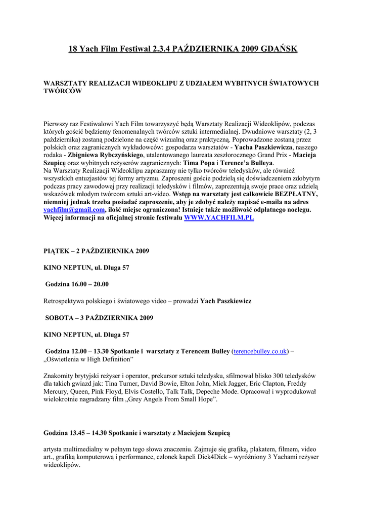18 Yach Film Festiwal 2.3.4 PAŹDZIERNIKA 2009 GDAŃSK WARSZTATY REALIZACJI WIDEOKLIPU Z UDZIAŁEM WYBITNYCH ŚWIATOWYCH TWÓRCÓW Pierwszy raz Festiwalowi Yach Film towarzyszyć będą Warsztaty Realizacji Wideoklipów, podczas których gościć będziemy fenomenalnych twórców sztuki intermedialnej. Dwudniowe warsztaty (2, 3 października) zostaną podzielone na część wizualną oraz praktyczną. Poprowadzone zostaną przez polskich oraz zagranicznych wykładowców: gospodarza warsztatów - Yacha Paszkiewicza, naszego rodaka - Zbigniewa Rybczyńskiego, utalentowanego laureata zeszłorocznego Grand Prix - Macieja Szupicę oraz wybitnych reŜyserów zagranicznych: Tima Popa i Terence’a Bulleya. Na Warsztaty Realizacji Wideoklipu zapraszamy nie tylko twórców teledysków, ale równieŜ wszystkich entuzjastów tej formy artyzmu. Zaproszeni goście podzielą się doświadczeniem zdobytym podczas pracy zawodowej przy realizacji teledysków i filmów, zaprezentują swoje prace oraz udzielą wskazówek młodym twórcom sztuki art-video. Wstęp na warsztaty jest całkowicie BEZPŁATNY, niemniej jednak trzeba posiadać zaproszenie, aby je zdobyć naleŜy napisać e-maila na adres [email protected], ilość miejsc ograniczona! Istnieje takŜe moŜliwość odpłatnego noclegu. Więcej informacji na oficjalnej stronie festiwalu WWW.YACHFILM.PL PIĄTEK – 2 PAŹDZIERNIKA 2009 KINO NEPTUN, ul. Długa 57 Godzina 16.00 – 20.00 Retrospektywa polskiego i światowego video – prowadzi Yach Paszkiewicz SOBOTA – 3 PAŹDZIERNIKA 2009 KINO NEPTUN, ul. Długa 57 Godzina 12.00 – 13.30 Spotkanie i warsztaty z Terencem Bulley (terencebulley.co.uk) – „Oświetlenia w High Definition” Znakomity brytyjski reŜyser i operator, prekursor sztuki teledysku, sfilmował blisko 300 teledysków dla takich gwiazd jak: Tina Turner, David Bowie, Elton John, Mick Jagger, Eric Clapton, Freddy Mercury, Queen, Pink Floyd, Elvis Costello, Talk Talk, Depeche Mode. Opracował i wyprodukował wielokrotnie nagradzany film „Grey Angels From Small Hope”. Godzina 13.45 – 14.30 Spotkanie i warsztaty z Maciejem Szupicą artysta multimedialny w pełnym tego słowa znaczeniu. Zajmuje się grafiką, plakatem, filmem, video art., grafiką komputerową i performance, członek kapeli Dick4Dick – wyróŜniony 3 Yachami reŜyser wideoklipów. Godzina 14.45 – 16.30 Spotkanie i warsztaty z Timem Pope (timpope.tv) – „Artysta kreuje artystę – rola reŜysera wideoklipu w kreacji artysty estradowego” Tim Pope (pochodzący z Anglii) jest niezwykłym człowiekiem, który zaczął kręcić filmy w wieku 9 lat, niedługo potem stał się jednym z najlepszych promotorów/reŜyserów na świecie. Przez wielu nazywany guru. Zrobił ponad 200 klipów – m.in. dla: Davida Bowie, The Cure, Fatboy Slim, Toma Jonesa, Poula McCartneya, Queen, Wham (George Michael), Neila Younga, Iggy Pop; ponadto jest reŜyserem filmów krótkich, takŜe fabularnych („The Crow: City of Angels”), dokumentów, seriali komercyjnych czy komercyjnych reklam. Godzina 16.40 – 20.00 Spotkanie i warsztaty z Zbigniewem Rybczyńskim (zbigvision.com) – „Choroby współczesnego obrazu” Zdobywca pierwszego Oskara dla Polski a takŜe jako pierwszy na świecie otrzymał nagrodę MTV Video Music Awards dla najlepszego reŜysera wideoklipu. Fenomenalny reŜyser filmów eksperymentalnych, operator. Jeden z najbardziej nowatorskich współczesnych filmowców, który dokonał niesamowitej transformacji w świecie gatunku jakim jest animacja. Autor klipów dla m.in. Micka Jaggera, Johna Lennona, Supertramp i Lady Pank. Godzina 21.00 - BENEFIS KORY pokaz najlepszych teledysków oraz występ na Ŝywo Kory i Wiolonczel z Miasta NIEDZIELA – 4 PAŹDZIERNIKA 2009 KINO HELIKON, ul. Długa 57 Suplement do warsztatów Godzina 13.00 – 18.00 – projekcje: 13.00 – Zbigniew Rybczyński „Orkiestra” (60 min.) 14.00 – Tim Pope „ Kruk” (90 min.) 15.30 – Tim Pope „Kompilacja wideoklipów” (35 min.) 16.10 – Terence Bulley „Kompilacja wideoklipów” (40 min.) 16.50 – Yach Paszkiewicz „Koledzy” Maleńczuk, Waglewski (32 min.) 17.20 – Olga „Kora” Jackowska „Kompilacja wideoklipów” (40 min.)