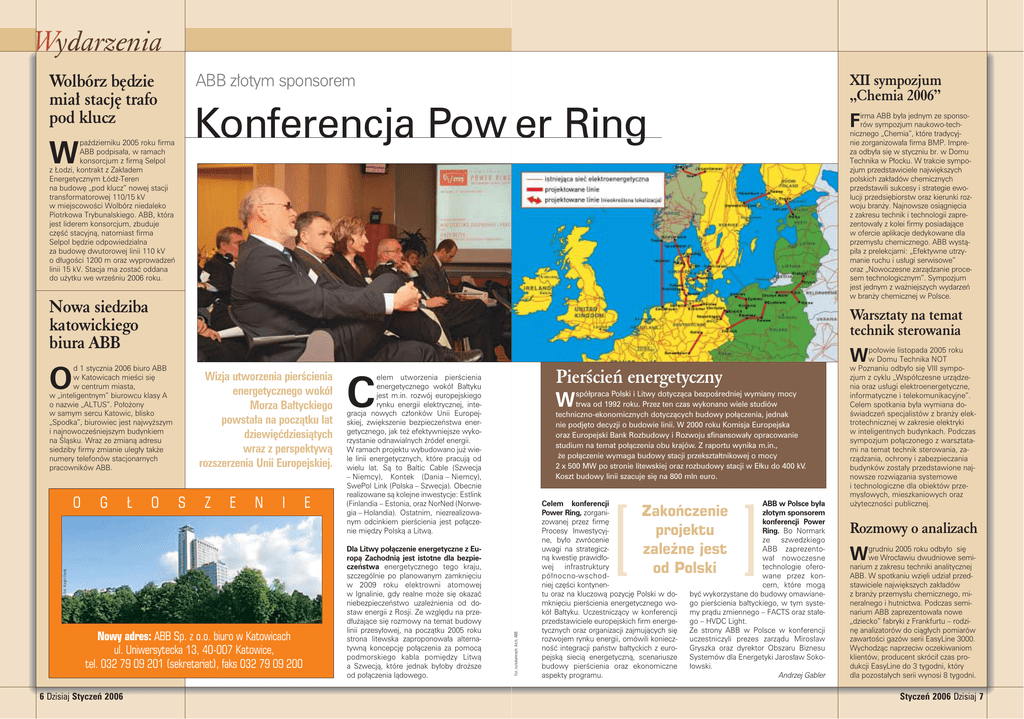 Wydarzenia ABB z∏otym sponsorem Wolbórz b´dzie mia∏ stacj´ trafo pod klucz XII sympozjum „Chemia 2006” Konferencja Pow er Ring paêdzierniku 2005 roku firma ABB podpisa∏a, w ramach konsorcjum z firmà Selpol z ¸odzi, kontrakt z Zak∏adem Energetycznym ¸ódê-Teren na budow´ „pod klucz” nowej stacji transformatorowej 110/15 kV w miejscowoÊci Wolbórz niedaleko Piotrkowa Trybunalskiego. ABB, która jest liderem konsorcjum, zbuduje cz´Êç stacyjnà, natomiast firma Selpol b´dzie odpowiedzialna za budow´ dwutorowej linii 110 kV o d∏ugoÊci 1200 m oraz wyprowadzeƒ linii 15 kV. Stacja ma zostaç oddana do u˝ytku we wrzeÊniu 2006 roku. W irma ABB by∏a jednym ze sponsoF rów sympozjum naukowo-technicznego „Chemia”, które tradycyjnie zorganizowa∏a firma BMP. Impreza odby∏a si´ w styczniu br. w Domu Technika w P∏ocku. W trakcie sympozjum przedstawiciele najwi´kszych polskich zak∏adów chemicznych przedstawili sukcesy i strategie ewolucji przedsi´biorstw oraz kierunki rozwoju bran˝y. Najnowsze osiàgni´cia z zakresu technik i technologii zaprezentowa∏y z kolei firmy posiadajàce w ofercie aplikacje dedykowane dla przemys∏u chemicznego. ABB wystàpi∏a z prelekcjami: „Efektywne utrzymanie ruchu i us∏ugi serwisowe” oraz „Nowoczesne zarzàdzanie procesem technologicznym”. Sympozjum jest jednym z wa˝niejszych wydarzeƒ w bran˝y chemicznej w Polsce. Nowa siedziba katowickiego biura ABB Warsztaty na temat technik sterowania O G ¸ O S Z E N I Fot. Knight Frank O Wizja utworzenia pierÊcienia energetycznego wokó∏ Morza Ba∏tyckiego powsta∏a na poczàtku lat dziewi´çdziesiàtych wraz z perspektywà rozszerzenia Unii Europejskiej. Nowy adres: ABB Sp. z o.o. biuro w Katowicach ul. Uniwersytecka 13, 40-007 Katowice, tel. 032 79 09 201 (sekretariat), faks 032 79 09 200 6 Dzisiaj Styczeƒ 2006 E PierÊcieƒ energetyczny W elem utworzenia pierÊcienia energetycznego wokó∏ Ba∏tyku jest m.in. rozwój europejskiego rynku energii elektrycznej, integracja nowych cz∏onków Unii Europejskiej, zwi´kszenie bezpieczeƒstwa energetycznego, jak te˝ efektywniejsze wykorzystanie odnawialnych êróde∏ energii. W ramach projektu wybudowano ju˝ wiele linii energetycznych, które pracujà od wielu lat. Sà to Baltic Cable (Szwecja – Niemcy), Kontek (Dania – Niemcy), SwePol Link (Polska – Szwecja). Obecnie realizowane sà kolejne inwestycje: Estlink (Finlandia – Estonia, oraz NorNed (Norwegia – Holandia). Ostatnim, niezrealizowanym odcinkiem pierÊcienia jest po∏àczenie mi´dzy Polskà a Litwà. C Dla Litwy połączenie energetyczne z Europą Zachodnią jest istotne dla bezpieczeństwa energetycznego tego kraju, szczególnie po planowanym zamkni´ciu w 2009 roku elektrowni atomowej w Ignalinie, gdy realne mo˝e si´ okazaç niebezpieczeƒstwo uzale˝nienia od dostaw energii z Rosji. Ze wzgl´du na przed∏u˝ajàce si´ rozmowy na temat budowy linii przesy∏owej, na poczàtku 2005 roku strona litewska zaproponowa∏a alternatywnà koncepcj´ po∏àczenia za pomocà podmorskiego kabla pomi´dzy Litwà a Szwecjà, które jednak by∏oby dro˝sze od po∏àczenia làdowego. spółpraca Polski i Litwy dotycząca bezpośredniej wymiany mocy trwa od 1992 roku. Przez ten czas wykonano wiele studiów techniczno-ekonomicznych dotyczących budowy połączenia, jednak nie podjęto decyzji o budowie linii. W 2000 roku Komisja Europejska oraz Europejski Bank Rozbudowy i Rozwoju sfinansowały opracowanie studium na temat połączenia obu krajów. Z raportu wynika m.in., że połączenie wymaga budowy stacji przekształtnikowej o mocy 2 x 500 MW po stronie litewskiej oraz rozbudowy stacji w Ełku do 400 kV. Koszt budowy linii szacuje się na 800 mln euro. Celem konferencji Power Ring, zorganizowanej przez firm´ Procesy Inwestycyjne, by∏o zwrócenie uwagi na strategicznà kwesti´ prawid∏owej infrastruktury pó∏nocno-wschodniej cz´Êci kontynentu oraz na kluczowà pozycj´ Polski w domkni´ciu pierÊcienia energetycznego wokó∏ Ba∏tyku. Uczestniczàcy w konferencji przedstawiciele europejskich firm energetycznych oraz organizacji zajmujàcych si´ rozwojem rynku energii, omówili koniecznoÊç integracji paƒstw ba∏tyckich z europejskà siecià energetycznà, scenariusze budowy pierÊcienia oraz ekonomiczne aspekty programu. ABB w Polsce była złotym sponsorem konferencji Power Ring. Bo Normark ze szwedzkiego ABB zaprezentowa∏ nowoczesne technologie oferowane przez koncern, które mogà byç wykorzystane do budowy omawianego pierÊcienia ba∏tyckiego, w tym systemy pràdu zmiennego – FACTS oraz sta∏ego – HVDC Light. Ze strony ABB w Polsce w konferencji uczestniczyli prezes zarzàdu Miros∏aw Gryszka oraz dyrektor Obszaru Biznesu Systemów dla Energetyki Jaros∏aw Soko∏owski. Andrzej Gabler Zakoƒczenie projektu zale˝ne jest od Polski Fot. na kolumnach: Arch. ABB d 1 stycznia 2006 biuro ABB w Katowicach mieÊci si´ w centrum miasta, w „inteligentnym” biurowcu klasy A o nazwie „ALTUS”. Po∏o˝ony w samym sercu Katowic, blisko „Spodka”, biurowiec jest najwy˝szym i najnowoczeÊniejszym budynkiem na Âlàsku. Wraz ze zmianà adresu siedziby firmy zmianie uleg∏y tak˝e numery telefonów stacjonarnych pracowników ABB. po∏owie listopada 2005 roku W w Domu Technika NOT w Poznaniu odby∏o si´ VIII sympozjum z cyklu „Wspó∏czesne urzàdzenia oraz us∏ugi elektroenergetyczne, informatyczne i telekomunikacyjne”. Celem spotkania by∏a wymiana doÊwiadczeƒ specjalistów z bran˝y elektrotechnicznej w zakresie elektryki w inteligentnych budynkach. Podczas sympozjum po∏àczonego z warsztatami na temat technik sterowania, zarzàdzania, ochrony i zabezpieczania budynków zosta∏y przedstawione najnowsze rozwiàzania systemowe i technologiczne dla obiektów przemys∏owych, mieszkaniowych oraz u˝ytecznoÊci publicznej. Rozmowy o analizach grudniu 2005 roku odby∏o si´ W we Wroc∏awiu dwudniowe semin