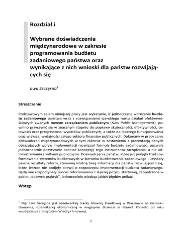 Rozdział i Wybrane doświadczenia międzynarodowe w zakresie programowania budżetu zadaniowego paostwa oraz wynikające z nich wnioski dla paostw rozwijających się Ewa Szczęsna1 Streszczenie Podstawowym celem niniejszej pracy jest wykazanie, iż jednoczesne wdrożenie budżetu zadaniowego paostwa wraz z rozwiązaniami szerokiego nurtu działao efektywnościowych zwanych nowym zarządzaniem publicznym (New Public Management), powinno przyczynid się w znacznym stopniu do poprawy skuteczności, efektywności, celowości oraz przejrzystości wydatków publicznych, a także do lepszego funkcjonowania oraz większej wydajności całego sektora finansów publicznych. Dokonany w pracy zarys doświadczeo międzynarodowych w tym zakresie w zestawieniu z prezentacją danych obrazujących wpływ implementacji rozwiązao formuły budżetu zadaniowego, pozwala jednoznacznie pozytywnie oceniad koncepcję tego instrumentu zarządzania, a nie administrowania środkami publicznymi. Doświadczenia paostw, które już podjęły trud zreformowania systemów budżetowych w kierunku budżetowania zadaniowego i uzyskały pewne rezultaty reform, stanowią istotną bazę informacji dla paostw rozwijających się, które jeszcze nie podjęły decyzji o rozpoczęciu implementacji budzetu zadaniowego. Będą one rozpoczynały proces reformowania z lepszej pozycji startowej, zaopatrzone w pakiet „dobrych praktyk”, jednocześnie wiedząc jakich błędów unikad. Wstęp 1 Mgr Ewa Szczęsna jest absolwentką Szkoły Głównej Handlowej w Warszawie na kierunku Ekonomia, dziennikarką ekonomiczną w magazynie Business in Poland. Ponadto od roku współpracuje z Instytutem Wiedzy i Innowacji. 1 Wybrane doświadczenia międzynarodowe w zakresie programowania budżetu zadaniowe2 go paostwa oraz wynikające z nich wnioski dla paostw rozwijających się Wysokorozwinięte paostwa świata już od dziesięcioleci szukają metod lepszego zarządzania pieniędzmi publicznymi. Prekursorem podejmowania reform ukierunkowanych na zwiększenie racjonalności wydatkowanych środków publicznych przez wprowadzanie metod programowania budżetowego opartego na zarządzaniu przez rezultaty były Stany Zjednoczone w koocu lat 40. XX wieku. W ślad za nimi również inne kraje wysokorozwinięte zaczęły stopniowo modernizowad zarządzanie sektorem finansów publicznych, wprowadzając nowoczesne metody budżetowania. Nowe zarządzanie wydatkami budżetowymi jest wyzwaniem stojącym przed wieloma paostwami rozwijającymi się, a zwłaszcza krajami Europy ŚrodkowoWschodniej, w tym również Polski. Wydatkowa storna budżetu staje się niezwykle ważnym narzędziem polityki społeczno-gospodarczej w zintegrowanej Unii Europejskiej. Ramy wspólnej polityki fiskalnej w zakresie deficytu budżetowego, długu publicznego oraz podatków, które podlegają harmonizacji, w pewnym stopniu zawężają instrumentarium polityki fiskalnej od strony dochodowej budżetu. Dlatego coraz większe znaczenie zaczynają ogrywad wydatki publiczne i właściwe zarządzanie nimi. Budżet zadaniowy bądź jego zasadnicze elementy odnaleźd można w systemach finansów publicznych już przeszło pięddziesięciu paostw, m.in. Nowej Zelandii, Stanów Zjednoczonych, Wielkiej Brytanii, Australii, Kanady, Francji, Słowacji, Włoch, Szwecji, Turcji, Meksyku, Chile, Belgii, Holandii, Danii, Litwy, Łotwy, Estonii, Hiszpanii, Islandii, Indii, Japonii, Norwegii, Republiki Południowej Afryki, Rosji, Niemiec, Chorwacji, Rumunii, Bułgarii, Polski2. Częśd z tych paostw wykorzystuje budżet zadaniowy jako kompleksowe rozwiązanie całkowicie zastępujące dotychczasowy model budżetu, inne zaś implementują jedynie elementy programowania zadaniowego, jako narzędzie uzupełniające do budżetu tradycyjnego. Reformy w zakresie wdrażania budżetu zadaniowego w poszczególnych paostwach miały i nadal mają swoją specyfikę przez wzgląd na różnorodnośd systemów oraz uwarunkowao polityczno-ekonomicznych. Można jednak zauważyd pewną wspólną cechę reform budżetowych wszystkich paostw – 2 Na podstawie: Current issues in fiscal reform in Central Europe and the Baltic States 2008. Performance-based budgeting and medium term expenditure frameworks in Emerging Europe, The World Bank, (nieopublikowany dotąd raport Banku Światowego), s. 80-165 oraz Perczyoski P., Postuła M., Budżet zadaniowy – wprowadzenie; znaczenie wieloletniego planowania strategicznego w procesie budżetowania , [w:] Budżet zadaniowy w administracji publicznej, red. Perczyoski P., Postuła M., Publikacja Ministerstwa Finansów i Fundacji Europejski Instytut Administracji Publicznej, Warszawa 2008, s. 25 oraz Stieger K., Elementy budżetowania zadaniowego w Niemczech, [w:] Nowe zarządzanie publiczne – skutecznośd i efektywnośd. Budżet zadaniowy w Polsce, red. Lubioska T., Difin, Warszawa 2009, s. 402-408. Ewa Szczęsna 3 wprowadzenie bardziej lub mniej rozbudowanego zarządzania nastawionego na rezultaty. i.1. Wybrane aspekty programowania zadaniowego w Stanach Zjednoczonych na szczeblu federalnym Proces budżetowania zadaniowego funkcjonujący w Stanach Zjednoczonych, które były pionierem w zakresie udoskonalania procesów planowania i programowania budżetowego, jest niezwykle skomplikowany oraz różni się on znacząco od tych występujących w innych krajach, co w pewnym stopniu wynika z konstytucyjnego, wyraźnego trójpodziału władzy w ustroju tego paostwa już od początków jego istnienia3. Koncepcja budżetowania zadaniowego w USA podlegała częstym zmianom, jednakże kolejno podejmowane wysiłki w tym zakresie wyraźnie kształtowały kulturę myślenia zarządczego o finansach publicznych4. Najważniejszymi inicjatywami w tym zakresie były: 1. metoda analizy rezultatów budżetowania (Performance Budgeting5) wprowadzona w 1949 r.; 2. system planowania i programowania budżetowego (Planning – Programming – Budgeting System) wdrożony w 1965 r.; 3. metoda zarzą