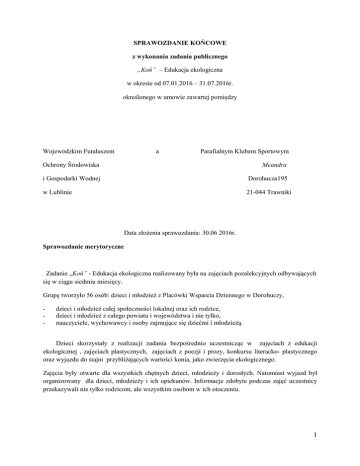 SPRAWOZDANIE KOŃCOWE z wykonania zadania publicznego „Koń” – Edukacja ekologiczna w okresie od 07.01.2016 – 31.07.2016r. określonego w umowie zawartej pomiędzy Wojewódzkim Funduszem a Parafialnym Klubem Sportowym Ochrony Środowiska Meandra i Gospodarki Wodnej Dorohucza195 w Lublinie 21-044 Trawniki Data złożenia sprawozdania: 30.06 2016r. Sprawozdanie merytoryczne Zadanie „Koń” - Edukacja ekologiczna realizowany była na zajęciach pozalekcyjnych odbywających się w ciągu siedmiu miesięcy. Grupę tworzyło 56 osób: dzieci i młodzież z Placówki Wsparcia Dziennego w Dorohuczy, - dzieci i młodzież całej społeczności lokalnej oraz ich rodzice, dzieci i młodzież z całego powiatu i województwa i nie tylko, nauczyciele, wychowawcy i osoby zajmujące się dziećmi i młodzieżą. Dzieci skorzystały z realizacji zadania bezpośrednio uczestnicząc w zajęciach z edukacji ekologicznej , zajęciach plastycznych, zajęciach z poezji i prozy, konkursu literacko- plastycznego oraz wyjazdu do stajni przybliżających wartości konia, jako zwierzęcia ekologicznego. Zajęcia były otwarte dla wszystkich chętnych dzieci, młodzieży i dorosłych. Natomiast wyjazd był organizowany dla dzieci, młodzieży i ich opiekunów. Informacje zdobyte podczas zajęć uczestnicy przekazywali nie tylko rodzicom, ale wszystkim osobom w ich otoczeniu. 1 Zajęcia z edukacji ekologicznej. Trwały przez cały okres realizacji zadania odbywały się raz w tygodniu : 29 spotkań po 90 minut. Uczestnicy poznali rodzaje koni, ich rolę w życiu człowieka, dowiedzieli się do czego służył koń kiedyś i dzisiaj, poznali dzisiejsze aspekty ekologiczne wykorzystania konia. Zajęcia podniosły świadomość ekologiczną uczestników, zapoznały z rodzajami koni, przedstawiły rolę konia w różnych aspektach życia człowieka, skierowały uwagę na zalety koni jako zwierząt przyczyniających się do ekologicznych postaw w życiu codziennym, wypracowały odpowiedni stosunek do koni. Tematy zajęć: 1. 2. 3. 4. 5. 6. 7. 8. 9. 10. 11. 12. 13. 14. 15. 16. 17. 18. 19. 20. 21. 22. 23. 24. 25. 26. 27. 28. 29. 30. Pochodzenie konia Udomowienie konia Rodzina koniowatych: koń, półosioł ,osioł, zebra Rasy koni/ typy Rola konia w życiu człowieka Rola konia dawniej Rola konia dziś Jak należy zachować się w kontakcie z koniem? Gdzie mieszka koń Na czym polega praca w stajni Jaki sprzęt używany jest do jazdy konnej Hipoterapia zajęcia z końmi Uzębienie konia Choroby konia Koń jako hobby Cierpienie koni Fundacja Ratujcie Konia Żywienie koni Końskie dźwięki Końskie cytaty Końskie przysłowia Koń i osioł w filmie Shrek1 Jak należy zachować się w kontakcie z koniem Tresura konia Koń w wojsku i policji. Koń, który pracuje w cyrku. Koń, który pozuje do zdjęcia. Jak koń może zostać aktorem Budowa konia Koń na emeryturze Zajęcia z poezji i prozy. Zajęcia prowadzone były raz na dwa tygodnie: 14 spotkań po 90 minut. Uczestnicy sami szukali odpowiednich utworów , prezentowali je i omawiali na zajęciach. Zajęcia prowadzone były przez wolontariusza. Na pierwszych zajęciach otworzyliśmy nasza bibliotekę , która znajduje się w oszklonej szafie w celu odszukania książek o koniach. Oglądaliśmy różne książki, gazety, czasopisma dzieliliśmy się swoimi spostrzeżeniami. Na szafce zorganizowaliśmy Kącik książek o koniach i kącik zabawek przedstawiających konia . 2 Uczestnicy na każde zajęcia przygotowywali utwory o koniu z poezji lub prozy. Przygotowany utwór w całości lub w części prezentowali publicznie uwzględniając indywidualną interpretację artystyczną, w formie czytanej, recytowanej lub inscenizacji grupowej. Uczestnicy uczyli się analizować i interpretować utwory, bawić się słowem, odczytywać utracone i indywidualne sensy. Przekonali się, że tekst nie musi być nudny i stały, ale może być porywający, poruszający i dla każdego inny. Pobawiły się aktorsko – spróbowały przedstawić na scenie fragmenty wybranych utworów, wcielali się w rolę krytyków filmowych i literackich, piosenkarzy, dziennikarzy i fotografików. Następnie pod okiem nauczyciela przeprowadzana była dyskusja pod kątem roli i wpływu konia na życie człowieka i zachowania ekologiczne. Analizowaliśmy następujące teksty: − − − − − − − − − − − − Konik na biegunach- Urszula Konie , konie – Stanisław Grochowiak Pławienie koni 4- Jarosław Iwaszkiewicz Pławienie koni 5 – Jarosław Iwaszkiewicz Kon –Bolesław Leśmian Psalm o kasztanku-Tadeusz Nowa My konie – Maria Pawlikowska –Jasnorzewska Mój koń – Igor Sikirycki Mój przyjaciel koń – Franciszek Święcki Konie i furman – Ignacy Krasicki Jak stąpić w ciągu , jak być w zaprzęgu - Ignacy Krasicki Koń na receptę – Agata widzowska-Pasiak / str.1-20 Poznanie Jagódki i jej problemów rodzinnych/ /str.21-40 Szogun i dzieci niepełnosprawne/ /str. 40-60 bezinteresowna pomoc czy się opłaca?/ /str.60-80 O tym ,że w jedności tkwi siła!/ Zajęcia plastyczne. Zajęcia odbywały się co tydzień po 2 godziny przez cały okres trwania zadania. Zespół plastyczny skupiał w większości uczniów o uzdolnieniach przeciętnych. Jego celem było zintegrowanie uczniów pochodzących z różnych poziomów klas, skupienie ich wokół zadania, które pozwoliłoby im na samorealizację, rozwój indywidualnych zainteresowań, wykonanie dodatkowej (poza obowiązkami szkolnymi) pracy, odpowiadającej ich zdolnościom i możliwościom, pracy sprzyjającej swobodnemu rozwojowi ich talentów. Udział w projekcie opierał się na chęci ich dobrowolnego udziału w zadaniu, zgodnie z ich predyspozycjami. Zajęcia były propozycją interdyscyplinarnego nauczania sztuki, plastyki, techniki i przedmiotów przyrodniczo - ekologicznych, które w połączeniu z metodami aktywizującymi, wpływały na rozwój intelektualny i działania praktyczne uczniów , rozwijały zdaln