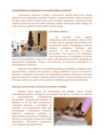 Czekoladowa fontanna na wesele! Jaką wybrać? Czekoladowe fontanny to jedna z ciekawszych atrakcji, która coraz częściej pojawia się na przyjęciach weselnych. Planując wynajęcie fontanny trzeba zastanowić się jaką opcję wybrać. Wśród wielu ofert wynajmu znajdziemy urządzenia różnej wielkości, proponuje się różne ilości czekolady, znaleźć można opcje z/bez obsługi, jest wiele innych szczegółów na które trzeba zwrócić uwagę. Jak dobrze wybrać? Na początek warto zapytać usługodawcę, jakie urządzenie oferuje. Dwie wiodące firmy to angielska Giles & Posner oraz amerykańska Sephra. Wynajmując markowe fontanny czekoladowe będziemy mieć pewność, że nie zawiodą w trakcie uroczystości. Nie znaczy to, że urządzenia innych producentów nie zadziałają - po prostu zazwyczaj są głośniejsze, trzęsą się, często czekolada płynie nierówno, pojawiają się nieapetycznie wyglądające "dziury", niewykluczone, że odmówią posłuszeństwa w najważniejszym momencie. Kiedy już zdecydujemy się na konkretną fontannę czekoladową (najlepiej jeszcze poprosić firmę o zdjęcia) warto zapytać o usługi dodatkowe. Często w zestawach z fontanną i czekoladą wypożyczane są: podświetlane podesty, jednorazowe akcesoria (patyczki, talerzyki, serwetki), salaterki, pucharki. Bardzo ważnym dodatkiem jest stół. Warto go wypożyczyć, gdyż zazwyczaj jest on wielkością dopasowany do fontanny. Dlaczego warto wynająć czekoladową fontannę z obsługą? Kolejną ważną sprawą do przemyślenia jest obsługa. Warto wynająć czekoladową fontannę z obsługą, by nie zaprzątać sobie głowy wszystkim, co wiąże się z przygotowaniem czekoladowego poczęstunku . Przygotowanie fontanny do działania, to nie jest tylko przysłowiowe „włączenie guziczka i świecidełek na podeście”. To przygotowanie stołu, jego przystrojenie, rozstawienie fontanny, podestów, roztopienie czekolady do odpowiedniej konsystencji. Czekolada nie lubi zbyt wysokiej, jak również zbyt niskiej temperatury. Niewłaściwa temperatura może wpłynąć na jej smak i kolor. 1 Tylko doświadczona obsługa dopilnuje szczegółów z tym związanych, ponadto zadba o prawidłowe działanie fontanny, o czystość otoczenia, by podesty nie były ubrudzone czekoladą, by salaterki były na bieżąco napełniane przekąskami. Pomoże dzieciom, osobom starszym i "niewtajemniczonym" w przygotowaniu przekąsek oblanych czekoladą. Decydując się na wypożyczenie czekoladowej fontanny napewno nie warto oszczędzać na obsłudze. Ceny usług są różne - wahają się od 150zł do nawet 2000zł. Atrakcyjne oferty i terminy są rezerwowane z rocznym wyprzedzeniem. Życzymy dobrego wyboru i smacznego. Grzegorz Wojcik, www.czekoladowafontanna.org Kopiowanie i rozpowszechnianie treści artykułu w całości lub we fragmentach jest dozwolone pod warunkiem umieszczenia informacji dotyczącej źródła pochodzenia: www.czekoladowafontanna.org 2