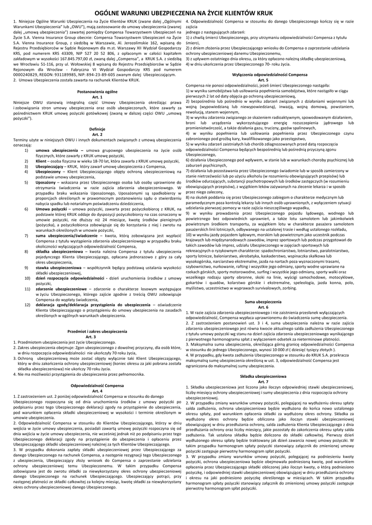 OGÓLNE WARUNKI UBEZPIECZENIA NA ŻYCIE KLIENTÓW KRUK 1. Niniejsze Ogólne Warunki Ubezpieczenia na Życie Klientów KRUK (zwane dalej „Ogólnymi Warunkami Ubezpieczenia” lub „OWU”), mają zastosowanie do umowy ubezpieczenia (zwanej dalej „umową ubezpieczenia”) zawartej pomiędzy Compensa Towarzystwem Ubezpieczeń na Życie S.A. Vienna Insurance Group obecnie: Compensa Towarzystwem Ubezpieczeń na Życie S.A. Vienna Insurance Group, z siedzibą w Warszawie, Al. Jerozolimskie 162, wpisaną do Rejestru Przedsiębiorców w Sądzie Rejonowym dla m.st. Warszawy XII Wydział Gospodarczy KRS, pod numerem KRS 43309, NIP 527 20 52 806, z opłaconym w całości kapitałem zakładowym w wysokości 167.845.797,00 zł, zwaną dalej „Compensa”, a KRUK S.A. z siedzibą we Wrocławiu 51-116, przy ul. Wołowskiej 8 wpisaną do Rejestru Przedsiębiorców w Sądzie Rejonowym dla Wrocław - Fabryczna VI Wydział Gospodarczy KRS pod numerem 0000240829, REGON: 931189985, NIP: 894-23-89-605 zwanym dalej Ubezpieczającym. 2. Umowa Ubezpieczenia została zawarta na rachunek Klientów KRUK. 4. Odpowiedzialność Compensa w stosunku do danego Ubezpieczonego kończy się w razie zajścia jednego z następujących zdarzeń: 1) z chwilą śmierci Ubezpieczonego, przy utrzymaniu odpowiedzialności Compensa z tytułu śmierci, 2) z dniem złożenia przez Ubezpieczającego wniosku do Compensa o zaprzestanie udzielania ochrony ubezpieczeniowej danemu Ubezpieczonemu, 3) z upływem ostatniego dnia okresu, za który opłacono należną składkę ubezpieczeniową, 4) w dniu ukończenia przez Ubezpieczonego 70- roku życia. Wyłączenia odpowiedzialności Compensa Art. 5 Compensa nie ponosi odpowiedzialności, jeżeli śmierć Ubezpieczonego nastąpiła: 1) w wyniku samobójstwa lub usiłowania popełnienia samobójstwa, które nastąpiło w ciągu Postanowienia ogólne pierwszych 2 lat od daty objęcia go ochroną ubezpieczeniową, Art. 1 Niniejsze OWU stanowią integralną część Umowy Ubezpieczenia określając prawa 2) bezpośrednio lub pośrednio w wyniku zdarzeń związanych z działaniami wojennymi lub i zobowiązania stron umowy ubezpieczenia oraz osób ubezpieczonych, które zawarły za wojną (wypowiedzianą lub niewypowiedzianą), inwazją, wojną domową, powstaniem, pośrednictwem KRUK umowę pożyczki gotówkowej (zwaną w dalszej części OWU „umową rewolucją, stanem wojennym, 3) w wyniku zdarzenia związanego ze skażeniem radioaktywnym, spowodowanym działaniem, pożyczki”). broni lub urządzenia wykorzystującego energię rozszczepienia jądrowego lub promieniotwórczość, a także działania gazu, trucizny, gazów spalinowych, Definicje 4) w wyniku popełnienia lub usiłowania popełnienia przez Ubezpieczonego czynu Art. 2 Terminy użyte w niniejszych OWU i innych dokumentach związanych z umową ubezpieczenia zabronionego pod groźbą kary, kwalifikowanego jako przestępstwo, 5) w wyniku zdarzeń zaistniałych lub chorób zdiagnozowanych przed datą rozpoczęcia oznaczają: 1) umowa ubezpieczenia – umowa grupowego ubezpieczenia na życie osób odpowiedzialności Compensa będących bezpośrednią lub pośrednią przyczyną zgonu Ubezpieczonego, fizycznych, które zawarły z KRUK umowę pożyczki, 2) Klient – osoba fizyczna w wieku 18-70 lat, która zawarła z KRUK umowę pożyczki, 6) działania Ubezpieczonego pod wpływem, w stanie lub w warunkach choroby psychicznej lub zaburzeń psychicznych, 3) Ubezpieczający – KRUK, który zawarł umowę ubezpieczenia z Compensa, 4) Ubezpieczony – Klient Ubezpieczającego objęty ochroną ubezpieczeniową na 7) działania lub pozostawania przez Ubezpieczonego świadomie lub w sposób zamierzony w stanie nietrzeźwości lub po użyciu alkoholu (w rozumieniu obowiązujących przepisów) lub podstawie umowy ubezpieczenia, 5) Uposażony – wskazana przez Ubezpieczonego osoba lub osoby uprawnione do środków odurzających, substancji psychotropowych lub środków zastępczych (w rozumieniu otrzymania świadczenia w razie zajścia zdarzenia ubezpieczeniowego. W obowiązujących przepisów), z wyjątkiem leków zażywanych na zlecenie lekarza i w sposób przypadku braku wskazania Uposażonego, Uposażonymi są spadkobiercy w przez niego zalecony, proporcjach określonych w prawomocnym postanowieniu sądu o stwierdzeniu 8) na skutek poddania się przez Ubezpieczonego zabiegom o charakterze medycznym lub paramedycznym poza kontrolą lekarzy lub innych osób uprawnionych, z wyłączeniem sytuacji nabycia spadku lub notarialnym poświadczeniu dziedziczenia, 6) Umowa pożyczki – umowa pożyczki, zawarta przez pożyczkobiorcę z KRUK, na udzielania pierwszej pomocy w razie zajścia nieszczęśliwego wypadku, podstawie której KRUK oddaje do dyspozycji pożyczkobiorcy na czas oznaczony w 9) w wyniku prowadzenia przez Ubezpieczonego pojazdu lądowego, wodnego lub umowie pożyczki, nie dłuższy niż 24 miesiące, kwotę środków pieniężnych powietrznego bez odpowiednich uprawnień, a także lotu samolotem lub jakimkolwiek (pożyczka), a pożyczkobiorca zobowiązuje się do korzystania z niej i zwrotu na powietrznym środkiem transportu, za wyjątkiem lotu w charakterze pasażera samolotem pasażerskich linii lotniczych, odbywanego na ustalonej trasie i według ustalonego rozkładu, warunkach określonych w umowie pożyczki, 7) suma ubezpieczenia/świadczenie – kwota, którą zobowiązana jest wypłacić 10) w wyniku jazdy pojazdem lądowym, morskim lub powietrznym jako uczestnik podczas Compensa z tytułu wystąpienia zdarzenia ubezpieczeniowego w przypadku braku krajowych lub międzynarodowych zawodów, imprez sportowych lub podczas przygotowań do takich zawodów lub imprez, udziału Ubezpieczonego w zajęciach sportowych lub okoliczności wyłączających odpowiedzialność Compensa, 8) składka ubezpieczeniowa – kwota należna Compensa z tytułu ubezpieczenia rekreacyjnych o ryzykownym charakterze: spadochroniarstwo, lotniarstwo, pa