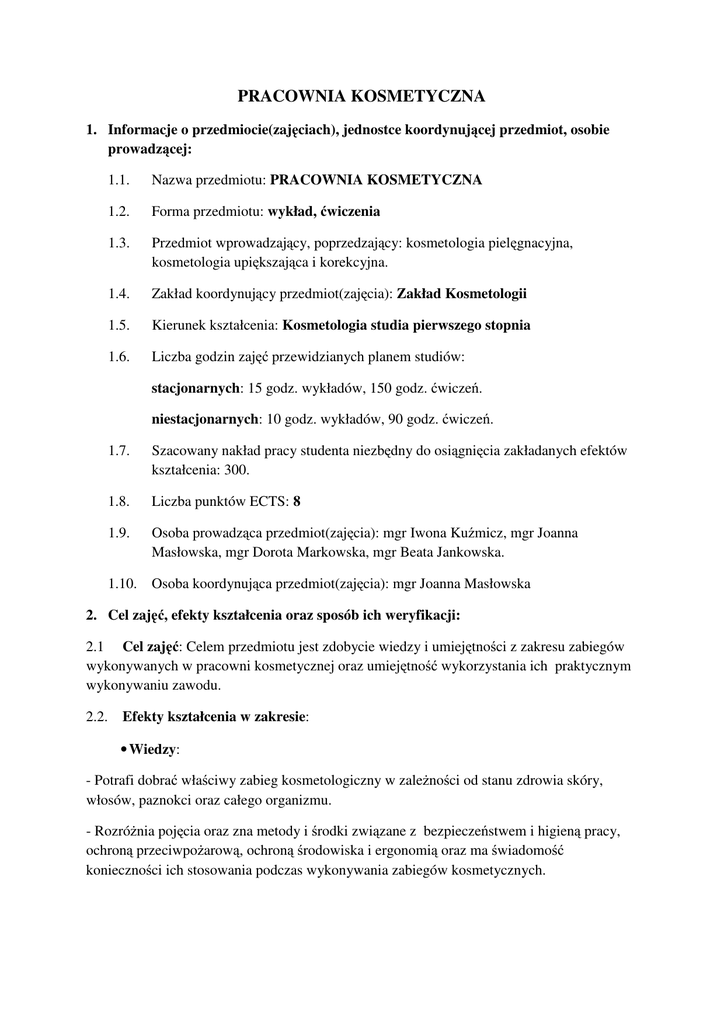 PRACOWNIA KOSMETYCZNA 1. Informacje o przedmiocie(zajęciach), jednostce koordynującej przedmiot, osobie prowadzącej: 1.1. Nazwa przedmiotu: PRACOWNIA KOSMETYCZNA 1.2. Forma przedmiotu: wykład, ćwiczenia 1.3. Przedmiot wprowadzający, poprzedzający: kosmetologia pielęgnacyjna, kosmetologia upiększająca i korekcyjna. 1.4. Zakład koordynujący przedmiot(zajęcia): Zakład Kosmetologii 1.5. Kierunek kształcenia: Kosmetologia studia pierwszego stopnia 1.6. Liczba godzin zajęć przewidzianych planem studiów: stacjonarnych: 15 godz. wykładów, 150 godz. ćwiczeń. niestacjonarnych: 10 godz. wykładów, 90 godz. ćwiczeń. 1.7. Szacowany nakład pracy studenta niezbędny do osiągnięcia zakładanych efektów kształcenia: 300. 1.8. Liczba punktów ECTS: 8 1.9. Osoba prowadząca przedmiot(zajęcia): mgr Iwona Kuźmicz, mgr Joanna Masłowska, mgr Dorota Markowska, mgr Beata Jankowska. 1.10. Osoba koordynująca przedmiot(zajęcia): mgr Joanna Masłowska 2. Cel zajęć, efekty kształcenia oraz sposób ich weryfikacji: 2.1 Cel zajęć: Celem przedmiotu jest zdobycie wiedzy i umiejętności z zakresu zabiegów wykonywanych w pracowni kosmetycznej oraz umiejętność wykorzystania ich praktycznym wykonywaniu zawodu. 2.2. Efekty kształcenia w zakresie: • Wiedzy: - Potrafi dobrać właściwy zabieg kosmetologiczny w zależności od stanu zdrowia skóry, włosów, paznokci oraz całego organizmu. - Rozróżnia pojęcia oraz zna metody i środki związane z bezpieczeństwem i higieną pracy, ochroną przeciwpożarową, ochroną środowiska i ergonomią oraz ma świadomość konieczności ich stosowania podczas wykonywania zabiegów kosmetycznych. - Wymienia wskazania i przeciwwskazania do wykonywania poszczególnych zabiegów pielęgnacyjnych i kosmetycznych i leczniczych oraz wymienia i charakteryzuje metody odnowy biologicznej -Dobiera aparaturę, narzędzia i przybory oraz preparaty do wykonywania określonych zabiegów pielęgnacyjnych i kosmetycznych. - Wymienia i analizuje ograniczenia do wykonania zabiegów głębokiego złuszczania naskórka. - Posiada podstawową wiedzę z zakresu stosowania zabiegów światłolecznictwa, termoterapii i terapii prądami w kosmetologii z uwzględnieniem wskazań i przeciwwskazań. - Charakteryzuje działanie ultradźwięków na organizm ludzki oraz potrafi zastosować ultradźwięki w zabiegach pielęgnacyjnych na twarz i ciało z uwzględnieniem wskazań i przeciwwskazań. • Umiejętności: - Potrafi poprawnie wykonać zabieg kosmetyczny pielęgnacyjny i fizykalne na ciało i twarz z uwzględnieniem wskazań i przeciwwskazań. - Potrafi poprawnie wykonać zabieg kosmetyczny upiększający i korekcyjny z uwzględnieniem wskazań i przeciwwskazań. - Potrafi poprawnie wykonać zabiegi na twarz i ciało z zastosowaniem prawidłowo dobranych kosmetyków i dostępnych urządzeń z uwzględnieniem wskazań i przeciwwskazań w sytuacjach typowych i nietypowych. - Potrafi prawidłowo ustalić potrzeby skóry twarzy ciała z wykorzystaniem dostępnych urządzeń i aparatów. - Realizuje zadania zawodowe stosując zasady BHP - Potrafi w jasny dla klienta sposób przedstawić propozycje zabiegu oraz celowości jego wykonania. - Potrafi uzasadnić celowość kontynuacji zabiegów pielęgnacyjnych, upiększających i korekcyjnych, dobranych do potrzeb w danej chwili oraz prawidłowej pielęgnacji w warunkach domowych. - Potrafi ocenić stan cery oraz stan skóry ciała. - Posiada umiejętność oceny stanu skóry i identyfikacji czynników, które mogą wywoływać alergie - Potrafi udzielić porad z zakresu prawidłowego stylu życia, diety, doboru kosmetyków i rodzaju pielęgnacji. - Potrafi ocenić stan i rodzaj skóry oraz zaplanować jej pielęgnację w gabinecie i w domu przy pomocą urządzeń i posiadanej wiedzy. - Potrafi zdiagnozować przeciwwskazania do zabiegów w gabinecie kosmetycznym. - Potrafi współpracować z lekarzem i uwzględnić zalecenia lekarza przy doborze prawidłowego zabiegu pielęgnacyjnego, korekcyjnego, upiększającego oraz rozpoznać bezwzględne wskazanie do konsultacji lekarza-specjalisty. - Potrafi zidentyfikować błędy i zaniedbania w praktyce kosmetycznej i pielęgnacyjnej, upiększającej, korekcyjnej. - Potrafi dobrać właściwy i najlepszy sposób pielęgnacji gabinetowej oraz domowej z uwzględnieniem wskazań i przeciwwskazań do zabiegów. - Potrafi sporządzać i stosować preparaty niezbędne do wykonywania zabiegów kosmetycznych - Posiada umiejętność obsługiwania aparatów i urządzeń stosowanych w kosmetyce. - Potrafi wyjaśnić klientce celowości wykonywanych zabiegów. • Kompetencji społecznych: - Potrafi krytycznie analizować jakość i efekty wykonywanych zabiegów pielęgnacyjnych - Potrafi w sposób właściwy z uargumentowaniem odmówić wykonania zabiegu kosmetycznego w sytuacji zdiagnozowania schorzeń, które stanowią przeciwwskazanie do jego wykonania. - Potrafi brać odpowiedzialność za działania własne i właściwie organizować pracę własną. 3. Treści kształcenia- tematyka poszczególnych zajęć oraz liczba godzin dotyczących danego tematu: A. TEMATYKA WYKŁADÓW- STUDIA STACJONARNE/ NIESTACJONARNE: 1. Pielęgnacja ciała. 4/3 godz. 2. Pielęgnacja dekoltu i biustu, Zabiegi zapobiegające i zmniejszające otyłość. 4/2 godz. 3. Złuszczanie naskórka. Zastosowanie w kosmetyce. 4/3 godz. 4. Mikrodermabrazja diamentowa, korundowa i oxybrazja. 3/2 godz. B. TEMATYKA ĆWICZEŃ- STUDIA STACJONARNE/NIESTACJONARNE: 1. Przygotowanie stanowiska i pacjenta do zabiegu na biust.1/1 godz. 2. Technika wykonywania zabiegów na biust. 6/4 godz. 3. Zabiegi pielęgnacyjne na biust. 5/3 godz. 4. Zabiegi liftingujące na biust. 5/3 godz. 5. Zabiegi upiększające na twarz, szyję i dekolt. 5/ 3 godz. 6. Zabiegi liftingujące na twarz, szyję i dekolt. 5/3 godz. 7. Technika wykonywania zabiegów na ciało z uwzględnieniem wskazań i p/wskazań. 6/4 godz. 8. Zabiegi wspomagające leczeni