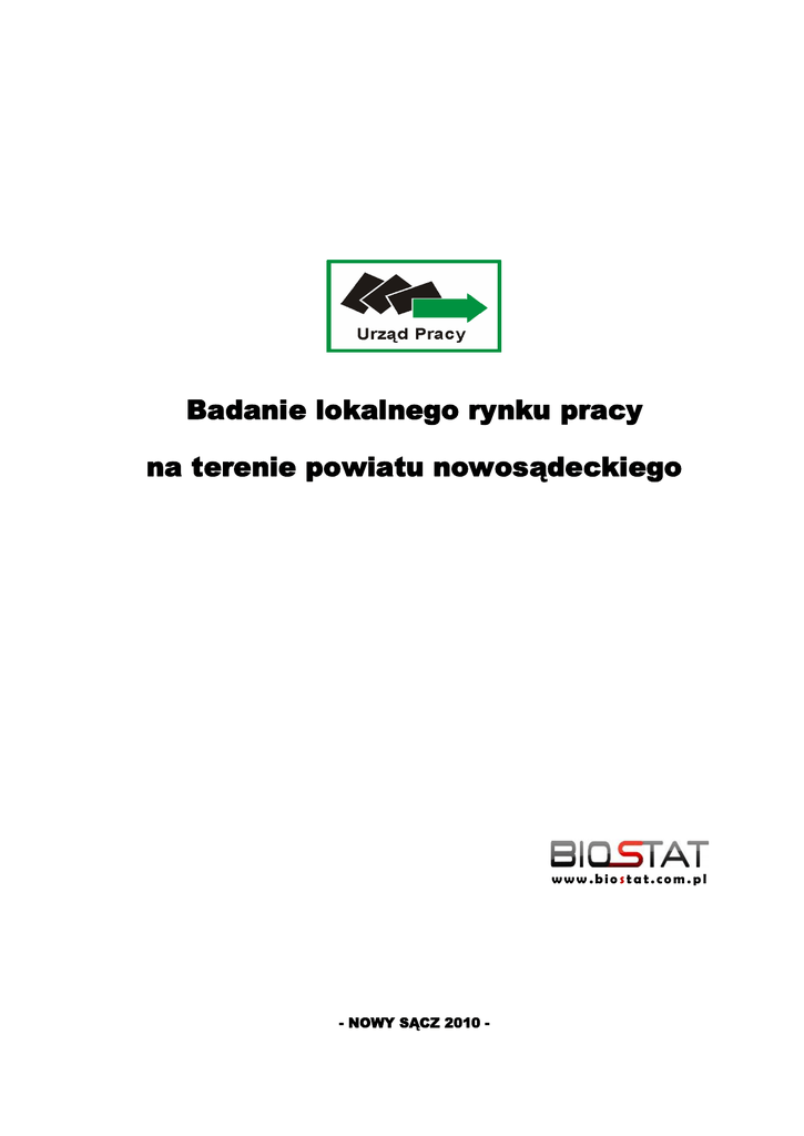 Badanie lokalnego rynku pracy na terenie powiatu nowosądeckiego www .bio stat.com.pl - NOWY SĄCZ 2010 - Spis treści Spis treści..................................................................................................................................2 Wstęp .........................................................................................................................................4 I. Nota metodologiczna .............................................................................................................6 1.1. Sposoby doboru próby i technik badawczych ........................................................................6 1.2. Metody dotarcia do respondentów ........................................................................................7 1.3. Zastosowane miary i testy statystyczne ................................................................................8 1.4. Harmonogram badania .........................................................................................................8 II. Sytuacja na lokalnym rynku pracy......................................................................................10 2.1. Ogólna charakterystyka powiatu .........................................................................................10 2.2. Przedsiębiorczość ..............................................................................................................11 2.3. Bezrobocie .........................................................................................................................14 III. Sytuacja osób bezrobotnych biorących udział w badaniu ............................................... 18 3.1. Dane metryczne respondentów...........................................................................................18 3.2. Charakterystyka osób bezrobotnych biorących udział w badaniu......................................... 19 3.3. Przyczyny niepodejmowania zatrudnienia przez respondentów........................................... 21 IV. Kwestia poszukiwania zatrudnienia przez respondentów................................................ 22 4.1. Współpraca bezrobotnych z Powiatowym Urzędem Pracy dla Powiatu Nowosądeckiego. ... 22 4.2. Zjawisko pracy „na czarno” wśród bezrobotnych. ................................................................ 24 V. Preferencje szkoleniowe bezrobotnych biorących udział w badaniu ............................... 26 5.1. Zainteresowanie osób bezrobotnych uczestnictwem w szkoleniach organizowanych przez Powiatowy Urząd Pracy dla Powiatu Nowosądeckiego .............................................................. 26 5.2. Dotychczasowe uczestnictwo osób bezrobotnych w szkoleniach......................................... 27 5.3. Rodzaje szkoleń pomocnych w znalezieniu pracy – według osób bezrobotnych .................. 29 VI. Przedsiębiorczość w powiecie nowosądeckim................................................................. 32 6.1. Charakterystyka przedsiębiorstw biorących udział w badaniu.............................................. 32 6.2. Kondycja przedsiębiorstw biorących udział w badaniu......................................................... 35 6.3. Plany inwestycyjne przedsiębiorców ...................................................................................37 VII. Ewaluacja potrzeb szkoleniowych przedsiębiorców ....................................................... 39 VIII. Sytuacja na rynku pracy w powiecie nowosądeckim ..................................................... 42 8.1. Prognozowane zmiany wielkości zatrudnienia wśród badanych przedsiębiorstw ................. 42 IX. Zapotrzebowanie na pracowników w badanym regionie ................................................. 45 X. Współpraca badanych przedsiębiorstw z Powiatowym Urzędem Pracy dla Powiatu Nowosądeckiego .....................................................................................................................49 10.1. Skala dotychczasowej współpracy z Powiatowym Urzędem Pracy dla Powiatu Nowosądeckiego .......................................................................................................................49 10.2. Preferowane formy współpracy z Powiatowym Urzędem Pracy dla Powiatu Nowosądeckiego .................................................................................................................................................50 Badanie lokalnego rynku pracy na terenie powiatu nowosądeckiego. 2/102 10.3. Ocena mocnych i słabych stron współpracy z Powiatowym Urzędem Pracy dla Powiatu Nowosądeckiego .......................................................................................................................51 XI. Analiza SWOT dla powiatu nowosądeckiego.................................................................... 53 Podsumowanie........................................................................................................................56 Spis rysunków.........................................................................................................................60 Spis tabel .................................................................................................................................62 Załącznik nr 1 – Kwestionariusz badawczy – przedsiębiorcy ............................................... 63 Załącznik nr 2 – Kwestionariusz badawczy – osoby bezrobotne .......................................... 69 Załącznik nr 3 – Dodatkowe zestawienia tabelaryczne.......................................................... 73 Badanie lokalnego rynku pracy na terenie powiatu nowosądeckiego. 3/102 Wstęp Badanie lokalnego rynku pracy na terenie powiatu nowosądeckiego zrealizowano pomiędzy kwietniem a czerwcem 2010 roku. Nad prawidłowością wykonania projektu czuwał jego Zleceniodawca – Powiatowy Urząd Pracy dla Powiatu Nowosądeckiego. Ba