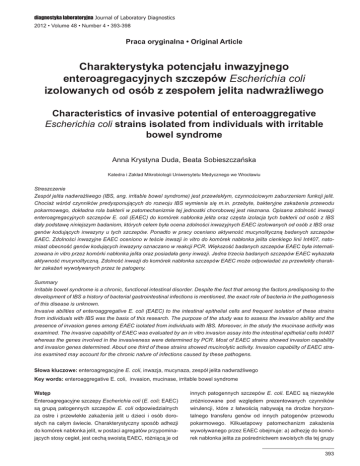 diagnostyka laboratoryjna Journal of Laboratory Diagnostics 2012 • Volume 48 • Number 4 • 393-398 Praca oryginalna • Original Article Charakterystyka potencjału inwazyjnego enteroagregacyjnych szczepów Escherichia coli izolowanych od osób z zespołem jelita nadwrażliwego Characteristics of invasive potential of enteroaggregative Escherichia coli strains isolated from individuals with irritable bowel syndrome Anna Krystyna Duda, Beata Sobieszczańska Katedra i Zakład Mikrobiologii Uniwersytetu Medycznego we Wrocławiu Streszczenie Zespół jelita nadwrażliwego (IBS, ang. irritable bowel syndrome) jest przewlekłym, czynnościowym zaburzeniem funkcji jelit. Chociaż wśród czynników predysponujących do rozwoju IBS wymienia się m.in. przebyte, bakteryjne zakażenia przewodu pokarmowego, dokładna rola bakterii w patomechanizmie tej jednostki chorobowej jest nieznana. Opisana zdolność inwazji enteroagregacyjnych szczepów E. coli (EAEC) do komórek nabłonka jelita oraz częsta izolacja tych bakterii od osób z IBS dały podstawę niniejszym badaniom, których celem była ocena zdolności inwazyjnych EAEC izolowanych od osób z IBS oraz genów kodujących inwazyny u tych szczepów. Ponadto w pracy oceniano aktywność mucynolityczną badanych szczepów EAEC. Zdolności inwazyjne EAEC oceniono w teście inwazji in vitro do komórek nabłonka jelita cienkiego linii Int407, natomiast obecność genów kodujących inwazyny oznaczano w reakcji PCR. Większość badanych szczepów EAEC była internalizowana in vitro przez komórki nabłonka jelita oraz posiadała geny inwazji. Jedna trzecia badanych szczepów EAEC wykazała aktywność mucynolityczną. Zdolność inwazji do komórek nabłonka szczepów EAEC może odpowiadać za przewlekły charakter zakażeń wywoływanych przez te patogeny. Summary Irritable bowel syndrome is a chronic, functional intestinal disorder. Despite the fact that among the factors predisposing to the development of IBS a history of bacterial gastrointestinal infections is mentioned, the exact role of bacteria in the pathogenesis of this disease is unknown. Invasive abilities of enteroaggregative E. coli (EAEC) to the intestinal epithelial cells and frequent isolation of these strains from individuals with IBS was the basis of this research. The purpose of the study was to assess the invasion ability and the presence of invasion genes among EAEC isolated from individuals with IBS. Moreover, in the study the mucinase activity was examined. The invasive capability of EAEC was evaluated by an in vitro invasion assay into the intestinal epithelial cells Int407 whereas the genes involved in the invasiveness were determined by PCR. Most of EAEC strains showed invasion capability and invasion genes determined. About one third of these strains showed mucinolytic activity. Invasion capability of EAEC strains examined may account for the chronic nature of infections caused by these pathogens. Słowa kluczowe:enteroagregacyjne E. coli, inwazja, mucynaza, zespół jelita nadwrażliwego Key words:enteroaggregative E. coli, invasion, mucinase, irritable bowel syndrome Wstęp Enteroagregacyjne szczepy Escherichia coli (E. coli; EAEC) są grupą patogennych szczepów E. coli odpowiedzialnych za ostre i przewlekłe zakażenia jelit u dzieci i osób dorosłych na całym świecie. Charakterystyczny sposób adhezji do komórek nabłonka jelit, w postaci agregatów przypominających stosy cegieł, jest cechą swoistą EAEC, różniącą je od innych patogennych szczepów E. coli. EAEC są niezwykle zróżnicowane pod względem prezentowanych czynników wirulencji, które z łatwością nabywają na drodze horyzontalnego transferu genów od innych patogenów przewodu pokarmowego. Kilkuetapowy patomechanizm zakażenia wywoływanego przez EAEC obejmuje: a) adhezję do komórek nabłonka jelita za pośrednictwem swoistych dla tej grupy 393 Charakterystyka potencjału inwazyjnego enteroagregacyjnych szczepów Escherichia coli izolowanych od osób ... E. coli fimbrii agregacyjnych; b) stymulację gruczołów błony śluzowej jelita do sekrecji śluzu, w którym EAEC tworzą biofilm; c) wydzielanie enterotoksyn i/lub cytotoksyn, które modulują aktywność sekrecyjną enterocytów lub powodują ich uszkodzenie [1]. Ważnym czynnikiem wirulencji niektórych szczepów EAEC, a także pałeczek Shigella spp. jest proteaza serynowa Pic (ang. protease involved in intestinal colonization) o aktywności mucynazy. Mucynaza Pic indukuje sekrecję śluzu przez komórki kubkowe błony śluzowej jelita, co odpowiada za śluzowy charakter biegunek oraz degraduje mucyny zawarte w śluzie, co z kolei ułatwia tym patogenom osiąganie powierzchni nabłonka i przewlekłą kolonizację jelit [2]. Ponadto, niektóre szczepy EAEC wykazują zdolność inwazji do komórek nabłonka jelita [1]. Przebieg zakażenia w dużej mierze zależy więc od czynników wirulencji jakimi dysponują szczepy EAEC. Zespół jelita nadwrażliwego (IBS) jest czynnościowym zaburzeniem funkcji jelit o nieznanej etiologii, które dotyczy ok. 3-10% populacji. Wśród potencjalnych czynników mogących indukować rozwój IBS wymieniane są: płeć, długotrwała antybiotykoterapia, stres, zabiegi chirurgiczne w obrębie jamy brzusznej, nadwrażliwość mięśni jelit, nadużywanie alkoholu, mocnej kawy i herbaty oraz zakażenia bakteryjne. Objawy kliniczne, towarzyszące IBS obejmują kurczowe bóle brzucha, dyskomfort, uczucie niepełnego wypróżnienia, zaburzenia rytmu wypróżnień [3, 4]. Po-zakaźna postać IBS, której dominującym objawem klinicznym jest uporczywa biegunka, najczęściej jest skutkiem przebytego zakażenia przewodu pokarmowego, choć dotychczas nie zidentyfikowano żadnego, konkretnego drobnoustroju, mogącego indukować rozwój tej postaci IBS. Po-zakaźna postać IBS łączona jest z przebytym zakażeniem wywołanym przez bakterie (np.: E. coli., Campylobacter jejuni, Shigella spp.,) lub pasożyt