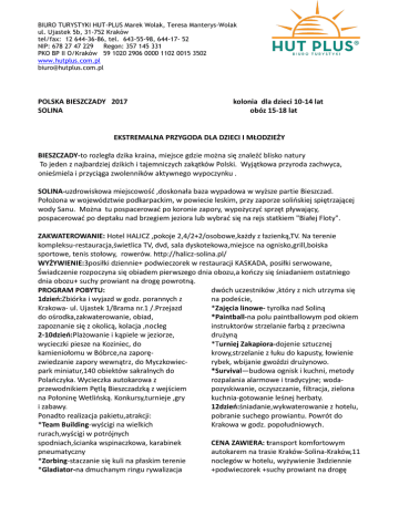 BIURO TURYSTYKI HUT-PLUS Marek Wolak, Teresa Manterys-Wolak ul. Ujastek 5b, 31-752 Kraków tel/fax: 12 644-36-86, tel. 643-55-98, 644-17- 52 NIP: 678 27 47 229 Regon: 357 145 331 PKO BP II O/Kraków 59 1020 2906 0000 1102 0015 3502 www.hutplus.com.pl [email protected] POLSKA BIESZCZADY 2017 SOLINA kolonia dla dzieci 10-14 lat obóz 15-18 lat EKSTREMALNA PRZYGODA DLA DZIECI I MŁODZIEŻY BIESZCZADY-to rozległa dzika kraina, miejsce gdzie można się znaleźć blisko natury To jeden z najbardziej dzikich i tajemniczych zakątków Polski. Wyjątkowa przyroda zachwyca, onieśmiela i przyciąga zwolenników aktywnego wypoczynku . SOLINA-uzdrowiskowa miejscowość ,doskonała baza wypadowa w wyższe partie Bieszczad. Położona w województwie podkarpackim, w powiecie leskim, przy zaporze solińskiej spiętrzającej wody Sanu. Można tu pospacerować po koronie zapory, wypożyczyć sprzęt pływający, pospacerować po deptaku nad brzegiem jeziora lub wybrać się na rejs statkiem "Białej Floty". ZAKWATEROWANIE: Hotel HALICZ ,pokoje 2,4/2+2/osobowe,każdy z łazienką,TV. Na terenie kompleksu-restauracja,świetlica TV, dvd, sala dyskotekowa,miejsce na ognisko,grill,boiska sportowe, tenis stołowy, rowerów. http://halicz-solina.pl/ WYŻYWIENIE:3posiłki dziennie+ podwieczorek w restauracji KASKADA, posiłki serwowane, Świadczenie rozpoczyna się obiadem pierwszego dnia obozu,a kończy się śniadaniem ostatniego dnia obozu+ suchy prowiant na drogę powrotną. PROGRAM POBYTU: dwóch uczestników ,który z nich utrzyma się 1dzień:Zbiórka i wyjazd w godz. porannych z na podeście, Krakowa- ul. Ujastek 1/Brama nr.1 /.Przejazd *Zajęcia linowe- tyrolka nad Soliną do ośrodka,zakwaterowanie, obiad, *Paintball-na polu paintballowym pod okiem zapoznanie się z okolicą, kolacja ,nocleg instruktorów strzelanie farbą z przeciwna 2-10dzień:Plażowanie i kąpiele w jeziorze, drużyną wycieczki piesze na Koziniec, do *Turniej Zakapiora-dojenie sztucznej kamieniołomu w Bóbrce,na zaporękrowy,strzelanie z łuku do kapusty, łowienie zwiedzanie zapory wewnątrz, do Myczkowiecrybek, wbijanie gwoździ drużynowo. park miniatur,140 obiektów sakralnych do *Survival—budowa ognisk i kuchni, metody Polańczyka. Wycieczka autokarowa z rozpalania alarmowe i tradycyjne; wodaprzewodnikiem Pętlą Bieszczadzką z wejściem pozyskiwanie, oczyszczanie, filtracja, zielona na Połoninę Wetlińską. Konkursy,turnieje ,gry kuchnia-gotowanie leśnej herbaty. i zabawy. 12dzień:śniadanie,wykwaterowanie z hotelu, Ponadto realizacja pakietu,atrakcji: pobranie suchego prowiantu. Powrót do *Team Building-wyścigi na wielkich Krakowa w godz. popołudniowych. rurach,wyścigi w potrójnych spodniach,ścianka wspinaczkowa, karabinek CENA ZAWIERA: transport komfortowym pneumatyczny autokarem na trasie Kraków-Solina-Kraków,11 *Zorbing-staczanie się kuli na płaskim terenie noclegów w hotelu, wyżywienie 3xdziennie *Gladiator-na dmuchanym ringu rywalizacja +podwieczorek +suchy prowiant na drogę BIURO TURYSTYKI HUT-PLUS Marek Wolak, Teresa Manterys-Wolak ul. Ujastek 5b, 31-752 Kraków tel/fax: 12 644-36-86, tel. 643-55-98, 644-17- 52 NIP: 678 27 47 229 Regon: 357 145 331 PKO BP II O/Kraków 59 1020 2906 0000 1102 0015 3502 www.hutplus.com.pl [email protected] powrotną, opieka kadry, wykwalifikowani wychowawcy i instruktorzy z doświadczeniem w pracy z dziećmi i młodzieżą, opiekę medyczną ,lekarz na telefon, ubezpieczenie NNW realizacja programu CENA NIE ZAWIERA: dopłaty do połączeń antenowych TERMIN I CENA: 24.07-04.08.2017- 12dni/11noclegów-1690zł
