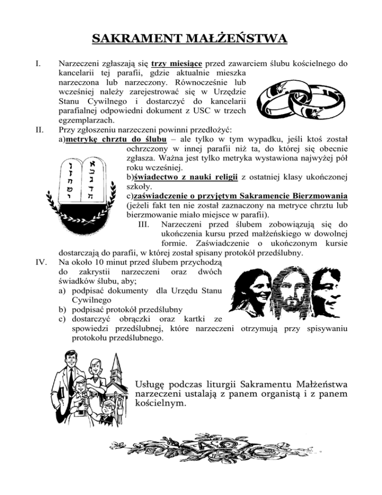 SAKRAMENT MAŁŻEŃSTWA I. II. IV. Narzeczeni zgłaszają się trzy miesiące przed zawarciem ślubu kościelnego do kancelarii tej parafii, gdzie aktualnie mieszka narzeczona lub narzeczony. Równocześnie lub wcześniej należy zarejestrować się w Urzędzie Stanu Cywilnego i dostarczyć do kancelarii parafialnej odpowiedni dokument z USC w trzech egzemplarzach. Przy zgłoszeniu narzeczeni powinni przedłożyć: a)metrykę chrztu do ślubu – ale tylko w tym wypadku, jeśli ktoś został ochrzczony w innej parafii niż ta, do której się obecnie zgłasza. Ważna jest tylko metryka wystawiona najwyżej pół roku wcześniej. b)świadectwo z nauki religii z ostatniej klasy ukończonej szkoły. c)zaświadczenie o przyjętym Sakramencie Bierzmowania (jeżeli fakt ten nie został zaznaczony na metryce chrztu lub bierzmowanie miało miejsce w parafii). III. Narzeczeni przed ślubem zobowiązują się do ukończenia kursu przed małżeńskiego w dowolnej formie. Zaświadczenie o ukończonym kursie dostarczają do parafii, w której został spisany protokół przedślubny. Na około 10 minut przed ślubem przychodzą do zakrystii narzeczeni oraz dwóch świadków ślubu, aby; a) podpisać dokumenty dla Urzędu Stanu Cywilnego b) podpisać protokół przedślubny c) dostarczyć obrączki oraz kartki ze spowiedzi przedślubnej, które narzeczeni otrzymują przy spisywaniu protokołu przedślubnego. Usługę podczas liturgii Sakramentu Małżeństwa narzeczeni ustalają z panem organistą i z panem kościelnym.
