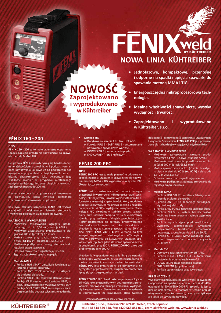 NOWA LINIA KÜHTREIBER nowość Zaprojektowano i wyprodukowano w Kühtreiber • Jednofazowe, kompaktowe, przenośne i odporne na spadki napięcia spawarki do spawania metodą MMA i TIG. • Energooszczędna mikroprocesorowa technologia. • Idealne właściwości spawalnicze, wysoka wydajność i trwałość. • Zaprojektowano i w Kühtreiber, s.r.o. Fénix 160 - 200 OPIS Fénix 160 - 200 są to małe przenośne odporne na spadek napięcia urządzenia spawalnicze do spawania metodą MMA i TIG. Urządzenia FÉNIX charakteryzują się bardzo dobrymi właściwościami spawalniczymi podczas normalnego użytkowania jak również po podłączeniu pod agragat oraz przy zasilaniu z długich przedłużaczy. Idealna charakterystyka łuku gwarantuje jego stabilność również w przypadku niestabilnego napięcia zasilającego lub przy długich przewodach zasilających (nawet do 200 m). Elementy sterowania urządzenia są zintregrowane na klawiaturze, która zwiększa dokładność i niezawodność sterowania urządzeniem. Kolejnymi zaletami urządzenia FENIX jest wysoka wydajność i efektywność, łatwość sterowania i możliwość podłączenia zdalnego steowania. Własności i wyposażenie • Możliwość zastosowania agregatu prądotwórczego od min. 3,5 kVA (z funkcją A.V.R.). • Możliwość zastosowania przedłużacza o długości aż 200 m (przekrój 2,5 mm2). • Można spawać przy spadku napięcia w sieci o 40% (od 140 V) - elektrodą 1,6; 2,0; 2,5 • Możliwość podłączenia zdalnego sterowania do regulacji prądu spawania. • Ochrona termiczna z sygnalizacją świetlną. • Sygnalizacja skoku i spadku napięcia • Metoda MMA o Funkcja HOT START umożliwia łatwiejsze zajarzenie otulonej elektrody. o Funkcja ANTI STICK zapobiega przyklejaniu się otulonej elektrody. o Funkcja ARC FORCE zapewnia stabilność łuku. o Funkcja V.R.D. = system bezpiczeństwa MMA, na biegu jałowym napięcie wyjściowe wynosi 15 V. o Funkcja SOFT START MMA zapobiega wybijaniu bezpieczników podczas włączania urządzenia. • Metoda TIG o Dotykowe zajarzenie łuku tzw. LIFT ARC. o Funkcja PULSE - EASY PULSE - automatyczne nastawienie optymalnych wartości. o DOWN SLOPE (czas opadania prądu). o END CURRENT (prąd końcowy). Fénix 200 pfc OPIS Fénix 200 PFC jest to małe przenośne odporne na spadek napięcia urządzenie spawalnicze do spawania motodą MMA i TIG wyposażone w systém PFC (Power factor correction). Fénix jest skonstruowany za pomocą energooszczędnej inwertorowej mikroprocesorowej technologii PFC najwyższej jakości z wykorzystaniem tranformatora wysokiej częstotliwości, który moduluje prąd wejściowy tak, że ma prawie idealną sinusoidę, co zapewnia aż 92% wydajności urządzenia. Technologia PFC gwarantuje stabilny proces spawalniczy przy skokach napięcia w sieci elektrycznej również przy zasilaniu z długich przedłużaczy jak i przy podłączeniu do agregatu prądotwórczego bez widocznych zmian na łuku spawalniczym. Urządzenie jest w stanie pracować już od 90 V w sieci elekt. Fénix 200 PFC jest w stanie na tym samym bezpieczniku z sieci uzyskać o 40% wyższą moc w porównaniu do klasycznych urządzeń spawalniczych (np. tam gdzie klasyczna spawarka wybija bezpieczniki przy 150 A, Fénix 200 PFC spawa bez problemu prądem 200 A). Urządzenie wyposażone jest w funkcję do ograniczenia prądu wyjściowego, dzięki której urządzeniem można pracować i przy słabym zabezpieczeniu sieci. Fénix PFC jest przeznaczony do użytkowania na agregatach prądotwórczych, długich przedłużaczach i przy słabych bezpiecznikach w sieci. Fénix 200 PFC PFC charaktakteryzuje się wysoką stabilnością łuku, prostym i łatwym do zrozumienia sterowaniem, możliwościa zdalnego sterowania, wydajnością i wyposażeniem. Elementy sterowania urządzenia są zintregrowane na klawiaturze, która zwiększa Producent zastrzega sobie prawo do zmian. wyprodukowano dokładność i niezawodność sterowania urządzeniem. Urządzenie Spawalnicze FENIX 200 PFC jest przeznaczone dla najbardziej wymagających użytkowników. Własności i wyposażenie • Możliwość zastosowania agregatu prądotwórczego od min. 3,5 kVA (z funkcją A.V.R.). • Możliwość zastosowania przedłużacza o długości aż 200 m (przekrój 2,5 mm2). • Można spawać przy spadku (również trwałym) napięcia w sieci do 60 % (od 90 V) - elektrodą 1,6; 2,0; 2,5; 3,2; 4,0. • Ochrona termiczna z sygnalizacją świetlną. • Możliwość podłączenia zdalnego sterowania do regulacji prądu spawania. • Metoda MMA o Funkcja HOT START umożliwia łatwiejsze zajarzenie otulonej elektrody. o Funkcja ANTI STICK zapobiega przyklejaniu się otulonej elektrody. o Funkcja ARC FORCE zapewnia stabilność łuku. o Funkcja V.R.D. = system bezpieczeństwa MMA, na biegu jałowym napięcie wyjściowe wynosi 15 V. o Funkcja ograniczająca prąd wejściowy / wyjściowy zabezpieczająca wypadanie bezpieczników (możliwość symulowania dowolnego zabezpieczenia od 5 do 50 A). o Funkcja SOFT START MMA zapobiega wybijaniu bezpieczników podczas włączania urządzenia. • Metoda TIG o Dotykowe zajarzenie łuku tzw. LIFT ARC. o Funkcja PULSE - EASY PULSE - automatyczne nastawienie optymalnych wartości. o DOWN SLOPE (czas opadania prądu). o END CURRENT (prąd końcowy). o Funkcja ograniczająca prąd wyjściowy. Przeznaczenie Wysoka wydajność, idealne właściwości spawalnicze i odporność na spadki napięcia w sieci aż do 40%, ewentualnie 60% (FÉNIX 200 PFC) sprawia, że jest to idealne urząedzenie na montaże w terenie oraz do utrzymania ruchu, konserwacji, przemysłu ciężkiego, ale także do użytku domowego. Kühtreiber, s.r.o., Stařečka 997, 674 01 Třebíč, Czech Republic tel.: +48 518 529 538, fax: +420 568 851 010, [email protected], www.fenix-weld.eu Urządzenia spawalnicze FÉNIX gwarantują stabilny proces spawalniczy przy skokach napięcia w sieci elektrycznej również przy zasilaniu z dług