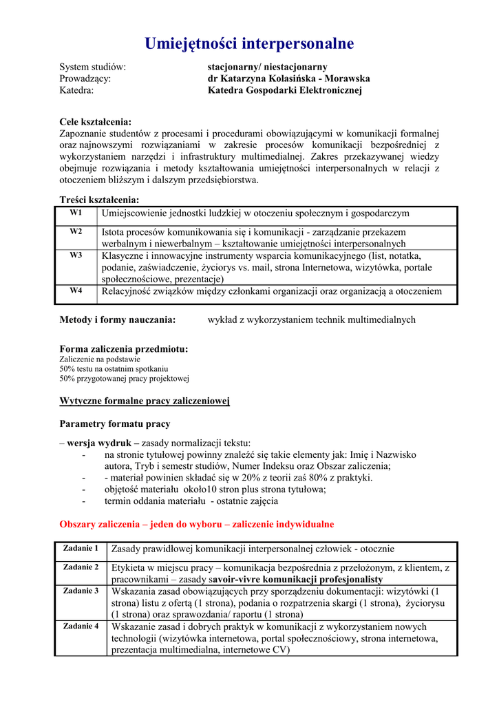 Umiejętności interpersonalne System studiów: Prowadzący: Katedra: stacjonarny/ niestacjonarny dr Katarzyna Kolasińska - Morawska Katedra Gospodarki Elektronicznej Cele kształcenia: Zapoznanie studentów z procesami i procedurami obowiązującymi w komunikacji formalnej oraz najnowszymi rozwiązaniami w zakresie procesów komunikacji bezpośredniej z wykorzystaniem narzędzi i infrastruktury multimedialnej. Zakres przekazywanej wiedzy obejmuje rozwiązania i metody kształtowania umiejętności interpersonalnych w relacji z otoczeniem bliższym i dalszym przedsiębiorstwa. Treści kształcenia: W1 Umiejscowienie jednostki ludzkiej w otoczeniu społecznym i gospodarczym W2 W3 W4 Istota procesów komunikowania się i komunikacji - zarządzanie przekazem werbalnym i niewerbalnym – kształtowanie umiejętności interpersonalnych Klasyczne i innowacyjne instrumenty wsparcia komunikacyjnego (list, notatka, podanie, zaświadczenie, życiorys vs. mail, strona Internetowa, wizytówka, portale społecznościowe, prezentacje) Relacyjność związków między członkami organizacji oraz organizacją a otoczeniem Metody i formy nauczania: wykład z wykorzystaniem technik multimedialnych Forma zaliczenia przedmiotu: Zaliczenie na podstawie 50% testu na ostatnim spotkaniu 50% przygotowanej pracy projektowej Wytyczne formalne pracy zaliczeniowej Parametry formatu pracy – wersja wydruk – zasady normalizacji tekstu: na stronie tytułowej powinny znaleźć się takie elementy jak: Imię i Nazwisko autora, Tryb i semestr studiów, Numer Indeksu oraz Obszar zaliczenia; - materiał powinien składać się w 20% z teorii zaś 80% z praktyki. objętość materiału około10 stron plus strona tytułowa; termin oddania materiału - ostatnie zajęcia Obszary zaliczenia – jeden do wyboru – zaliczenie indywidualne Zadanie 1 Zasady prawidłowej komunikacji interpersonalnej człowiek - otocznie Zadanie 2 Etykieta w miejscu pracy – komunikacja bezpośrednia z przełożonym, z klientem, z pracownikami – zasady savoir-vivre komunikacji profesjonalisty Wskazania zasad obowiązujących przy sporządzeniu dokumentacji: wizytówki (1 strona) listu z ofertą (1 strona), podania o rozpatrzenia skargi (1 strona), życiorysu (1 strona) oraz sprawozdania/ raportu (1 strona) Wskazanie zasad i dobrych praktyk w komunikacji z wykorzystaniem nowych technologii (wizytówka internetowa, portal społecznościowy, strona internetowa, prezentacja multimedialna, internetowe CV) Zadanie 3 Zadanie 4 Literatura przedmiotu: R. Williams R., Prezentacja, która robi wrażenie. Projekty z klasą, Helion, Gliwice 2011 Śliwińska K., Pacut M., Narzędzia i techniki komunikacji marketingowej XXI wieku, Oficyna Wolters Kluwer, Warszawa 2011 Kienzler I, Korespondencja Handlowa i Biurowość. Wzory Pism, Umów i Dokumentów Handlowych w Języku Polskim, Angielskim i Niemieckim, IVAX, Gdynia 2009 powodzenia dr Katarzyna Kolasińska - Morawska