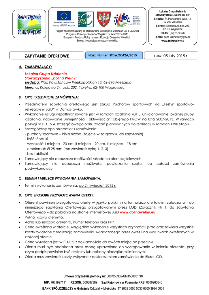 Projekt współfinansowany ze środków Unii Europejskiej w ramach Osi 4 LEADER Programu Rozwoju Obszarów Wiejskich na lata 2007 – 2013 Europejski Fundusz Rolny na rzecz Rozwoju Obszarów Wiejskich: Europa inwestująca w obszary wiejskie. Nasz Numer: STDW/0042A/2015 ZAPYTANIE OFERTOWE Lokalna Grupa Działania Stowarzyszenie „Dolina Wełny” Siedziba: Pl. Powstańców Wlkp. 13, 62-290 Mieścisko Biuro: ul. Kolejowa 24, pok. 202, 62-100 Wągrowiec Tel./fax: (67) 25-52-489 e-mail: [email protected] www.dolinawelny.eu Data: 05 luty 2015 r. A. ZAMAWIAJĄCY: Lokalna Grupa Działania Stowarzyszenia „Dolina Wełny” siedziba: Plac Powstańców Wielkopolskich 13, 62-290 Mieścisko biuro: ul. Kolejowa 24, pok. 202, II piętro, 62-100 Wągrowiec B. OPIS PRZEDMIOTU ZAMÓWIENIA: Przedmiotem zapytania ofertowego jest zakup Pucharów sportowych na „Festyn sportoworekreacyjny LGD” w Damasławku. Wykonanie usługi współfinansowane jest w ramach działania 431 „Funkcjonowanie lokalnej grupy działania, nabywanie umiejętności i aktywizacja”, objętego PROW na lata 2007-2013. W ramach pozycji nr II.D.15.4. szczegółowego opisu zadań planowanych do realizacji w ramach XVIII etapu. Szczegółowy opis przedmiotu zamówienia: - puchary sportowe – Piłka nożna (zdjęcie w załączniku do zapytania) - ilość: 3 sztuki - wysokość: I miejsce - 23 cm, II miejsce – 20 cm, III miejsce – 18 cm - emblemat: Ø 25 mm (ma zawierać cyfrę 1, 2, 3) - bez tabliczki Zamawiający nie dopuszcza możliwości składania ofert częściowych. Zamawiający nie dopuszcza możliwości powierzania części lub całości zamówienia podwykonawcy. C. TERMIN I MIEJSCE WYKONANIA ZAMÓWIENIA: Termin wykonania zamówienia: do 24 kwiecień 2015 r. D. OPIS SPOSOBU PRZYGOTOWANIA OFERTY: Oferent powinien przygotować ofertę w języku polskim na formularzu ofertowym załączonym do niniejszego Zapytania Ofertowego przygotowanym przez LGD (Załącznik Nr 1. do Zapytania Ofertowego – do pobrania na stronie internetowej LGD www.dolinawelny.eu). Pełna nazwa oferenta. Adres lub siedziba oferenta, numer telefonu oraz NIP. Cena określona w ofercie uwzględnia wykonanie wszystkich czynności i prac oraz zawiera wszystkie koszty związane z realizacją zamówienia świadczonego przez okres i na warunkach określonych w złożonej ofercie. Cena wyrażona jest w PLN, tj. z dokładnością do dwóch miejsc po przecinku. Oferta musi być podpisana przez osobę uprawnioną do występowania w imieniu oferenta, przy czym podpis powinien być czytelny lub opisany pieczątkami imiennymi. Oferta musi zawierać koszty związane z dostarczeniem zamówienia do Biura LGD. Umowa przyznania pomocy nr: 00072-6932-UM1500031/10 NIP: 7661927111 REGON: 300387389 Sąd Rejonowy w Poznaniu KRS: 0000263646 BANK SPÓŁDZIELCZY w Gnieźnie Oddział w Mieścisku 17 9065 0006 0030 0300 3984 0001 Projekt współfinansowany ze środków Unii Europejskiej w ramach Osi 4 LEADER Programu Rozwoju Obszarów Wiejskich na lata 2007 – 2013 Europejski Fundusz Rolny na rzecz Rozwoju Obszarów Wiejskich: Europa inwestująca w obszary wiejskie. Lokalna Grupa Działania Stowarzyszenie „Dolina Wełny” Siedziba: Pl. Powstańców Wlkp. 13, 62-290 Mieścisko Biuro: ul. Kolejowa 24, pok. 202, 62-100 Wągrowiec Tel./fax: (67) 25-52-489 e-mail: [email protected] www.dolinawelny.eu E. MIEJSCE ORAZ TERMIN SKŁADANIA OFERT: Termin składania ofert upływa w dniu: 12 luty 2015 roku do godz. 14.00. Oferta powinna być przesłana za pośrednictwem poczty elektronicznej (skan podpisanego i opieczętowanego dokumentu)na adres: [email protected], faksem na nr: 67/25-52-489 lub też dostarczona osobiście do Biura LGD przy ul. Kolejowej 24 w Wągrowcu. O terminowości złożenia oferty decyduje data wpływu do Biura LGD. Złożenie Oferty nie jest równoznaczne z dokonaniem Zamówienia. W toku badań i oceny złożonych ofert, Zamawiający może żądać od Oferenta wyjaśnień dotyczących treści złożonych ofert. Zapytanie ofertowe zamieszczono na stronie internetowej: www.dolinawelny.eu i w siedzibie Biura LGD. F. OPIS KRYTERIÓW I SPOSOBU OCENY OFERT: 1) Zamawiający ma prawo odrzucić ofertę, jeżeli: nie została złożona na wzorze Formularza Ofertowego – Załącznik Nr 1 do Zapytania Ofertowego przygotowanego przez LGD, zawiera rażąco niską cenę w stosunku do pozostałych złożonych ofert, nie zawiera czytelnego podpis osoby upoważnionej lub pieczątki imiennej bądź firmowej, została złożona po terminie 2) Zamawiający dokona oceny ważnych ofert w oparciu o następujące kryteria i ich znaczenie: Cena – Cena – 100 % 3) Za najkorzystniejszą zostanie uznana oferta, która spełni wszystkie warunki Zamawiającego. G. INFORMACJE DOTYCZĄCE WYBORU NAJKORZYSTNIEJSZEJ OFERTY: 1) O wyborze najkorzystniejszej oferty Zamawiający: zawiadomi wybranego oferenta za pośrednictwem poczty elektronicznej – e-maila. poinformuje pozostałych oferentów na stronie internetowej Zamawiającego. 2) Wybrany oferent otrzyma w terminie od 1 do 7 dni Zamówienie wykonane przez Lokalną Grupę Działania Stowarzyszenie „Dolina Wełny”. H. WARUNKI PŁATNOŚCI: Forma płatności: Przelew bankowy po realizacji Zamówienia, z minimalnym 14-dniowym terminem płatności za wykonane zadanie. Termin dostarczenia dokumentu do zapłaty: do 30 kwietnia 2015 roku. Termin zapłaty za w/w zadanie: minimum 14 dni od otrzymania dokumentu do zapłaty. I. DODATKOWE INFORMACJE: Osobą uprawnioną do kontaktowania się z oferentami z ramienia Zamawiającego jest: Pani Anna Woźniak – pracownik Biura LGD, e-mail: [email protected]. Informacji udzielamy tylko i wyłącznie za pomocą korespondencji e-mailowej. W korespondencji kierowanej do LGD należy posługiwać się nadanym numerem zapytania. Złożona oferta może podlegać negocjacjom. Umowa przyznania pomocy nr: 00072-6932-UM1500031/10 NIP: 7661927111 REGON: 300387389 Sąd Rejonowy w Poznaniu KRS: 0000263646 BANK SPÓŁDZIELC
