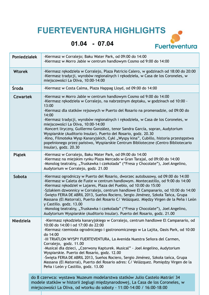FUERTEVENTURA HIGHLIGHTS 01.04 - 07.04 Poniedziałek -Kiermasz w Corralejo; Baku Water Park, od 09:00 do 14:00 -Kiermasz w Morro Jable w centrum handlowym Cosmo od 9:00 do 14:00 -Kiermasz rękodzieła w Corralejo, Plaza Patricio Calero, w godzinach od 18:00 do 20:00 -Kiermasz tradycji, wyrobów regionalnych i rękodzieła, w Casa de los Coroneles, w miejscowości La Oliva, 10:00-14:00 Wtorek -Kiermasz w Costa Calma, Plaza Happag Lloyd, od 09:00 do 14:00 Środa Czwartek -Kiermasz w Morro Jable w centrum handlowym Cosmo od 9:00 do 14:00 -Kiermasz rękodzieła w Corralejo, na nabrzeżnym deptaku, w godzinach od 10:00 13:00 -Kiermasz dla statków rejsowych w Puerto del Rosario na promenadzie, od 09:00 do 14:00 -Kiermasz tradycji, wyrobów regionalnych i rękodzieła, w Casa de los Coroneles, w miejscowości La Oliva, 10:00-14:00 -Koncert liryczny, Guillermo González, tenor Sandra García, sopran, Audytorium Wyspiarskie (Auditorio Insular). Puerto del Rosario, godz. 20.30 -Kino, Filmoteka Wysp Kanaryjskich, Cykl „Wyspy kina”, Cubillo, historia przestępstwa popełnionego przez państwo, Wyspiarskie Centrum Biblioteczne (Centro Bibliotecario Insular), godz. 20.30 Piątek -Kiermasz w Corralejo, Baku Water Park, od 09:00 do 14:00 -Kiermasz na miejskim rynku Plaza Mercado w Gran Tarajal, od 09:00 do 14:00 -Monolog teatralny, „Truskawka i czekolada” (“Fresa y Chocolate”), Joel Angelino, Audytorium w Corralejo, godz. 21.00 Sobota -Kiermasz ogrodniczy w Puerto del Rosario, dworzec autobusowy, od 09:00 do 14:00 -Kiermasz w Caleta de Fuste w centrum handlowym. Montecastillo, od 9:00 do 14:00 -Kiermasz rękodzieł w Lajares, Plaza del Pueblo, od 10:00 do 15:00 -Szlakiem dzwonnicy w Corralejo, centrum handlowe El Campanario, od 10:00 do 14:00 -Święto FERIA DE ABRIL 2013, Sueños Rociero, Sergio Jiménez, Szkoła Tańca, Grupa Massana (El Matorral), Puerto del Rosario C/ Velázquez. Między Virgen de la Peña i León y Castillo. godz. 13.00 -Monolog teatralny, „Truskawka i czekolada” (“Fresa y Chocolate”), Joel Angelino, Audytorium Wyspiarskie (Auditorio Insular). Puerto del Rosario, godz. 21.00 Niedziela -Kiermasz rękodzieła kanaryjskiego w Corralejo, centrum handlowe El Campanario, od 10:00 do 14:00 i od 17:00 do 22:00 -Kiermasz rzemiosła ogrodniczego i gastronomicznego w La Lajita, Oasis Park, od 10:00 do 14:00 -III TRIATLON WYSPY FUERTEVENTURA, La Avenida Nuestra Señora del Carmen, Corralejo, godz. 11.00 -Musical dla dzieci, „Czerwony Kapturek. Musical” - Joel Angelino, Audytorium Wyspiarskie. Puerto del Rosario, godz. 12.00 -Święta FERIA DE ABRIL 2013, Sueños Rociero, Sergio Jiménez, Szkoła tańca, Grupa Massana (El Matorral), Puerto del Rosario adres: C/ Velázquez. Pomiędzy Virgen de la Peña i León y Castillo, godz. 13.00 do 8 czerwca: wystawa 'Muzeum modelarstwa statków Julio Castelo Matrán' 34 modele statków w historii żeglugi międzynarodowej, La Casa de los Coroneles, w miejscowości La Oliva, od wtorku do soboty - 11:00-14:00 / 16:00-18:00