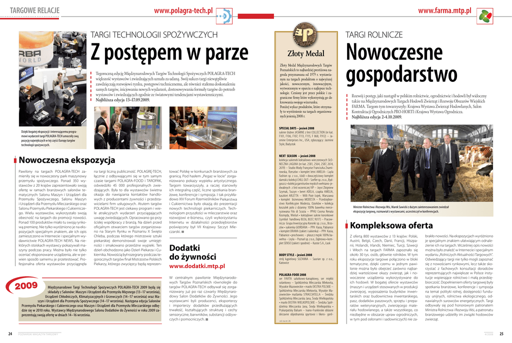 TARGOWE RELACJE www.polagra-tech.pl www.farma.mtp.pl Targi technologii spożywczych Z postępem w parze Tegoroczną edycję Międzynarodowych Targów Technologii Spożywczych POLAGRA-TECH większość wystawców i zwiedzających uznała za udaną. Swój sukces targi niewątpliwie zawdzięczają rozwojowi rynku, postępowi technicznemu, ale również stałemu doskonaleniu samych targów, inicjowaniu nowych wydarzeń, dostosowywaniu formuły targów do potrzeb wystawców i zwiedzających zgodnie ze światowymi tendencjami wystawienniczymi. Najbliższa edycja 13–17.09.2009. Nowoczesna ekspozycja 2009 na targi liczną publiczność. POLAGRĘ-TECH, łącznie z odbywającymi się w tym samym czasie targami POLAGRA-FOOD i TAROPAK, odwiedziło 45 000 profesjonalnych zwiedzających. Była to dla wystawców świetna okazja do nawiązania kontaktów handlowych z producentami żywności i przedstawicielami firm usługowych. Atutem targów POLAGRA-TECH jest ciekawy program i wiele atrakcyjnych wydarzeń przyciągających uwagę zwiedzających. Opracowano go przy ścisłej współpracy z branżą. Na dzień przed oficjalnym otwarciem targów zorganizowano na Starym Rynku w Poznaniu X Święto Chleba, podczas którego mistrzowie sztuki piekarskiej demonstrowali swoje umiejętności i smakowano przeróżne wypieki. Ten dzień obchodzono jako Dzień Piekarza i Cukiernika. Nowością był rozegrany podczas tegorocznych targów finał Mistrzostw Polskich Piekarzy, którego zwycięzcy będą reprezen- Międzynarodowe Targi Technologii Spożywczych POLAGRA-TECH 2009 będą się składały z Salonów: Maszyn i Urządzeń dla Przemysłu Mięsnego (13–17 września), Urządzeń Chłodniczych, Klimatyzacyjnych i Grzewczych (14–17 września) oraz Maszyn i Urządzeń dla Przemysłu Spożywczego (14–17 września). Następna edycja Salonów Przemysłu Piekarskiego i Cukierniczego oraz Maszyn i Urządzeń dla Przemysłu Mleczarskiego odbędzie się w 2010 roku. Wystawcy Międzynarodowego Salonu Dodatków do Żywności w roku 2009 zaprezentują swoją ofertę w dniach 14–16 września. 24 POZNAŃSKI MAGAZYN TARGOW Y Złoty Medal Złoty Medal Międzynarodowych Targów Poznańskich to najbardziej prestiżowa nagroda przyznawana od 1979 r. wystawianym na targach produktom o najwyższej jakości, nowoczesnym, innowacyjnym, wytworzonym w oparciu o najlepsze technologie. Ceniony jest przez polskie i zagraniczne firmy które wykorzystują go do kreowania swojego wizerunku. Poniżej wykaz produktów, które otrzymały to wyróżnienie na targach organizowanych jesienią 2008 r. Nowoczesne gospodarstwo Rozwój i postęp, jaki nastąpił w polskim rolnictwie, ogrodnictwie i hodowli był widoczny także na Międzynarodowych Targach Hodowli Zwierząt i Rozwoju Obszarów Wiejskich FARMA. Targom tym towarzyszyły: Krajowa Wystawa Zwierząt Hodowlanych, Salon Kontraktacji Ogrodniczych PRO-HORTI i Krajowa Wystawa Ogrodnicza. Najbliższa edycja 2-4.10.2009. SPECIAL DAYS – jesień 2008 suknie ślubne JASMINE z linii COLLECTION (nr kat. F101, F106, F107, F113, F115, F 868, F912) – Jasmine Enterprises Inc., USA; zgłaszający: Jasmine Style, Białystok Dzięki bogatej ekspozycji i interesującemu programowi wydarzeń targi POLAGRA-TECH umocniły swą pozycję największych w tej części Europy targów technologii spożywczych. Pawilony na targach POLAGRA-TECH zamieniły się w nowoczesny park maszynowy przemysłu spożywczego. Ponad 350 wystawców z 20 krajów zaprezentowało swoją ofertę w ramach branżowych salonów tematycznych: Salonu Maszyn i Urządzeń dla Przemysłu Spożywczego, Salonu Maszyn i Urządzeń dla Przemysłu Mleczarskiego oraz Salonu Przemysłu Piekarskiego i Cukierniczego. Wielu wystawców, wykorzystało swoją obecność na targach do promocji nowości. Ponad 100 produktów miało tu swoją rynkową premierę. Nie tylko wyróżniono je na ekspozycjach specjalnym znakiem, ale ich opis zamieszczono w Internecie i specjalnym wydawnictwie POLAGRA-TECH NEWS. Na niektórych stoiskach wystawcy pokazywali maszyny podczas pracy. Można było nie tylko oceniać eksponowane urządzenia, ale w pewien sposób samemu je przetestować. Profesjonalna oferta wystawców przyciągnęła Targi ROLNICZE tować Polskę w konkursach branżowych za granicą. Pod hasłem „Pegaz w locie” zorganizowano pokazy wypieku artystycznego. Targom towarzyszyły, a raczej stanowiły ich integralną część, liczne spotkania branżowe, konferencje i sympozja. I tak przykładowo XIV Forum Rzemieślników Piekarstwa i Cukiernictwa było okazją do prezentacji nowych technologii piekarniczych. Technologiom przyszłości w mleczarstwie oraz rozwojowi e-biznesu, czyli wykorzystaniu Internetu w działalności przedsiębiorstw poświęcony był VII Krajowy Szczyt Mleczarski. Dodatki do żywności www.dodatki.mtp.pl W centralnym pawilonie Międzynarodowych Targów Poznańskich równolegle do targów POLAGRA-TECH odbywał się zorganizowany już po raz czwarty Międzynarodowy Salon Dodatków do Żywności. Jego wystawcami byli producenci, eksporterzy i importerzy dodatków przedłużających trwałość, kształtujących strukturę i cechy sensoryczne, barwników, substancji odżywczych i pomocniczych. NEXT SEASON – jesień 2008 kolekcja sukienek koktailowo-wieczorowych SŁONECZNA LAGUNA (nr kat. 2581, 2564, 2587, 2614, 2619) – Studio Mody Françoise Franciszka Znamirowska, Rzeszów • komplet letni AMELIA– Layla Fashion sp. z o.o., Łódź • dwuczęściowy komplet damski z kolekcji CHILL OUT– Szefler sp. z o.o., Bydgoszcz • kolekcja garniturów męskich wełniano-jedwabnych z linii wzorniczej VIP – Joyvi Zbigniew Szymak, Tuszyn • beret ADELA, czapka AMELIA, kaszkiet ARLETTA – Willi Piotr Łojek, Warszawa • komplet biznesowy MODESTA – Przedsiębiorstwo Konfekcyjne Modesta, Ozorków • kolekcja koszulek polo z dzianiny 100% bawełna merceryzowana Filo di Scozia – PPHU Cosma Renata Kosmęda, Wieluń • koktajlowe sukn