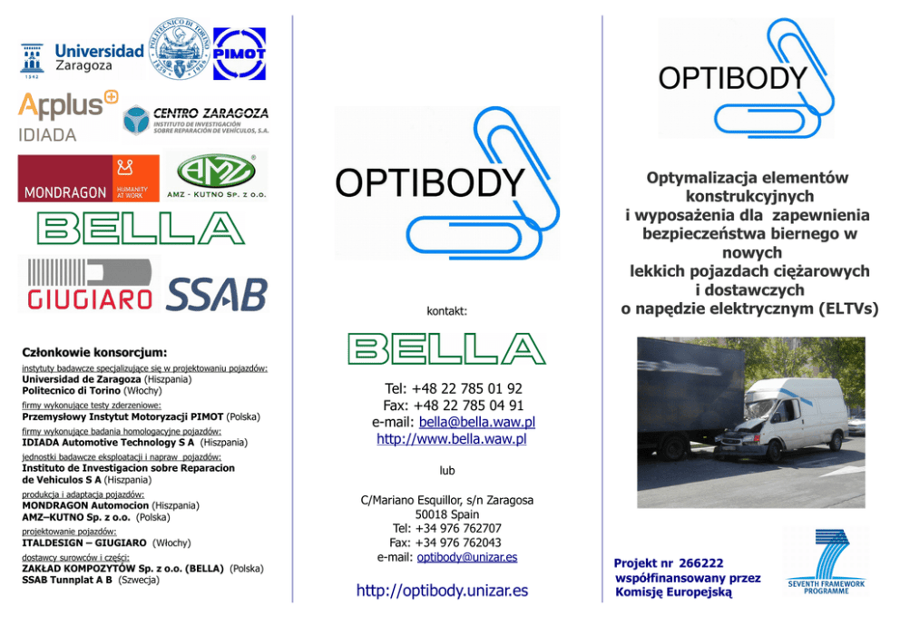 kontakt: Optymalizacja elementów konstrukcyjnych i wyposażenia dla zapewnienia bezpieczeństwa biernego w nowych lekkich pojazdach ciężarowych i dostawczych o napędzie elektrycznym (ELTVs) Członkowie konsorcjum: instytuty badawcze specjalizujące się w projektowaniu pojazdów: Universidad de Zaragoza (Hiszpania) Politecnico di Torino (Włochy) firmy wykonujące testy zderzeniowe: Przemysłowy Instytut Motoryzacji PIMOT (Polska) firmy wykonujące badania homologacyjne pojazdów: IDIADA Automotive Technology S A (Hiszpania) Tel: +48 22 785 01 92 Fax: +48 22 785 04 91 e-mail: [email protected] http://www.bella.waw.pl jednostki badawcze eksploatacji i napraw pojazdów: Instituto de Investigacion sobre Reparacion de Vehiculos S A (Hiszpania) produkcja i adaptacja pojazdów: MONDRAGON Automocion (Hiszpania) AMZ–KUTNO Sp. z o.o. (Polska) projektowanie pojazdów: ITALDESIGN – GIUGIARO (Włochy) dostawcy surowców i części: ZAKŁAD KOMPOZYTÓW Sp. z o.o. (BELLA) (Polska) SSAB Tunnplat A B (Szwecja) lub C/Mariano Esquillor, s/n Zaragosa 50018 Spain Tel: +34 976 762707 Fax: +34 976 762043 e-mail: [email protected] http://optibody.unizar.es Projekt nr 266222 współfinansowany przez Komisję Europejską OPTIBODY jest nową koncepcją modułowej budowy lekkich samochodów ciężarowych i dostawczych o napędzie elektrycznym (ELTVs), która skierowana jest na poprawę bezpieczeństwa biernego w celu ograniczenia ilości ofiar lub groźnych uszkodzeń ciała. Ta nowa strukturalna koncepcja obejmuje: podwozie, kabinę poprawiającą obecny poziom ochrony i ergonomii, oraz modułowe elementy dające szczególną ochronę w przypadku zderzenia lub dachowania samochodu. Każdy moduł może być indywidualnie optymalizowany. OPTIBODY ze swobodnym rozmieszczeniem wewnętrznych komponentów (mniej konstrukcyjnych ograniczeń w porównaniu z tradycyjnym pojazdem) daje unikalną możliwość zastosowania innowacyjnych rozwiązań dla zapewnienia pasywnego bezpieczeństwa w lekkich pojazdach ciężarowych i dostawczych o napędzie elektrycznym (ELTVs). OPTIBODY jako projekt oparty na systemie optymalnie dobranych modułów jest łatwy w obsłudze i naprawie przy niewielkich kosztach naprawy i konserwacji pojazdu. OPTIBODY doprowadzi do zmniejszenia skali i powagi urazów powstałych w wyniku wypadków z udziałem ELTVs, co poważnie zredukuje koszty medyczne ponoszone przez system Służby Zdrowia. OPTIBODY: w ramach projektu powołany zostanie Komitet Doradczy, którego członkami będą osoby z administracji publicznej różnych krajów Unii Europejskiej. Członkowie Komitetu Doradczego, zaproszeni do udziału w spotkaniach Komitetu Wykonawczego OPTIBODY, dostarczą informacji zwrotnej o projekcie, co pozwoli na szeroką dyskusję o dalszych możliwościach wykorzystania zastosowanych technologii oraz współpracy na przyszłość. Do zadań Komitetu Doradczego należeć będzie kontrola jakości prac nad projektem, pomoc w rozpowszechnieniu informacji o projekcie i jego wynikach oraz inne zadania uzgodnione z Komitetem Wykonawczym Projektu. Członkowie Komitetu Doradczego OPTIBODY: Ayuntamiento de Zaragoza (Hiszpania Congreso de los Diputados (Hiszpania) Direccion General de Trafico (Hiszpania) Politechnika Warszawska Wydział Samochodów i Maszyn Roboczych prof. dr hab. inż. Stanisław Radkowski (Polska)