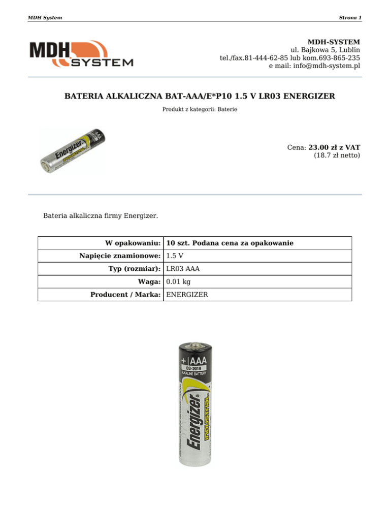 MDH System Strona 1 MDH-SYSTEM ul. Bajkowa 5, Lublin tel./fax.81-444-62-85 lub kom.693-865-235 e mail: [email protected] BATERIA ALKALICZNA BAT-AAA/E*P10 1.5 V LR03 ENERGIZER Produkt z kategorii: Baterie Cena: 23.00 zł z VAT (18.7 zł netto) Bateria alkaliczna firmy Energizer. W opakowaniu: 10 szt. Podana cena za opakowanie Napięcie znamionowe: 1.5 V Typ (rozmiar): LR03 AAA Waga: 0.01 kg Producent / Marka: ENERGIZER MDH System Strona 2 Opakowanie: Zapraszamy do naszego sklepu internetowego www.mdh-system.pl Dokument wygenerowany 2017-03-02 o godzinie 16:08
