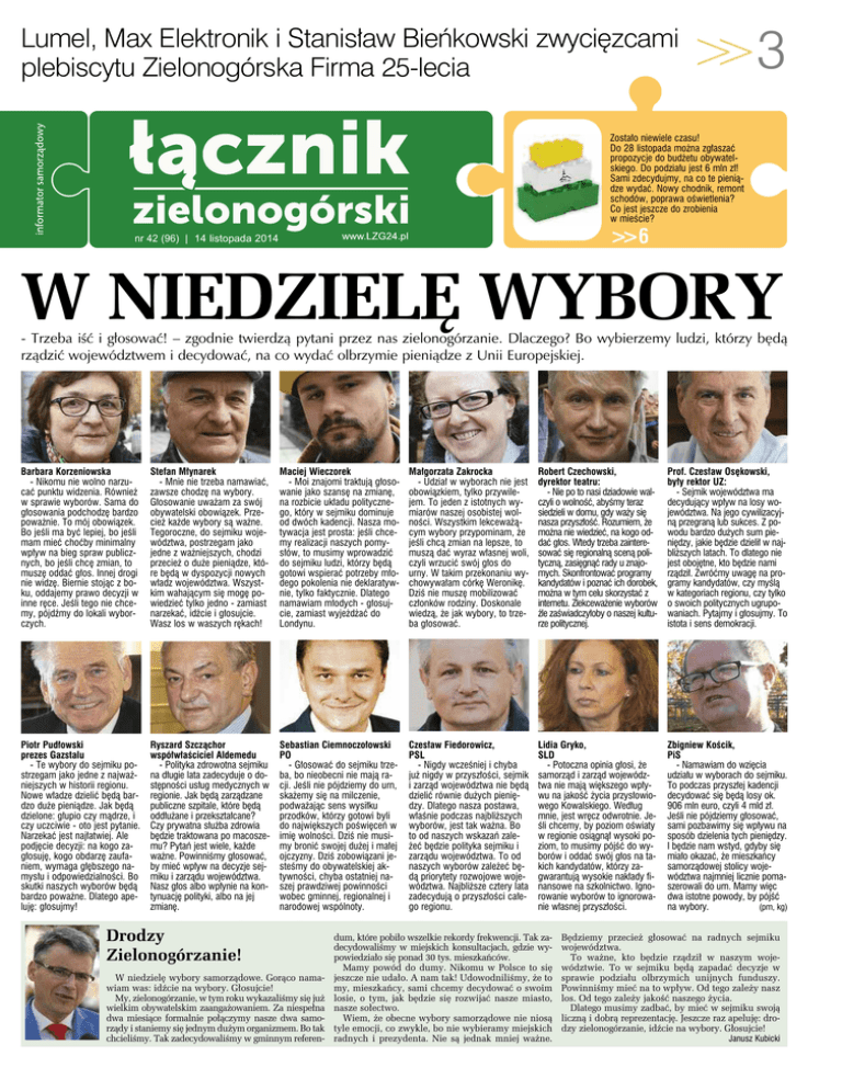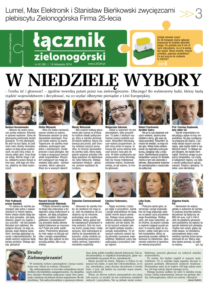 Lumel, Max Elektronik i Stanisław Bieńkowski zwycięzcami plebiscytu Zielonogórska Firma 25-lecia >>3 Zostało niewiele czasu! Do 28 listopada można zgłaszać propozycje do budżetu obywatelskiego. Do podziału jest 6 mln zł! Sami zdecydujmy, na co te pieniądze wydać. Nowy chodnik, remont schodów, poprawa oświetlenia? Co jest jeszcze do zrobienia w mieście? nr 42 (96) | 14 listopada 2014 >>6 W NIEDZIELĘ WYBORY - Trzeba iść i głosować! – zgodnie twierdzą pytani przez nas zielonogórzanie. Dlaczego? Bo wybierzemy ludzi, którzy będą rządzić województwem i decydować, na co wydać olbrzymie pieniądze z Unii Europejskiej. Barbara Korzeniowska - Nikomu nie wolno narzucać punktu widzenia. Również w sprawie wyborów. Sama do głosowania podchodzę bardzo poważnie. To mój obowiązek. Bo jeśli ma być lepiej, bo jeśli mam mieć choćby minimalny wpływ na bieg spraw publicznych, bo jeśli chcę zmian, to muszę oddać głos. Innej drogi nie widzę. Biernie stojąc z boku, oddajemy prawo decyzji w inne ręce. Jeśli tego nie chcemy, pójdźmy do lokali wyborczych. Stefan Młynarek - Mnie nie trzeba namawiać, zawsze chodzę na wybory. Głosowanie uważam za swój obywatelski obowiązek. Przecież każde wybory są ważne. Tegoroczne, do sejmiku województwa, postrzegam jako jedne z ważniejszych, chodzi przecież o duże pieniądze, które będą w dyspozycji nowych władz województwa. Wszystkim wahającym się mogę powiedzieć tylko jedno - zamiast narzekać, idźcie i głosujcie. Wasz los w waszych rękach! Maciej Wieczorek - Moi znajomi traktują głosowanie jako szansę na zmianę, na rozbicie układu politycznego, który w sejmiku dominuje od dwóch kadencji. Nasza motywacja jest prosta: jeśli chcemy realizacji naszych pomysłów, to musimy wprowadzić do sejmiku ludzi, którzy będą gotowi wspierać potrzeby młodego pokolenia nie deklaratywnie, tylko faktycznie. Dlatego namawiam młodych - głosujcie, zamiast wyjeżdżać do Londynu. Małgorzata Zakrocka - Udział w wyborach nie jest obowiązkiem, tylko przywilejem. To jeden z istotnych wymiarów naszej osobistej wolności. Wszystkim lekceważącym wybory przypominam, że jeśli chcą zmian na lepsze, to muszą dać wyraz własnej woli, czyli wrzucić swój głos do urny. W takim przekonaniu wychowywałam córkę Weronikę. Dziś nie muszę mobilizować członków rodziny. Doskonale wiedzą, że jak wybory, to trzeba głosować. Robert Czechowski, dyrektor teatru: - Nie po to nasi dziadowie walczyli o wolność, abyśmy teraz siedzieli w domu, gdy waży się nasza przyszłość. Rozumiem, że można nie wiedzieć, na kogo oddać głos. Wtedy trzeba zainteresować się regionalną sceną polityczną, zasięgnąć rady u znajomych. Skonfrontować programy kandydatów i poznać ich dorobek, można w tym celu skorzystać z internetu. Zlekceważenie wyborów źle zaświadczyłoby o naszej kulturze politycznej. Prof. Czesław Osękowski, były rektor UZ: - Sejmik województwa ma decydujący wpływ na losy województwa. Na jego cywilizacyjną przegraną lub sukces. Z powodu bardzo dużych sum pieniędzy, jakie będzie dzielił w najbliższych latach. To dlatego nie jest obojętne, kto będzie nami rządził. Zwróćmy uwagę na programy kandydatów, czy myślą w kategoriach regionu, czy tylko o swoich politycznych ugrupowaniach. Pytajmy i głosujmy. To istota i sens demokracji. Piotr Pudłowski prezes Gazstalu - Te wybory do sejmiku postrzegam jako jedne z najważniejszych w historii regionu. Nowe władze dzielić będą bardzo duże pieniądze. Jak będą dzielone: głupio czy mądrze, i czy uczciwie - oto jest pytanie. Narzekać jest najłatwiej. Ale podjęcie decyzji: na kogo zagłosuję, kogo obdarzę zaufaniem, wymaga głębszego namysłu i odpowiedzialności. Bo skutki naszych wyborów będą bardzo poważne. Dlatego apeluję: głosujmy! Ryszard Szcząchor współwłaściciel Aldemedu - Polityka zdrowotna sejmiku na długie lata zadecyduje o dostępności usług medycznych w regionie. Jak będą zarządzane publiczne szpitale, które będą oddłużane i przekształcane? Czy prywatna służba zdrowia będzie traktowana po macoszemu? Pytań jest wiele, każde ważne. Powinniśmy głosować, by mieć wpływ na decyzje sejmiku i zarządu województwa. Nasz głos albo wpłynie na kontynuację polityki, albo na jej zmianę. Sebastian Ciemnoczołowski PO - Głosować do sejmiku trzeba, bo nieobecni nie mają racji. Jeśli nie pójdziemy do urn, skażemy się na milczenie, podważając sens wysiłku przodków, którzy gotowi byli do największych poświęceń w imię wolności. Dziś nie musimy bronić swojej dużej i małej ojczyzny. Dziś zobowiązani jesteśmy do obywatelskiej aktywności, chyba ostatniej naszej prawdziwej powinności wobec gminnej, regionalnej i narodowej wspólnoty. Czesław Fiedorowicz, PSL - Nigdy wcześniej i chyba już nigdy w przyszłości, sejmik i zarząd województwa nie będą dzielić równie dużych pieniędzy. Dlatego nasza postawa, właśnie podczas najbliższych wyborów, jest tak ważna. Bo to od naszych wskazań zależeć będzie polityka sejmiku i zarządu województwa. To od naszych wyborów zależeć będą priorytety rozwojowe województwa. Najbliższe cztery lata zadecydują o przyszłości całego regionu. Lidia Gryko, SLD - Potoczna opinia głosi, że samorząd i zarząd województwa nie mają większego wpływu na jakość życia przysłowiowego Kowalskiego. Według mnie, jest wręcz odwrotnie. Jeśli chcemy, by poziom oświaty w regionie osiągnął wysoki poziom, to musimy pójść do wyborów i oddać swój głos na takich kandydatów, którzy zagwarantują wysokie nakłady finansowe na szkolnictwo. Ignorowanie wyborów to ignorowanie własnej przyszłości. Zbigniew Kościk, PiS - Namawiam do wzięcia udziału w wyborach do sejmiku. To podczas przyszłej kadencji decydować się będą losy ok. 906 mln euro, czyli 4 mld zł. Jeśli nie pójdziemy głosować, sami