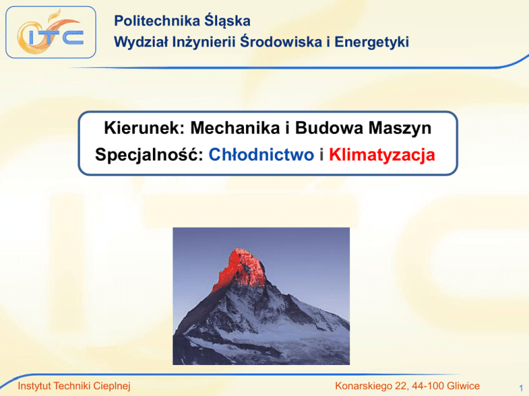 Politechnika Śląska Wydział Inżynierii Środowiska i Energetyki Kierunek: Mechanika i Budowa Maszyn Specjalność: Chłodnictwo i Klimatyzacja Instytut Techniki Cieplnej Konarskiego 22, 44-100 Gliwice 1 Mechanika i Budowa Maszyn Chłodnictwo i Klimatyzacja Profil absolwenta ChiK Eksplorujesz wiedzę z zakresu : ogólnych zasad mechaniki i budowy maszyn chłodnictwa przemysłowego, - działania obiegów lewobieżnych, reguł konstruowania i eksploatacji urządzeń takich jak: sprężarkowe i absorpcyjne agregaty ziębiarkowe, komory chłodnicze oraz chłodnie wody przemysłowej, klimatyzacji, - utrzymania komfortu cieplnego w pomieszczeniach, zasad działania systemów klimatyzacji w obiektach komunalnych i przemysłowych, wykorzystania pomp ciepła, w procesach technologicznych oraz obiektach budowlanych, oceny efektów ekologicznych Instytut Techniki Cieplnej technicznych, ekonomicznych i Konarskiego 22, 44-100 Gliwice 2 Mechanika i Budowa Maszyn Chłodnictwo i Klimatyzacja Czym zajmuje się ChiK ? Projektowaniem innowacyjnych rozwiązań oraz systemów chłodniczych, klimatyzacyjnych i pomp ciepła eksploatacją Modelowaniem i symulacją procesów chłodzenia, ogrzewania, osuszania, nawilżania oraz zamrażania Opracowywaniem inteligentnych energooszczędnych systemów zarządzania energią w chłodnictwie, klimatyzacji oraz technice pomp ciepła Instytut Techniki Cieplnej Konarskiego 22, 44-100 Gliwice 3 Mechanika i Budowa Maszyn Chłodnictwo i Klimatyzacja Czym zajmuje się ChiK ? Analizą i projektowaniem systemów wykorzystujących odnawialne i nieodnawialne źródła energii dla potrzeb chłodnictwa i klimatyzacji Wytwarzaniem nośników zimna, systemami wody chłodzącej dla wielu procesów…… Zastosowaniem kriogeniki np. w medycynie, przemyśle spożywczym, technice skraplania gazów 108,2°C LI02 100 80 AR01 LI01 60 40 20 2,8°C Instytut Techniki Cieplnej Konarskiego 22, 44-100 Gliwice 4 Mechanika i Budowa Maszyn Chłodnictwo i Klimatyzacja W trakcie studiów ChiK zdobywasz umiejętności: Opracowania analiz technicznych i ekonomicznych możliwych do wykonania w wielu gałęziach gospodarki Praktycznych w czasie praktyk, staży u partnerów przemysłowych Korzystania z oprogramowania komputerowego do modelowania, symulacji i projektowania, w tym instalacji chłodniczych oraz klimatyzacyjnych Praktycznych poprzez prowadzenie badań eksperymentalnych na stanowiskach laboratoryjnych, w tym do dyspozycji specjalistyczne Laboratorium Chłodnictwa Instytut Techniki Cieplnej Konarskiego 22, 44-100 Gliwice 5 Mechanika i Budowa Maszyn Chłodnictwo i Klimatyzacja Laboratorium Chłodnictwa Instytut Techniki Cieplnej Konarskiego 22, 44-100 Gliwice 6 Mechanika i Budowa Maszyn Chłodnictwo i Klimatyzacja Możliwości rozwoju zainteresowań Aktywność w kole naukowy Studenckie Koło Naukowe Techniki Cieplnej im. prof. Stanisława Ochęduszki Wyjazdy zagraniczne Program ERASMUS Praktyki, dyplomy i staże Sektor przemysłowy Sektor usługowy Instytut Techniki Cieplnej Konarskiego 22, 44-100 Gliwice 7 Mechanika i Budowa Maszyn Chłodnictwo i Klimatyzacja Po studiach ChiK możesz zdobyć zatrudnienie jako: inżynier/projektant urządzeń i systemów chłodniczych, chłodni, systemów klimatyzacyjnych, pomp ciepła również z wykorzystaniem odnawialnych źródeł energii inżynier w przedsiębiorstwach nadzorujących wykonanie, obsługę oraz eksploatację urządzeń w tym przemysłowych instalacji chłodniczych, instalacji klimatyzacji obiektów komunalnych i przemysłowych oraz pomp ciepła Instytut Techniki Cieplnej Konarskiego 22, 44-100 Gliwice 8 Mechanika i Budowa Maszyn Chłodnictwo i Klimatyzacja Po studiach ChiK możesz zdobyć zatrudnienie jako: inżynier doradztwa technicznego z zakresu racjonalnego wykorzystania układów chłodniczych, klimatyzacyjnych oraz pomp ciepła w obiektach budowlanych inżynier audytowania obiektów komunalnych i przemysłowych oraz współpracujących z nimi urządzeń i instalacji w zakresie ciepłownictwa, chłodnictwa, klimatyzacji, pomp ciepła z uwzględnieniem problematyki ochrony środowiska Instytut Techniki Cieplnej Konarskiego 22, 44-100 Gliwice 9 Mechanika i Budowa Maszyn Chłodnictwo i Klimatyzacja Z kim zajęcia ? Pracownicy Zakładu Termodynamiki, Gospodarki Energetyczne i Chłodnictwa ITC Pracownicy innych jednostek Wydziału IŚiE Opiekun ChiK dr hab. inż. Wiesław Gazda Instytut Techniki Cieplnej p. C-214/1 wiesł[email protected] Instytut Techniki Cieplnej Konarskiego 22, 44-100 Gliwice 10 Politechnika Śląska Wydział Inżynierii Środowiska i Energetyki Kierunek: Mechanika i Budowa Maszyn Specjalność: Chłodnictwo i Klimatyzacja Zapraszamy ! Instytut Techniki Cieplnej Konarskiego 22, 44-100 Gliwice 11