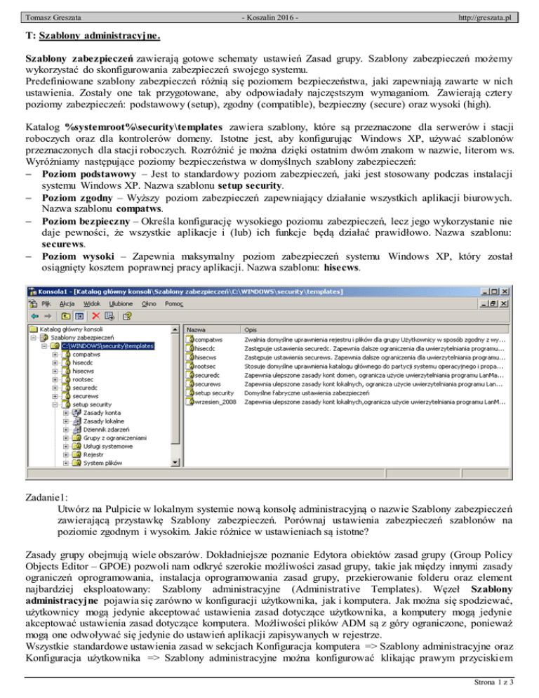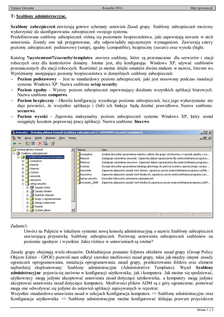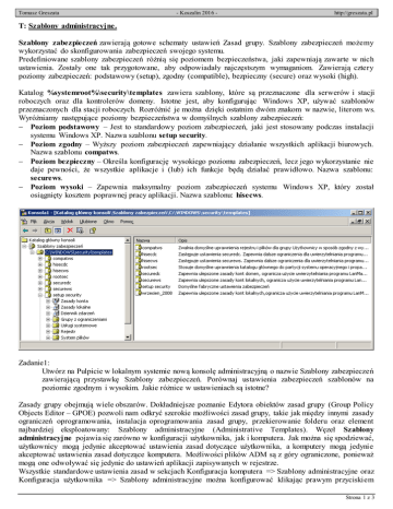 Tomasz Greszata - Koszalin 2016 - http://greszata.pl T: Szablony administracyjne. Szablony zabezpieczeń zawierają gotowe schematy ustawień Zasad grupy. Szablony zabezpieczeń możemy wykorzystać do skonfigurowania zabezpieczeń swojego systemu. Predefiniowane szablony zabezpieczeń różnią się poziomem bezpieczeństwa, jaki zapewniają zawarte w nich ustawienia. Zostały one tak przygotowane, aby odpowiadały najczęstszym wymaganiom. Zawierają cztery poziomy zabezpieczeń: podstawowy (setup), zgodny (compatible), bezpieczny (secure) oraz wysoki (high). Katalog %systemroot%\security\templates zawiera szablony, które są przeznaczone dla serwerów i stacji roboczych oraz dla kontrolerów domeny. Istotne jest, aby konfigurując Windows XP, używać szablonów przeznaczonych dla stacji roboczych. Rozróżnić je można dzięki ostatnim dwóm znakom w nazwie, literom ws. Wyróżniamy następujące poziomy bezpieczeństwa w domyślnych szablony zabezpieczeń: Poziom podstawowy – Jest to standardowy poziom zabezpieczeń, jaki jest stosowany podczas instalacji systemu Windows XP. Nazwa szablonu setup security. Poziom zgodny – Wyższy poziom zabezpieczeń zapewniający działanie wszystkich aplikacji biurowych. Nazwa szablonu compatws. Poziom bezpieczny – Określa konfigurację wysokiego poziomu zabezpieczeń, lecz jego wykorzystanie nie daje pewności, że wszystkie aplikacje i (lub) ich funkcje będą działać prawidłowo. Nazwa szablonu: securews. Poziom wysoki – Zapewnia maksymalny poziom zabezpieczeń systemu Windows XP, który został osiągnięty kosztem poprawnej pracy aplikacji. Nazwa szablonu: hisecws. Zadanie1: Utwórz na Pulpicie w lokalnym systemie nową konsolę administracyjną o nazwie Szablony zabezpieczeń zawierającą przystawkę Szablony zabezpieczeń. Porównaj ustawienia zabezpieczeń szablonów na poziomie zgodnym i wysokim. Jakie różnice w ustawieniach są istotne? Zasady grupy obejmują wiele obszarów. Dokładniejsze poznanie Edytora obiektów zasad grupy (Group Policy Objects Editor – GPOE) pozwoli nam odkryć szerokie możliwości zasad grupy, takie jak między innymi zasady ograniczeń oprogramowania, instalacja oprogramowania zasad grupy, przekierowanie folderu oraz element najbardziej eksploatowany: Szablony administracyjne (Administrative Templates). Węzeł Szablony administracyjne pojawia się zarówno w konfiguracji użytkownika, jak i komputera. Jak można się spodziewać, użytkownicy mogą jedynie akceptować ustawienia zasad dotyczące użytkownika, a komputery mogą jedynie akceptować ustawienia zasad dotyczące komputera. Możliwości plików ADM są z góry ograniczone, ponieważ mogą one odwoływać się jedynie do ustawień aplikacji zapisywanych w rejestrze. Wszystkie standardowe ustawienia zasad w sekcjach Konfiguracja komputera => Szablony administracyjne oraz Konfiguracja użytkownika => Szablony administracyjne można konfigurować klikając prawym przyciskiem Strona 1 z 3 Tomasz Greszata - Koszalin 2016 - http://greszata.pl myszy węzeł Szablony administracyjne (Administrative Templates) w edytorze GPOE i wybierzemy opcję Dodaj/Usuń szablony (Add/Remove Templates) dla konfiguracji użytkownika lub komputera. Domyślne szablony administracyjne zapisane są w następujących plikach (w katalogu c:\windows\inf): Conf.adm – ustawienia aplikacji NetMeeting®. Inetres.adm – ustawienia przeglądarki Internet Explorer, w tym ustawienia połączeń i pasków narzędzi. Ustawienia te stanowią ekwiwalent wielu opcji, które są dostępne po kliknięciu menu Opcje internetowe (Internet Options) w programie Internet Explorer. System.adm – modyfikacje i ustawienia systemu operacyjnego. W tym szablonie ADM znajduje się większość szablonów administracyjnych użytkownika oraz komputera. Wmplayer.adm – ustawienia aplikacji Windows Media® Player 9. Wuau.adm – kontroluje kliencki dostęp do serwerów Windows Update oraz/lub Windows Server Update Services. Pliki ADM oraz ADMX są niebywale przydatne. Można wykorzystywać je do umieszczania wybranych informacji w pliku definicji i kontrolowania aplikacji docelowej. Jednak pliki ADM oraz ADMX mają pewne ograniczenia. W szczególności nie mogą: Nie mogą uzyskiwać dostępu do gałęzi rejestru innych niż HKEY_LOCAL_MACHINE oraz HKEY_Current_User. Przy pomocy plików ADM oraz ADMX nie można zatem realizować zadań wymagających dostępu do innych gałęzi rejestru. Nie mogą wykonywać operacji dodawania dla wartości REG_Binary. Nie można specjalnie ustawić dla nich opcji "uruchom tylko raz". Nie można specjalnie ustawić dla nich opcji "zawsze stosuj ponownie" podczas odświeżania zasady grupy. Pliki ADM oraz ADMX pozostawiają w efekcie zapisu ślady w nieprawidłowych kluczach rejestru. Dlatego wartość pozostanie, nawet jeśli użytkownik przestanie być objęty zakresem zarządzania (SOM) lub obiekt GPO zostanie usunięty. Strona 2 z 3 Tomasz Greszata - Koszalin 2016 - http://greszata.pl Przeglądanie szablonów ADM wcale nie jest takie trudne. Domyślnie edytor nie pokazuje dodanych ustawień, ale możemy szybko to naprawić. Wystarczy, że klikniemy węzeł Szablony administracyjne (Administrative Templates) w obszarze konfiguracji użytkownika lub komputera, a następnie wybierzemy opcję Widok (View) | Filtrowanie (Filtering). Na zakończenie odznaczymy (tak odznaczymy) opcję "Pokaż tylko ustawienia zasad, którymi można zarządzać w sposób pełny" (Only show policy settings that can be fully manager). Plik ADM jest umieszczany w Szablonie zasad grupy (Group Policy Template - GPT), czyli części obiektu GPO znajdującej się w folderze SYSVOL. W konsekwencji za każdym razem gdy tworzymy obiekt GPO, zużywamy około 4MB na każdym kontrolerze domeny. Co więcej, plik ADM jest umieszczany w szablonie GPT obiektu GPO, ponieważ jest niezbędny, gdy chcemy dokonać edycji obiektu GPO na innej stacji zarządzającej. Bez tego pliku ADM nie moglibyśmy