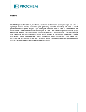 Historia PROCHEM powstał w 1947 r. jako biuro projektowe budownictwa przemysłowego. Od 1971 r. wykonuje również roboty budowlane jako generalny realizator inwestycji. W 1991 r. został przekształcony w spółkę akcyjną i po kolejnych emisjach akcji w 1994 r. zadebiutował na Warszawskiej Giełdzie Papierów Wartościowych. W 1996 r. PROCHEM rozpoczął budowę grupy kapitałowej poprzez zakup udziałów w firmach inżynierskich i wykonawczych. Obecnie obejmuje ona kilkanaście wyspecjalizowanych spółek, które działają w następujących obszarach: usługi inżynierskie, usługi deweloperskie, usługi zarządzania nieruchomościami, inne usługi (np. informatyczne, konsulting techniczny). Struktura grupy kapitałowej umożliwia podejmowanie dużych i skomplikowanych przedsięwzięć inwestycyjnych.