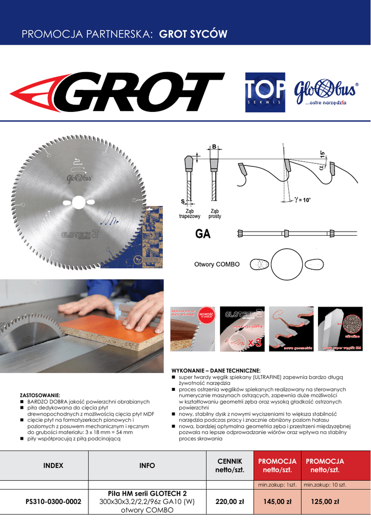 PROMOCJA PARTNERSKA: GROT SYCÓW nowe w yciszenie x3 nowe w yciszenie x3 Dedykowana do: Sã\W \ZLyURZHM nowa geometria 0191Ćæ W OFERCIE nowe w yciszenie x3 ultrafine nowa geometria QRZ \VXSHUZčJOLN+0 WYKONANIE – DANE TECHNICZNE: ZASTOSOWANIE: BARDZO DOBRA jakość powierzchni obrabianych piła dedykowana do cięcia płyt drewnopochodnych z możliwością cięcia płyt MDF cięcie płyt na formatyzerkach pionowych i poziomych z posuwem mechanicznym i ręcznym do grubości materiału: 3 x 18 mm = 54 mm piły współpracują z piłą podcinającą super twardy węglik spiekany (ULTRAFINE) zapewnia bardzo długą ultrafine żywotność narzędzia proces ostrzenia węglików spiekanych realizowany na sterowanych nowa geometria QRZ \VXSHUZčJOLN+0 numerycznie maszynach ostrzących, zapewnia duże możliwości w kształtowaniu geometrii zęba oraz wysoką gładkość ostrzonych powierzchni nowy, stabilny dysk z nowymi wyciszeniami to większa stabilność narzędzia podczas pracy i znacznie obniżony poziom hałasu nowa, bardziej optymalna geometria zęba i przestrzeni międzyzębnej ultrafine pozwala na lepsze odprowadzanie wiórów oraz wpływa na stabilny proces skrawania QRZ \VXSHUZčJOLN+0 INDEX INFO PS310-0300-0002 Piła HM serii GLOTECH 2 300x30x3,2/2,2/96z GA10 (W) otwory COMBO CENNIK netto/szt. 220,00 zł PROMOCJA netto/szt. PROMOCJA netto/szt. min.zakup: 1szt. min.zakup: 10 szt. 145,00 zł 125,00 zł KUPUJĄC NARZĘDZIA W PROMOCJI OTRZYMASZ OD NAS USŁUGĘ OSTRZENIA 1 PIŁY ZA JEDYNE 12 ZŁ netto „G R O T” Grzegorz Faltyn Nowy Dwór 4A, 56-500 Syców e-mail: [email protected] Tel.: 062 785 27 44 Kom.: +48 660 751 498