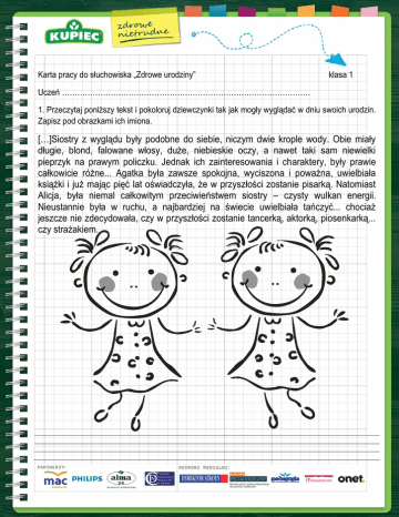 Karta pracy do słuchowiska „Zdrowe urodziny” klasa 1 Uczeń ……………………………………………………………………………………. 1. Przeczytaj poniższy tekst i pokoloruj dziewczynki tak jak mogły wyglądać w dniu swoich urodzin. Zapisz pod obrazkami ich imiona. […]Siostry z wyglądu były podobne do siebie, niczym dwie krople wody. Obie miały długie, blond, falowane włosy, duże, niebieskie oczy, a nawet taki sam niewielki pieprzyk na prawym policzku. Jednak ich zainteresowania i charaktery, były prawie całkowicie różne... Agatka była zawsze spokojna, wyciszona i poważna, uwielbiała książki i już mając pięć lat oświadczyła, że w przyszłości zostanie pisarką. Natomiast Alicja, była niemal całkowitym przeciwieństwem siostry – czysty wulkan energii. Nieustannie była w ruchu, a najbardziej na świecie uwielbiała tańczyć... chociaż jeszcze nie zdecydowała, czy w przyszłości zostanie tancerką, aktorką, piosenkarką... czy strażakiem. 1. Ponumeruj miseczki ze zdrowymi przekąskami pokoloruj na niebiesko miseczki z liczbami większymi od 3 i mniejszymi od 7; pokoloruj na czerwono miseczki z liczbami większymi od 6 i mniejszymi od 12; pokoloruj na zielono miseczki z liczbami większymi od 11; pozostałe miseczki pokoloruj na żółto. Oblicz ile jest razem miseczek niebieskich i czerwonych? Oblicz ile jest razem miseczek żółtych i niebieskich ? Oblicz ile jest razem miseczek czerwonych i zielonych? Oblicz ile jest razem miseczek niebieskich, żółtych i zielonych? Oblicz ile jest razem miseczek czerwonych, niebieskich i zielonych? Oblicz o ile więcej jest miseczek czerwonych niż niebieskich? Napisz jakich miseczek jest więcej: zielonych czy żółtych? 2. Oblicz zadania z treścią. Ala i Agatka zaprosiły na swoje urodziny 6 chłopców i 5 dziewczynek. Ile dzieci bawiło się na urodzinach bliźniaczek? Mama razem z bliźniaczkami przygotowywały przyjęcie urodzinowe od godz. 11.00 przed południem do godz. 14.00. Ile godzin to robiły?
