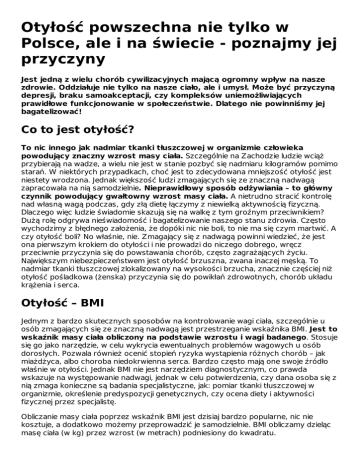 Otyłość powszechna nie tylko w Polsce, ale i na świecie - poznajmy jej przyczyny Jest jedną z wielu chorób cywilizacyjnych mającą ogromny wpływ na nasze zdrowie. Oddziałuje nie tylko na nasze ciało, ale i umysł. Może być przyczyną depresji, braku samoakceptacji, czy kompleksów uniemożliwiających prawidłowe funkcjonowanie w społeczeństwie. Dlatego nie powinniśmy jej bagatelizować! Co to jest otyłość? To nic innego jak nadmiar tkanki tłuszczowej w organizmie człowieka powodujący znaczny wzrost masy ciała. Szczególnie na Zachodzie ludzie wciąż przybierają na wadze, a wielu nie jest w stanie pozbyć się nadmiaru kilogramów pomimo starań. W niektórych przypadkach, choć jest to zdecydowana mniejszość otyłość jest niestety wrodzona. Jednak większość ludzi zmagających się ze znaczną nadwagą zapracowała na nią samodzielnie. Nieprawidłowy sposób odżywiania – to główny czynnik powodujący gwałtowny wzrost masy ciała. A nietrudno stracić kontrolę nad własną wagą podczas, gdy złą dietę łączymy z niewielką aktywnością fizyczną. Dlaczego więc ludzie świadomie skazują się na walkę z tym groźnym przeciwnikiem? Dużą rolę odgrywa nieświadomość i bagatelizowanie naszego stanu zdrowia. Często wychodzimy z błędnego założenia, że dopóki nic nie boli, to nie ma się czym martwić. A czy otyłość boli? No właśnie, nie. Zmagający się z nadwagą powinni wiedzieć, że jest ona pierwszym krokiem do otyłości i nie prowadzi do niczego dobrego, wręcz przeciwnie przyczynia się do powstawania chorób, często zagrażających życiu. Największym niebezpieczeństwem jest otyłość brzuszna, zwana inaczej męską. To nadmiar tkanki tłuszczowej zlokalizowany na wysokości brzucha, znacznie częściej niż otyłość pośladkowa (żenska) przyczynia się do powikłań zdrowotnych, chorób układu krążenia i serca. Otyłość – BMI Jednym z bardzo skutecznych sposobów na kontrolowanie wagi ciała, szczególnie u osób zmagających się ze znaczną nadwagą jest przestrzeganie wskaźnika BMI. Jest to wskaźnik masy ciała obliczony na podstawie wzrostu i wagi badanego. Stosuje się go jako narzędzie, w celu wykrycia ewentualnych problemów wagowych u osób dorosłych. Pozwala również ocenić stopień ryzyka wystąpienia różnych chorób – jak miażdżyca, albo choroba niedokrwienna serca. Bardzo często mają one swoje źródło właśnie w otyłości. Jednak BMI nie jest narzędziem diagnostycznym, co prawda wskazuje na występowanie nadwagi, jednak w celu potwierdzenia, czy dana osoba się z nią zmaga konieczne są badania specjalistyczne, jak: pomiar tkanki tłuszczowej w organizmie, określenie predyspozycji genetycznych, czy ocena diety i aktywności fizycznej przez specjalistę. Obliczanie masy ciała poprzez wskaźnik BMI jest dzisiaj bardzo popularne, nic nie kosztuje, a dodatkowo możemy przeprowadzić je samodzielnie. BMI obliczamy dzieląc masę ciała (w kg) przez wzrost (w metrach) podniesiony do kwadratu. BMI = waga (kg) /wzrost²( m²) Poznanie własnego wskaźnika BMI jest ważne, przede wszystkim ze względów zdrowotnych. Jeśli pomiar wskazuje na nadwagę oznacza to, że zagraża nam ryzyko wystąpienia chorób współistniejących (miażdżyca, choroba niedokrwienna serca, nowotwory). W przypadku I, II i III stopnia otyłości ryzyko zachorowania wzrasta. Otyłość w Polsce Otyłość wśród Polaków jest coraz większym problemem. Jak się okazuje, częściej zmagają się z nim kobiety. Z badań przeprowadzonych przez Światową Organizację Zdrowia w 2008 roku dowiadujemy się, że Polki zajmują wysokie, bo 131 miejsce w światowym rankingu otyłości. Statystyki są przerażające – co 5 Polak cierpi na tą przypadłość. Jednak bardziej niepokojący jest fakt, że kwestia otyłości coraz częściej dotyka również dzieci. Pamiętajmy, że w przypadku naszych pociech nadmierna nadwaga jest szczególnie niebezpieczna. Niestety, często nieświadomi rodzice nie potrafią odmówić swoim dzieciom słodyczy, czy ulubionych chipsów, dostarczając im tym samym ogromne ilości cukru, co oczywiście przyczynia się do znacznego wzrostu wagi. Powinniśmy pamiętać, że otyłość dziecięca kilkakrotnie zwiększa ryzyko wystąpienia cukrzycy, zawałów czy wylewu w dorosłym życiu. Otyłość na Świecie Otyłość to choroba cywilizacyjna XXI wieku. Według Badań Światowej Organizacji Zdrowia (WHO) na Świecie żyje ponad 520 mln osób otyłych, a ponad 1,5 miliarda cierpi na nadwagę. Jak widać, z tym problemem zmaga się spory odsetek ludzkości. Najwyższy wskaźnik otyłości można zaobserwować w Ameryce Północnej i Australii. W Stanach Zjednoczonych żyje już ponad 37 % osób otyłych. Prognozy mówią, że w przyszłości liczba ta będzie wzrastać i może osiągnąć nawet 50 %. Niestety, Europejczycy powoli depczą po piętach Amerykanom. Co prawda, na naszym kontynencie problem otyłości nie jest tak poważny, jednak ciągle wzrasta, co powinno być dla nas wystarczającym powodem do zaniepokojenia. Otyłość – przyczyny Powszechnie znany jest fakt, iż największy wpływ na przyrost wagi ciała ma nieprawidłowa dieta. I jest to prawda. Brak czasu powoduje, że jemy „na szybko” nie zastanawiając się nawet co trafia na nasze talerze. Jemy za dużo, za tłusto i niestety bezmyślnie. Spożywanie przez nas pokarmów wysokokalorycznych, a także mała ilość posiłków w ciągu dnia, może przyczyniać się do wzrostu cholesterolu, czy zaburzenia przyswajalności węglowodanów, a w efekcie odkładania się tkanki tłuszczowej w organizmie. Kwestia zdrowego odżywiania w Polsce wciąż jest mało popularna, aczkolwiek optymizmem napawa fakt, że na przestrzeni ostatnich paru lat można zaobserwować wzrost świadomości wśród polskiego społeczeństwa. Powszechnie znany jest fakt, iż największy wpływ na przyrost wagi ciała ma nieprawidłowa dieta. Nau