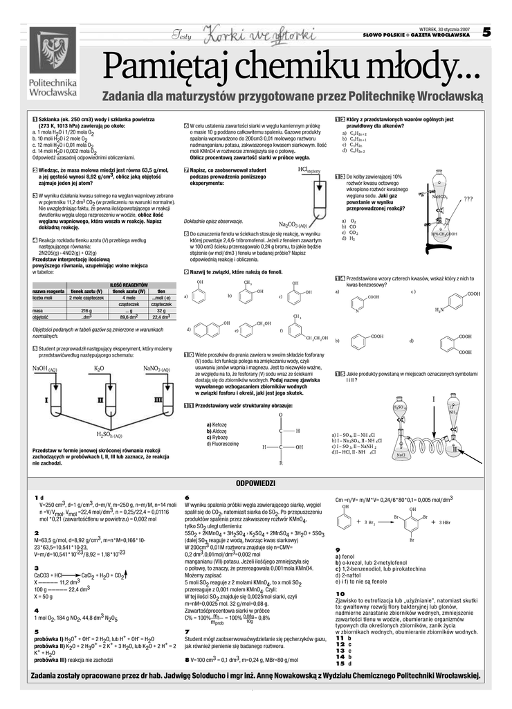 WTOREK, 30 stycznia 2007 SŁOWO POLSKIE M GAZETA WROCŁAWSKA Testy 5 Pamiętaj chemiku młody... Zadania dla maturzystów przygotowane przez Politechnikę Wrocławską 1 Szklanka (ok. 250 cm3) wody i szklanka powietrza (273 K, 1013 hPa) zawierają po około: a. 1 mola H2O i 1/20 mola O2 b. 10 moli H2O i 2 mole O2 c. 12 moli H2O i 0,01 mola O2 d. 14 moli H2O i 0,002 mola O2 Odpowiedź uzasadnij odpowiednimi obliczeniami. 6 W celu ustalenia zawartości siarki w węglu kamiennym próbkę o masie 10 g poddano całkowitemu spaleniu. Gazowe produkty spalania wprowadzono do 200cm3 0,01 molowego roztworu nadmanganianu potasu, zakwaszonego kwasem siarkowym. Ilość moli KMnO4 w roztworze zmniejszyła się o połowę. Oblicz procentową zawartość siarki w próbce węgla. 2 Wiedząc, że masa molowa miedzi jest równa 63,5 g/mol, a jej gęstość wynosi 8,92 g/cm3, oblicz jaką objętość zajmuje jeden jej atom? 7 Napisz, co zaobserwował student podczas prowadzenia poniższego eksperymentu: 3 W wyniku działania kwasu solnego na węglan wapniowy zebrano w pojemniku 11,2 dm3 CO2 (w przeliczeniu na warunki normalne). Nie uwzględniając faktu, że pewna ilość powstającego w reakcji dwutlenku węgla ulega rozproszeniu w wodzie, oblicz ilość węglanu wapniowego, która weszła w reakcję. Napisz dokładną reakcję. 4 Reakcja rozkładu tlenku azotu (V) przebiega według następującego równania: 2N2O5(g) › 4NO2(g) + O2(g) Przedstaw interpretację ilościową powyższego równania, uzupełniając wolne miejsca w tabelce: nazwa reagenta tlenek azotu (V) liczba moli 2 mole cząsteczek masa objętość 216 g ..dm3 Dokładnie opisz obserwacje. HClstężony 12 Który z przedstawionych wzorów ogólnych jest prawidłowy dla alkenów? 13 Do kolby zawierającej 10% roztwór kwasu octowego wkroplono roztwór kwaśnego węglanu sodu. Jaki gaz powstanie w wyniku przeprowadzonej reakcji? Na2CO3 (AQ) 8 Do oznaczenia fenolu w ściekach stosuje się reakcję, w wyniku której powstaje 2,4,6- tribromofenol. Jeżeli z fenolem zawartym w 100 cm3 ścieku przereagowało 0,24 g bromu, to jakie będzie stężenie (w mol/dm3 ) fenolu w badanej próbie? Napisz odpowiednią reakcję i obliczenia. 9 Nazwij te związki, które należą do fenoli. ILOŚĆ REAGENTÓW tlenek azotu (IV) tlen 4 mole ...moli (-e) cząsteczek cząsteczek ... g 32 g 89,6 dm2 22,4 dm3 14 Przedstawiono wzory czterech kwasów, wskaż który z nich to kwas benzoesowy? Objętości podanych w tabeli gazów są zmierzone w warunkach normalnych. 5 Student przeprowadził następujący eksperyment, który możemy przedstawić według następującego schematu: NaOH (AQ) K2O NaNO3 (AQ) 10 Wiele proszków do prania zawiera w swoim składzie fosforany (V) sodu. Ich funkcja polega na zmiękczaniu wody, czyli usuwaniu jonów wapnia i magnezu. Jest to niezwykle ważne, ze względu na to, że fosforany (V) sodu wraz ze ściekami dostają się do zbiorników wodnych. Podaj nazwę zjawiska wywołanego wzbogacaniem zbiorników wodnych w związki fosforu i określ, jaki jest jego skutek. 15 Jakie produkty powstaną w miejscach oznaczonych symbolami I i II ? 11 Przedstawiony wzór strukturalny obrazuje: H2SOh (AQ) Przedstaw w formie jonowej skróconej równania reakcji zachodzących w probówkach I, II, III lub zaznacz, że reakcja nie zachodzi. a) Ketozę b) Aldozę c) Rybozę d) Fluoresceinę ODPOWIEDZI 1d V=250 cm3, d=1 g/cm3, d=m/V, m=250 g, n=m/M, n=14 moli n =V/Vmol, Vmol =22,4 mol/dm3, n = 0,25/22,4 = 0,01116 mol *0,21 (zawartość tlenu w powietrzu) = 0,002 mol 2 M=63,5 g/mol, d=8,92 g/cm3, m=n*M=0,166*1023*63,5=10,541*10-23, V=m/d=10,541*10-23/8,92 = 1,18*10-23 3 CaCO3 + HCl CaCl2 + H2O + CO2 X ————— 11,2 dm3 100 g ————— 22,4 dm3 X = 50 g 4 1 mol O2, 184 g NO2, 44,8 dm3 N2O5 5 probówka I) H3O+ + OH- = 2 H2O, lub H+ + OH- = H2O probówka II) K2O + 2 H3O+ = 2 K+ + 3 H2O, lub K2O + 2 H+ = 2 K+ + H2O probówka III) reakcja nie zachodzi 6 W wyniku spalenia próbki węgla zawierającego siarkę, węgiel spalił się do CO2, natomiast siarka do SO2. Po przepuszczeniu produktów spalenia przez zakwaszony roztwór KMnO4, tylko SO2 uległ utlenieniu: 5SO2 + 2KMnO4 + 3H2SO4 › K2SO4 + 2MnSO4 + 3H2O + 5SO3 (dalej SO3 reaguje z wodą, tworząc kwas siarkowy) W 200cm3 0,01M roztworu znajduje się n=CMV= 0,2 dm3.0,01mol/dm3=0,002 mol manganianu (VII) potasu. Jeżeli ilość jego zmniejszyła się o połowę, to znaczy, że przereagowała 0,001mola KMnO4. Możemy zapisać: 5 moli SO2 reaguje z 2 molami KMnO4, to x moli SO2 przereaguje z 0,001 molem KMnO4. Czyli: W tej ilości SO2 znajduje się 0,0025mol siarki, czyli m=nM=0,0025 mol. 32 g/mol=0,08 g. Zawartość procentowa siarki w próbce = 0,8% C% = 100% ms = 100% 0,08g 10g mprob 7 Student mógł zaobserwować wydzielanie się pęcherzyków gazu, jak również pienienie się badanego roztworu. 8 V=100 cm3 = 0,1 dm3, m=0,24 g, MBr=80 g/mol Cm =n/V= m/M*V= 0,24/6*80*0,1= 0,005 mol/dm3 9 a) fenol b) o-krezol, lub 2-metylofenol c) 1,2-benzenodiol, lub pirokatechina d) 2-naftol e) i f) to nie są fenole 10 Zjawisko to eutrofizacja lub „użyźnianie”, natomiast skutki to: gwałtowny rozwój flory bakteryjnej lub glonów, nadmierne zarastanie zbiorników wodnych, zmniejszenie zawartości tlenu w wodzie, obumieranie organizmów typowych dla określonych zbiorników, zanik życia w zbiornikach wodnych, obumieranie zbiorników wodnych. 11 b 12 c 13 c 14 b 15 d Zadania zostały opracowane przez dr hab. Jadwigę Soloducho i mgr inż. Annę Nowakowską z Wydziału Chemicznego Politechniki Wrocławskiej.