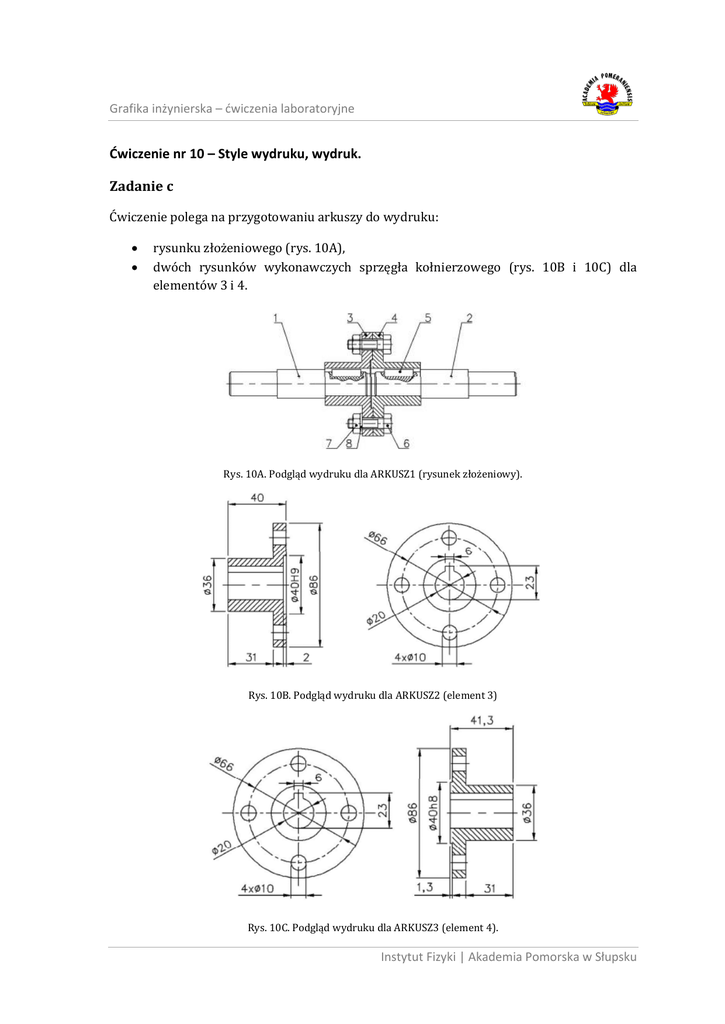 Grafika inżynierska – ćwiczenia laboratoryjne Ćwiczenie nr 10 – Style wydruku, wydruk. Zadanie c Ćwiczenie polega na przygotowaniu arkuszy do wydruku: rysunku złożeniowego (rys. 10A), dwóch rysunków wykonawczych sprzęgła kołnierzowego (rys. 10B i 10C) dla elementów 3 i 4. Rys. 10A. Podgląd wydruku dla ARKUSZ1 (rysunek złożeniowy). Rys. 10B. Podgląd wydruku dla ARKUSZ2 (element 3) Rys. 10C. Podgląd wydruku dla ARKUSZ3 (element 4). Instytut Fizyki | Akademia Pomorska w Słupsku Grafika inżynierska – ćwiczenia laboratoryjne 1. W pierwszym etapie należy wczytać model sprzęgła. Model jest wykonany „obiektowo”, tzn. każdy z elementów jest wykonany w całości na osobnych warstwach. Umożliwia to uzyskanie zarówno rysunków wykonawczych poszczególnych elementów, jak i rysunku złożeniowego całego zespołu. Dla każdego z elementów istnieje kilka warstw, np. dla tarczy sprzęgła oznaczonej jako element 3 (Rys. 10B) powstały warstwy: tarcza_3_kresk – kreskowanie przekroju tarczy, tarcza_3_wid – warstwa przeznaczona na widoczne krawędzie tarczy w rysunku złożeniowym i wykonawczym, tarcza_3_niewid – warstwa przeznaczona na niewidoczne krawędzie w rysunku złożeniowym. Podział obiektu (użycie warstw) na elementy widoczne i niewidoczne na rysunku złożeniowym ma umożliwić uzyskanie prawidłowego rysunku złożeniowego, w którym część fragmentów danego elementu jest przesłonięta przez inne elementy, przez wyłączenie w rysunku złożeniowym warstwy z dopiskiem „_niewid”. Przez pokazanie obu warstw możliwie jest uzyskanie kompletnego elementu wykonawczego danego elementu. 2. Przejdź na zakładkę Układ1/Arkusz1 i usuń widoczną rzutnię, tzn. zaznacz i skasuj. 3. Przejdź do ustawień strony, a za pomocą przycisku Zmień przejdź do okna, w którym można ustawić format kartki a A4 oraz wybrać drukarkę, np. PDFCreator. 4. Przejdź na warstwę przeznaczoną do rysowania rzutni i utwórz jedną nową rzutnię. Jeżeli rzutnia nie została skasowana, to można tylko zmienić warstwę, na której się znajduje. 5. W rzutni wyłącz widoczność niepotrzebnych warstw (opcja Zablokuj w aktywnej rzutni). W przypadku rysunku złożeniowego zablokuj warstwy: tarcza_3_niewid, tarcza_4_niewid, wał_1_niewid, wał_2_niewid, jeżeli dana warstwa istnieje, oraz ustaw podziałkę na 1:1. Uzyskaj widok jak na rysunku 10A. 6. Przejdź na kolejny arkusz. usuń widoczną rzutnię. Na warstwie przeznaczonej do rysowania rzutni utwórz układ pionowy dwóch rzutni. W lewej rzutni uzyskaj widok przekroju elementu (3), tzn. wyłącz (opcja Zablokuj w aktywnej rzutni) wszystkie warstwy dotyczące elementów (1)-(8). Zostaw jednak niezablokowane wszystkie warstwy dotyczące tarczy 3. W rzutni prawej wystarczy tylko wykadrować widok na widok czołowy znajdujący się z prawej strony modelu. Ustaw podziałkę w obu rzutniach na 1:1 – uzyskaj kład jak na rys. 10B. 7. Utwórz nowy arkusz (układ) dla elementu (4). Powtórz czynność z punktu poprzedniego, z tym, że w lewej rzutni należy pokazać widok czołowy tarczy, a w prawej przekrój – w rzutni tej zablokuj wszystkie warstwy niezwiązane z elementem 4 (rys. 10C). 8. Wyrównaj położenie rzutów poleceniem mvsetup z opcją dopasuj oraz podopcją poziomo. Polecenie mvsetup usuwa wszystkie ustawienia w zakładce Obiekt, w trakcie realizacji polecenia należy na nowo wybrać odpowiedni tryb lokalizacji (Koniec, Przecięcie). Instytut Fizyki | Akademia Pomorska w Słupsku Grafika inżynierska – ćwiczenia laboratoryjne 9. Utwórz nowy styl wymiarowania. Na warstwie przeznaczonej na wymiarowanie wykonaj wymiarowanie poszczególnych elementów w obszarze papieru (rys. 10B i 10C), a na warstwie przeznaczonej na opisy, na obszarze papieru rysunku złożeniowego dodaj potrzebne opisy (rys. 10A) na warstwie przeznaczonej na opisy. 10. Przejdź do ustawień strony poleceniem ustawieniastr (lub wywołaniem Menedżera ustawień strony z menu plik/ z menu kontekstowego arkusza). Za pomocą przycisku Zmień dla bieżącego arkusza przejdź do okna menedżera, w którym w panelu Tablica stylów wydruku (przyp. pisaków) utwórz nowy styl, wybierając pozycję Nowy…. Nową tabelę stylów wydruku zdefiniuj w oparciu o standard (pozycja Rozpocznij od podstaw). Jako nazwę pliku wpisz cztery litery oznaczające początek imienia i nazwiska (2 pierwsze imienia i 2 pierwsze nazwiska). Następnie użyj przycisku Edytor tablicy stylów wydruku i dodaj dwa style: „Gruby” i „Cienki”. Styl „Gruby” ma ustawienia (Widok Formularz): kolor czarny i szerokość linii 0,3, styl „Cienki” również kolor czarny, a szerokość linii 0,1. 11. Przejdź do menedżera warstw i dla warstw, które mają być drukowane liniami grubymi, ustal styl wydruku „Gruby”, dla innych, np. osi, kreskowania, wymiarów, styl „Cienki”. 12. Wykonaj podgląd wydruku wszystkich arkuszy. Zadanie d Dla arkusza utworzonego w zadaniu b (ćwiczenie nr 9) utwórz tablicę stylów wydruku zależnych od koloru i dla użytych kolorów zdefiniuj parametry wydruku. Uzyskaj podgląd wydruku arkusza. Instytut Fizyki | Akademia Pomorska w Słupsku