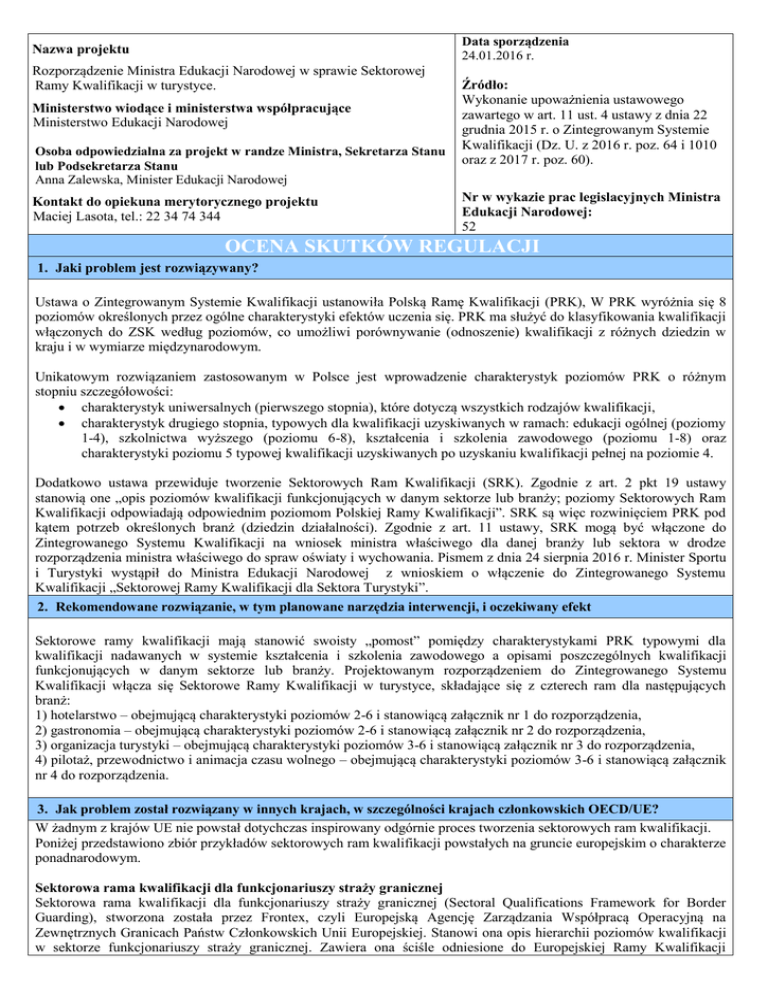 Data sporządzenia 24.01.2016 r. Nazwa projektu Rozporządzenie Ministra Edukacji Narodowej w sprawie Sektorowej Ramy Kwalifikacji w turystyce. Ministerstwo wiodące i ministerstwa współpracujące Ministerstwo Edukacji Narodowej Osoba odpowiedzialna za projekt w randze Ministra, Sekretarza Stanu lub Podsekretarza Stanu Anna Zalewska, Minister Edukacji Narodowej Kontakt do opiekuna merytorycznego projektu Maciej Lasota, tel.: 22 34 74 344 Źródło: Wykonanie upoważnienia ustawowego zawartego w art. 11 ust. 4 ustawy z dnia 22 grudnia 2015 r. o Zintegrowanym Systemie Kwalifikacji (Dz. U. z 2016 r. poz. 64 i 1010 oraz z 2017 r. poz. 60). Nr w wykazie prac legislacyjnych Ministra Edukacji Narodowej: 52 OCENA SKUTKÓW REGULACJI 1. Jaki problem jest rozwiązywany? Ustawa o Zintegrowanym Systemie Kwalifikacji ustanowiła Polską Ramę Kwalifikacji (PRK), W PRK wyróżnia się 8 poziomów określonych przez ogólne charakterystyki efektów uczenia się. PRK ma służyć do klasyfikowania kwalifikacji włączonych do ZSK według poziomów, co umożliwi porównywanie (odnoszenie) kwalifikacji z różnych dziedzin w kraju i w wymiarze międzynarodowym. Unikatowym rozwiązaniem zastosowanym w Polsce jest wprowadzenie charakterystyk poziomów PRK o różnym stopniu szczegółowości: charakterystyk uniwersalnych (pierwszego stopnia), które dotyczą wszystkich rodzajów kwalifikacji, charakterystyk drugiego stopnia, typowych dla kwalifikacji uzyskiwanych w ramach: edukacji ogólnej (poziomy 1-4), szkolnictwa wyższego (poziomu 6-8), kształcenia i szkolenia zawodowego (poziomu 1-8) oraz charakterystyki poziomu 5 typowej kwalifikacji uzyskiwanych po uzyskaniu kwalifikacji pełnej na poziomie 4. Dodatkowo ustawa przewiduje tworzenie Sektorowych Ram Kwalifikacji (SRK). Zgodnie z art. 2 pkt 19 ustawy stanowią one „opis poziomów kwalifikacji funkcjonujących w danym sektorze lub branży; poziomy Sektorowych Ram Kwalifikacji odpowiadają odpowiednim poziomom Polskiej Ramy Kwalifikacji”. SRK są więc rozwinięciem PRK pod kątem potrzeb określonych branż (dziedzin działalności). Zgodnie z art. 11 ustawy, SRK mogą być włączone do Zintegrowanego Systemu Kwalifikacji na wniosek ministra właściwego dla danej branży lub sektora w drodze rozporządzenia ministra właściwego do spraw oświaty i wychowania. Pismem z dnia 24 sierpnia 2016 r. Minister Sportu i Turystyki wystąpił do Ministra Edukacji Narodowej z wnioskiem o włączenie do Zintegrowanego Systemu Kwalifikacji „Sektorowej Ramy Kwalifikacji dla Sektora Turystyki”. 2. Rekomendowane rozwiązanie, w tym planowane narzędzia interwencji, i oczekiwany efekt Sektorowe ramy kwalifikacji mają stanowić swoisty „pomost” pomiędzy charakterystykami PRK typowymi dla kwalifikacji nadawanych w systemie kształcenia i szkolenia zawodowego a opisami poszczególnych kwalifikacji funkcjonujących w danym sektorze lub branży. Projektowanym rozporządzeniem do Zintegrowanego Systemu Kwalifikacji włącza się Sektorowe Ramy Kwalifikacji w turystyce, składające się z czterech ram dla następujących branż: 1) hotelarstwo – obejmującą charakterystyki poziomów 2-6 i stanowiącą załącznik nr 1 do rozporządzenia, 2) gastronomia – obejmującą charakterystyki poziomów 2-6 i stanowiącą załącznik nr 2 do rozporządzenia, 3) organizacja turystyki – obejmującą charakterystyki poziomów 3-6 i stanowiącą załącznik nr 3 do rozporządzenia, 4) pilotaż, przewodnictwo i animacja czasu wolnego – obejmującą charakterystyki poziomów 3-6 i stanowiącą załącznik nr 4 do rozporządzenia. 3. Jak problem został rozwiązany w innych krajach, w szczególności krajach członkowskich OECD/UE? W żadnym z krajów UE nie powstał dotychczas inspirowany odgórnie proces tworzenia sektorowych ram kwalifikacji. Poniżej przedstawiono zbiór przykładów sektorowych ram kwalifikacji powstałych na gruncie europejskim o charakterze ponadnarodowym. Sektorowa rama kwalifikacji dla funkcjonariuszy straży granicznej Sektorowa rama kwalifikacji dla funkcjonariuszy straży granicznej (Sectoral Qualifications Framework for Border Guarding), stworzona została przez Frontex, czyli Europejską Agencję Zarządzania Współpracą Operacyjną na Zewnętrznych Granicach Państw Członkowskich Unii Europejskiej. Stanowi ona opis hierarchii poziomów kwalifikacji w sektorze funkcjonariuszy straży granicznej. Zawiera ona ściśle odniesione do Europejskiej Ramy Kwalifikacji charakterystyki poziomów 4-7, opisane zgodnie z Zaleceniem Parlamentu Europejskiego, tj. w języku efektów uczenia się. W ramie wyodrębnione zostały cztery kategorie kompetencji: kompetencje ogólne (generic border guarding), kompetencje z zakresu kontroli granicznej (border control), kompetencje z zakresu prowadzenia transgranicznych śledztw i wywiadu (cross-border investigation and intelligence) oraz kompetencje dotyczące nadzoru i zarządzania (supervision, management, leadership), w obrębie których wskazano wiązki kompetencji. Suplementem do sektorowej ramy kwalifikacji dla funkcjonariuszy straży granicznej jest rama sprofilowana akademicko. Przedstawia ona kompetencje opisane w głównej ramie w podziale na wiedzę, kompetencje i umiejętności społeczne, uzupełnione o profile kompetencyjne posiadacza kwalifikacji na określonym poziomie, których celem jest zwięzłe opisanie wymagań dla tego poziomu wobec osób uczących się. Kwalifikacje w sektorze usług finansowych W zakresie ram kwalifikacji dla sektora usług finansowych na gruncie europejskim zrealizowano projekt FIRST (Financial Services EQF Translator), stanowiący „branżową interpretację Europejskiej Ramy Kwalifikacji” (zob. FIRST 2011). W projekcie tym udział wzięło 9 partnerów z ośmiu europejskich krajów, a jego rezultatem jest sektorowa rama kwalifikacji dla sektora usług finansowych w Europie (dalej: FIRST). FIRST zawiera opisy poziomów 3-7, odniesionych do analogicznych poziomów