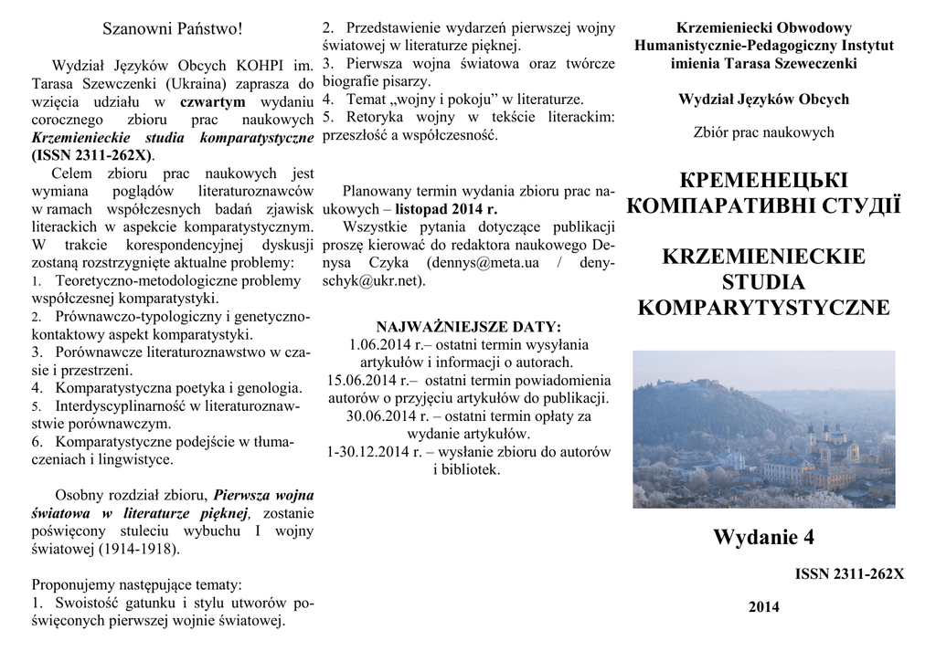 Szanowni Państwo! Wydział Języków Obcych KOHPI im. Tarasa Szewczenki (Ukraina) zaprasza do wzięcia udziału w czwartym wydaniu corocznego zbioru prac naukowych Krzemienieckie studia komparatystyczne (ISSN 2311-262X). Celem zbioru prac naukowych jest wymiana poglądów literaturoznawców w ramach współczesnych badań zjawisk literackich w aspekcie komparatystycznym. W trakcie korespondencyjnej dyskusji zostaną rozstrzygnięte aktualne problemy: 1. Teoretyczno-metodologiczne problemy współczesnej komparatystyki. 2. Prównawczo-typologiczny i genetycznokontaktowy aspekt komparatystyki. 3. Porównawcze literaturoznawstwo w czasie i przestrzeni. 4. Komparatystyczna poetyka i genologia. 5. Interdyscyplinarność w literaturoznawstwie porównawczym. 6. Komparatystyczne podejście w tłumaczeniach i lingwistyce. Osobny rozdział zbioru, Pierwsza wojna światowa w literaturze pięknej, zostanie poświęcony stuleciu wybuchu I wojny światowej (1914-1918). Proponujemy następujące tematy: 1. Swoistość gatunku i stylu utworów poświęconych pierwszej wojnie światowej. 2. Przedstawienie wydarzeń pierwszej wojny światowej w literaturze pięknej. 3. Pierwsza wojna światowa oraz twórcze biografie pisarzy. 4. Temat „wojny i pokoju” w literaturze. 5. Retoryka wojny w tekście literackim: przeszłość a współczesność. Planowany termin wydania zbioru prac naukowych – listopad 2014 r. Wszystkie pytania dotyczące publikacji proszę kierować do redaktora naukowego Denysa Czyka ([email protected] / [email protected]). Krzemieniecki Obwodowy Humanistycznie-Pedagogiczny Instytut imienia Tarasa Szeweczenki Wydział Języków Obcych Zbiór prac naukowych КРЕМЕНЕЦЬКІ КОМПАРАТИВНІ СТУДІЇ KRZEMIENIECKIE STUDIA KOMPARYTYSTYCZNE NAJWAŻNIEJSZE DATY: 1.06.2014 r.– ostatni termin wysyłania artykułów i informacji o autorach. 15.06.2014 r.– ostatni termin powiadomienia autorów o przyjęciu artykułów do publikacji. 30.06.2014 r. – ostatni termin opłaty za wydanie artykułów. 1-30.12.2014 r. – wysłanie zbioru do autorów i bibliotek. Wydanie 4 ISSN 2311-262X 2014 WYMAGANIA DO ARTYKUŁÓW: 1. Edytor tekstu MS Word każda wersja, rozmiar А4 (książkowy); parametry strony: wszystkie marginesy 2,5 cm; czcionka Times New Roman, akapit 1,25 сm, interlinia pojedyncza, rozmiar czcionki głównej części tekstu – 14; na górze pierwszej strony (z lewej strony) – UKD; w prawym rogu – imię i nazwisko autora; po odstępie jednego wersu – tytuł dużymi literami po środku strony; po odstępie jednego wersu – główny tekst artykułu. 2. Dla cytatów należy stosować nawiasy kwadratowe. W nawiasach kwadratowych stosowanych w tekście artykułu należy podać numer pozycji w liście wykorzystanej literatury, tom i stronę: [8, s. 56-57]. Jeżeli cytuje się od razu kilka źródeł, ich numery powinny być rozdzielone średnikiem: [1; 3]. Cytaty z artykułów naukowych, monografii itp. powinny być podane w cudzysłowie. Uwagi (na dole strony lub w końcu głównego tekstu) są niedopuszczalne. Strony nie powinny być numerowane. Średni rozmiar publikacji – 15-20 tys. drukowanych znaków (7-10 kartek). Artykuły mniejsze niż 15 tys. znaków nie będą rozpatrywane. 3. Na końcu artykułu po odstępie jednego wersu należy podać w porządku alfabetycznym listę wykorzystanej literatury (nagłówek – Bibliografia). Najpierw należy wymienić literaturę napisaną cyrylicą, a potem alfabetem łacińskim. 4. Po liście wykorzystanej literatury po odstęJęzyki robocze zbioru – ukraiński, polpie jednego wersu należy umieścić adnotację ski, rosyjski, angielski, niemiecki. i kluczowe słowa w języku angielskim (rozmiar czcionki – 12). Adnotacja zawiera imię, Numer konta bankowego, na który nalenazwisko autora (autorów), pełną nazwę arty- ży wnieść opłatę za artykuł będzie wysłany kułu oraz streszczenie jego treści. tylko po potwierdzeniu jego przyjęcia do druku (wysokość opłaty 4 USD za stronę). Oprócz artykułu należy wysłać osobny plik zawierający informację o autorze (аutorach): Koszty związane z publikacją artykułu nazwisko, imię, stopień i tytuł naukowy (jeżeli zawierają wysokość opłaty za przesyłkę jest), stanowisko, miejsce pracy, telefon kon- jednego zbioru autorom (współautorzy dotaktowy, adres domowy, własny e-mail (obo- datkowo pokrywają koszt wydania zbioru wiązkowo!). i przesyłki). WIADOMOŚCI O AUTORZE Temat artykułu musi być aktualny, a artykuł wcześniej nie publikowany. Imię i nazwisko__________________________ Stopień naukowy ______________________ Tytuł naukowy ________________________ Stanowisko ___________________________ Miejsce pracy _________________________ Telefon _____________________________ Adres dla korespondencji _______________ e-mail _______________________________ Artykuły (proszę nazywać plik nazwiskiem pierwszego autora) oraz wiadomości o autorze (autorach) należy wysyłać na e-mail: [email protected] Redakcja ma prawo odmowy publikacji artykułów nie odpowiadających tematowi zbioru oraz potrzebujących technicznego lub poważnego stylistycznego redagowania.