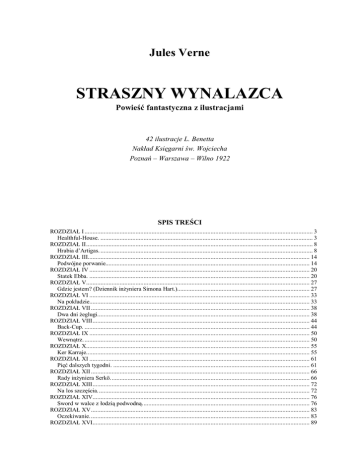 Jules Verne STRASZNY WYNALAZCA Powieść fantastyczna z ilustracjami 42 ilustracje L. Benetta Nakład Księgarni św. Wojciecha Poznań – Warszawa – Wilno 1922 SPIS TREŚCI ROZDZIAŁ I ............................................................................................................................................... 3 Healthful-House. ..................................................................................................................................... 3 ROZDZIAŁ II .............................................................................................................................................. 8 Hrabia d’Artigas. ..................................................................................................................................... 8 ROZDZIAŁ III........................................................................................................................................... 14 Podwójne porwanie................................................................................................................................ 14 ROZDZIAŁ IV .......................................................................................................................................... 20 Statek Ebba. .......................................................................................................................................... 20 ROZDZIAŁ V............................................................................................................................................ 27 Gdzie jestem? (Dziennik inżyniera Simona Hart.)................................................................................... 27 ROZDZIAŁ VI .......................................................................................................................................... 33 Na pokładzie.......................................................................................................................................... 33 ROZDZIAŁ VII ......................................................................................................................................... 38 Dwa dni żeglugi..................................................................................................................................... 38 ROZDZIAŁ VIII ........................................................................................................................................ 44 Back-Cup. ............................................................................................................................................. 44 ROZDZIAŁ IX .......................................................................................................................................... 50 Wewnątrz. ............................................................................................................................................. 50 ROZDZIAŁ X............................................................................................................................................ 55 Ker Karraje. ........................................................................................................................................... 55 ROZDZIAŁ XI .......................................................................................................................................... 61 Pięć dalszych tygodni. ........................................................................................................................... 61 ROZDZIAŁ XII ......................................................................................................................................... 66 Rady inżyniera Serkö. ............................................................................................................................ 66 ROZDZIAŁ XIII ........................................................................................................................................ 72 Na los szczęścia. .................................................................................................................................... 72 ROZDZIAŁ XIV........................................................................................................................................ 76 Sword w walce z łodzią podwodną. ........................................................................................................ 76 ROZDZIAŁ XV ......................................................................................................................................... 83 Oczekiwanie. ......................................................................................................................................... 83 ROZDZIAŁ XVI........................................................................................................................................ 89 Jeszcze kilka godzin............................................................................................................................... 89 ROZDZIAŁ XVII ...................................................................................................................................... 94 Jeden przeciwko pięciu. ......................................................................................................................... 94 ROZDZIAŁ XVIII ..................................................................................................................................... 98 Na pokładzie statku Tonnant. ................................................................................................................. 98 ROZDZIAŁ I Healthful-House. Piętnastego czerwca 189… dyrektorowi zakładu Healthful-House wręczono bilet wizytowy, na którym widniał prosty napis bez herbu i korony: Hrabia d’Artigas. Pod nazwiskiem w rogu biletu skreślono ołówkiem następujący adres: „Na statku Ebba, w porcie New Berne, P