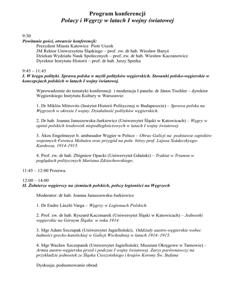 Program konferencji Polacy i Węgrzy w latach I wojny światowej 9:30 Powitanie gości, otwarcie konferencji: Prezydent Miasta Katowice Piotr Uszok JM Rektor Uniwersytetu Śląskiego – prof. zw. dr hab. Wiesław Banyś Dziekan Wydziału Nauk Społecznych – prof. zw. dr hab. Wiesław Kaczanowicz Dyrektor Instytutu Historii – prof. dr hab. Jerzy Sperka 9:45 – 11:45 I. W kręgu polityki. Sprawa polska w myśli polityków węgierskich. Stosunki polsko-węgierskie w koncepcjach polskich w latach I wojny światowej. Wprowadzenie do tematyki konferencji i moderacja I panelu: dr János Tischler – dyrektor Węgierskiego Instytutu Kultury w Warszawie: 1. Dr Miklós Mitrovits (Instytut Historii Politycznej w Budapeszcie) – Sprawa polska na Węgrzech w okresie I wojny. Działalność polityków węgierskich. 2. Dr hab. Joanna Januszewska-Jurkiewicz (Uniwersytet Śląski w Katowicach) – Węgry w opinii polskich środowisk niepodległościowych w latach I wojny światowej. 3. Ákos Engelmayer b. ambasador Węgier w Polsce – Obraz Galicji na podstawie zapisków wojennych Ferenca Molnára oraz przygód na polu bitwy prof. Lajosa SzádeczkyegoKardossa, 1914-1915. 4. Prof. zw. dr hab. Zbigniew Opacki (Uniwersytet Gdański) – Traktat w Trianon w poglądach politycznych Mariana Zdziechowskiego. 11:45 – 12:00 Przerwa. 12:00 – 14:00 II. Żołnierze węgierscy na ziemiach polskich, polscy legioniści na Węgrzech Moderator: dr hab. Joanna Januszewska-Jurkiewicz 1. Dr Endre László Varga – Węgrzy w Legionach Polskich. 2. Prof. zw. dr hab. Ryszard Kaczmarek (Uniwersytet Śląski w Katowicach) – Jednostki węgierskie na Górnym Śląsku w roku 1914. 3. Mgr Adam Szczupak (Uniwersytet Jagielloński), Oddziały austro-węgierskie wobec ludności grecko-katolickiej w Galicji Wschodniej w latach 1914–1915. 4. Mgr Wacław Szczepanik (Uniwersytet Jagielloński; Muzeum Okręgowe w Tarnowie) – Armia austro-węgierska przed i podczas I wojny światowej. Zarys porównawczy na przykładzie jednostek ze Śląska Cieszyńskiego i krajów Korony Św. Stefana Dyskusja; podsumowanie obrad.