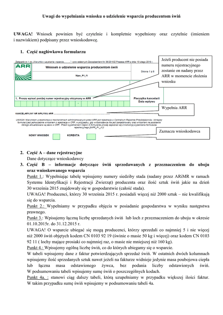 Uwagi do wypełniania wniosku o udzielenie wsparcia producentom świń UWAGA! Wniosek powinien być czytelnie i kompletnie wypełniony oraz czytelnie (imieniem i nazwiskiem) podpisany przez wnioskodawcę. 1. Część nagłówkowa formularzu Jeżeli producent nie posiada numeru rejestracyjnego zostanie on nadany przez ARR w momencie złożenia wniosku Wypełnia ARR Zaznacza wnioskodawca 2. Część A – dane rejestracyjne Dane dotyczące wnioskodawcy 3. Część B – informacje dotyczące świń sprzedawanych z przeznaczeniem do uboju oraz wnioskowanego wsparcia Punkt 1.: Wypełniając tabelę wpisujemy numery siedziby stada (nadany przez ARiMR w ramach Systemu Identyfikacji i Rejestracji Zwierząt) producenta oraz ilość sztuk świń jakie na dzień 30 września 2015 znajdowały się w gospodarstwie (całość stada). UWAGA! Producenci, którzy 30 września 2015 r. posiadali więcej niż 2000 sztuk – nie kwalifikują się do wsparcia. Punkt 2.: Wypełniamy w przypadku objęcia w posiadanie gospodarstwa w wyniku następstwa prawnego. Punkt 3.: Wpisujemy łączną liczbę sprzedanych świń lub loch z przeznaczeniem do uboju w okresie 01.10.2015r. do 31.12.2015 r. UWAGA! O wsparcie ubiegać się mogą producenci, którzy sprzedali co najmniej 5 i nie więcej niż 2000 świń objętych kodem CN 0103 92 19 (świnie o masie 50 kg i więcej) oraz kodem CN 0103 92 11 ( lochy mające prosiaki co najmniej raz, o masie nie mniejszej niż 160 kg). Punkt 4.: Wpisujemy ogólną liczbę świń, co do których ubiegamy się o wsparcie. W tabeli wpisujemy dane z faktur potwierdzających sprzedaż świń. W ostatnich dwóch kolumnach wpisujemy ilość sprzedanych sztuk nawet jeżeli na fakturze widnieje jedynie masa poubojowa ciepła lub łączna masa odstawionego żywca, bez podania liczby odstawionych świń. W podsumowaniu tabeli wpisujemy sumę świń o poszczególnych kodach. Punkt 4a. : stanowi ciąg dalszy tabeli, którą uzupełniamy w przypadku większej ilości faktur. W takim przypadku sumę świń wpisujemy w podsumowaniu tabeli 4a. UWAGA! Wsparcie nie może być udzielone do większej ilości sztuk niż liczba świń uwzględnionych w tabeli poddanych ubojowi w rzeźni w okresie od dnia 01.10.2015r. do 07.01.2016r. Informacja o załącznikach - strona 6 formularzu (zaznaczmy znakiem X) oryginały bądź kopie faktur sprzedaży lub faktur VAT RR, oryginały bądź kopie potwierdzające nabycie spadku, zaistnienia następstwa prawnego bądź przeniesienia własności gospodarstwa, Kopie faktur i dokumentów należy potwierdzić za zgodność z oryginałem poprzez wpisanie na kopi: „Potwierdzam zgodność z oryginałem” oraz datę i podpis wnioskodawcy. pisemna zgoda współposiadaczy gospodarstwa na wypłatę wsparcia producentowi, który się o nią ubiega. Jeżeli gospodarstwo jest przedmiotem współposiadania, wsparcia finansowego udziela się temu ze współposiadaczy, co do którego pozostali współposiadacze wyrazili pisemną zgodę. Wzór zgody stanowi załącznik nr 2 do formularza wniosku. oświadczenie małżonków o wspólności majątkowej gospodarstwa rolnego - w przypadku gdy do wniosku dołączone zostały dokumenty wystawione zarówno na jednego jak i drugiego ze współmałżonków, których ustawowa wspólność majątkowa obejmuje dane gospodarstwo rolne, należy dołączyć do wniosku dodatkowo oświadczenie małżonków o wspólności majątkowej gospodarstwa rolnego - wzór oświadczenia stanowi załącznik nr 3 do formularza wniosku. Informacje dodatkowe: Formularz wniosku o udzielenie wsparcia można uzyskać w Oddziale Terenowym Agencji Rynku Rolnego, w Centrali Agencji Rynku Rolnego, na stronie internetowej Agencji Rynku Rolnego www.arr.gov.pl oraz na stronie internetowej WIR ww.wir.org.pl. Wniosek o udzielenie wsparcia i jego ewentualną korektę należy złożyć w terminie od dnia 18 lutego 2016 r. do dnia 18 marca 2016 r. Poprawnie wypełniony wniosek o przyznanie wsparcia wraz z wymaganymi załącznikami należy dostarczyć osobiście lub rejestrowaną przesyłką pocztową (np. listem poleconym albo za potwierdzeniem odbioru) na adres właściwego OT ARR (OT ARR Poznań 60-324 Poznań, ul. Marcelińska 90 tel. (61) 852-14-33, fax (61) 853-67-95 ), Producent świń zobowiązany jest do przechowywania wszelkiej dokumentacji związanej z udziałem w mechanizmie „Tymczasowa nadzwyczajna pomoc dla rolników w sektorach hodowlanych” przez okres 5 lat licząc od roku, w którym wypłacone zostało wsparcie. Opracowanie na podstawie materiałów ARR