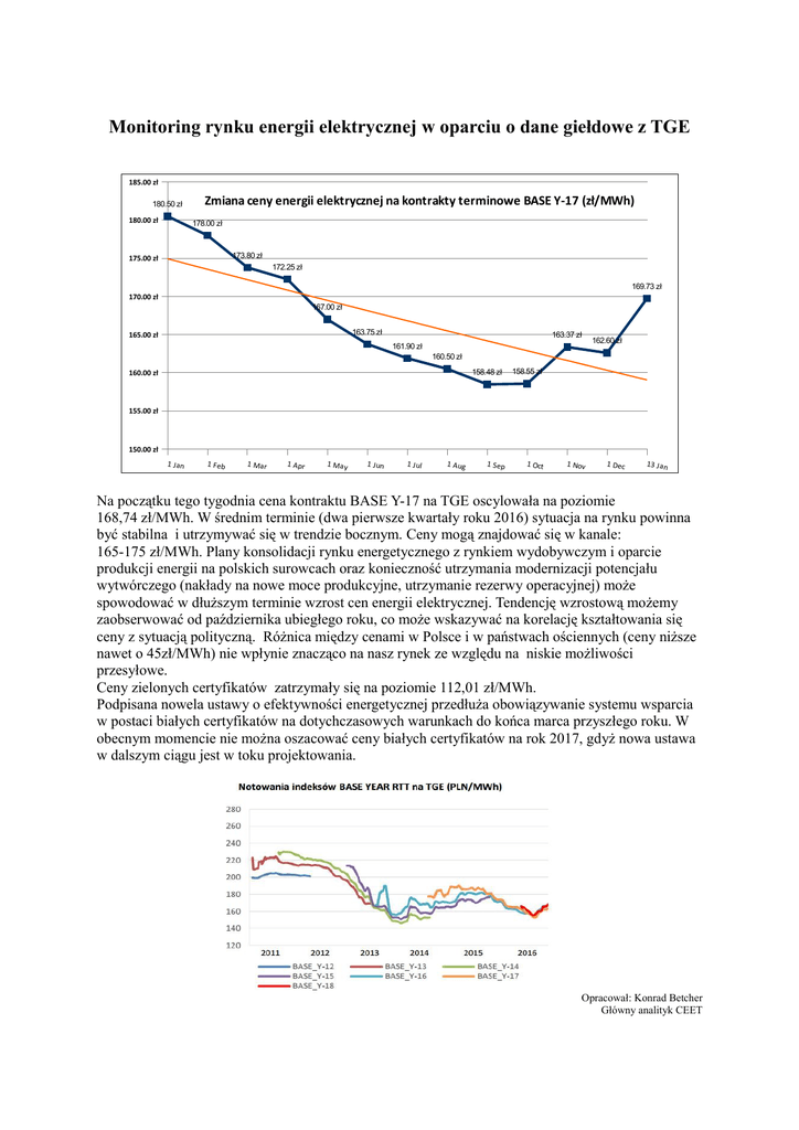 Monitoring rynku energii elektrycznej w oparciu o dane giełdowe z TGE 185.00 zł 180.50 zł 180.00 zł Zmiana ceny energii elektrycznej na kontrakty terminowe BASE Y-17 (zł/MWh) 178.00 zł 173.80 zł 175.00 zł 172.25 zł 169.73 zł 170.00 zł 167.00 zł 163.75 zł 165.00 zł 163.37 zł 161.90 zł 162.60 zł 160.50 zł 158.48 zł 160.00 zł 158.55 zł 155.00 zł 150.00 zł 1 Jan 1 Feb 1 Mar 1 A pr 1 Ma y 1 Jun 1 Jul 1 A ug 1 Sep 1 Oct 1 Nov 1 Dec 13 Jan Na początku tego tygodnia cena kontraktu BASE Y-17 na TGE oscylowała na poziomie 168,74 zł/MWh. W średnim terminie (dwa pierwsze kwartały roku 2016) sytuacja na rynku powinna być stabilna i utrzymywać się w trendzie bocznym. Ceny mogą znajdować się w kanale: 165-175 zł/MWh. Plany konsolidacji rynku energetycznego z rynkiem wydobywczym i oparcie produkcji energii na polskich surowcach oraz konieczność utrzymania modernizacji potencjału wytwórczego (nakłady na nowe moce produkcyjne, utrzymanie rezerwy operacyjnej) może spowodować w dłuższym terminie wzrost cen energii elektrycznej. Tendencję wzrostową możemy zaobserwować od października ubiegłego roku, co może wskazywać na korelację kształtowania się ceny z sytuacją polityczną. Różnica między cenami w Polsce i w państwach ościennych (ceny niższe nawet o 45zł/MWh) nie wpłynie znacząco na nasz rynek ze względu na niskie możliwości przesyłowe. Ceny zielonych certyfikatów zatrzymały się na poziomie 112,01 zł/MWh. Podpisana nowela ustawy o efektywności energetycznej przedłuża obowiązywanie systemu wsparcia w postaci białych certyfikatów na dotychczasowych warunkach do końca marca przyszłego roku. W obecnym momencie nie można oszacować ceny białych certyfikatów na rok 2017, gdyż nowa ustawa w dalszym ciągu jest w toku projektowania. Opracował: Konrad Betcher Główny analityk CEET