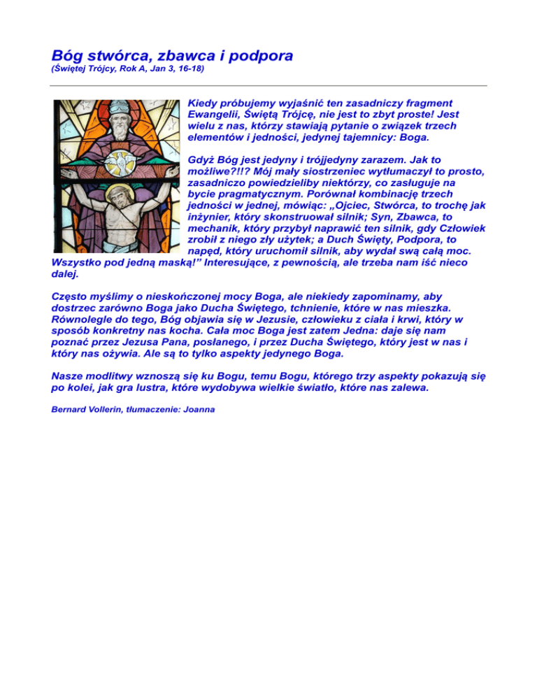 Bóg stwórca, zbawca i podpora (Świętej Trójcy, Rok A, Jan 3, 16-18) Kiedy próbujemy wyjaśnić ten zasadniczy fragment Ewangelii, Świętą Trójcę, nie jest to zbyt proste! Jest wielu z nas, którzy stawiają pytanie o związek trzech elementów i jedności, jedynej tajemnicy: Boga. Gdyż Bóg jest jedyny i trójjedyny zarazem. Jak to możliwe?!!? Mój mały siostrzeniec wytłumaczył to prosto, zasadniczo powiedzieliby niektórzy, co zasługuje na bycie pragmatycznym. Porównał kombinację trzech jedności w jednej, mówiąc: „Ojciec, Stwórca, to trochę jak inżynier, który skonstruował silnik; Syn, Zbawca, to mechanik, który przybył naprawić ten silnik, gdy Człowiek zrobił z niego zły użytek; a Duch Święty, Podpora, to napęd, który uruchomił silnik, aby wydał swą całą moc. Wszystko pod jedną maską!” Interesujące, z pewnością, ale trzeba nam iść nieco dalej. Często myślimy o nieskończonej mocy Boga, ale niekiedy zapominamy, aby dostrzec zarówno Boga jako Ducha Świętego, tchnienie, które w nas mieszka. Równolegle do tego, Bóg objawia się w Jezusie, człowieku z ciała i krwi, który w sposób konkretny nas kocha. Cała moc Boga jest zatem Jedna: daje się nam poznać przez Jezusa Pana, posłanego, i przez Ducha Świętego, który jest w nas i który nas ożywia. Ale są to tylko aspekty jedynego Boga. Nasze modlitwy wznoszą się ku Bogu, temu Bogu, którego trzy aspekty pokazują się po kolei, jak gra lustra, które wydobywa wielkie światło, które nas zalewa. Bernard Vollerin, tłumaczenie: Joanna