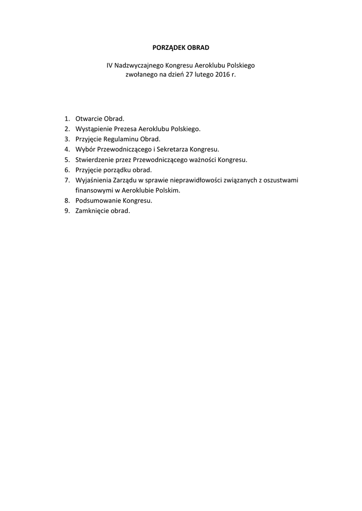 PORZĄDEK OBRAD IV Nadzwyczajnego Kongresu Aeroklubu Polskiego zwołanego na dzień 27 lutego 2016 r. 1. 2. 3. 4. 5. 6. 7. Otwarcie Obrad. Wystąpienie Prezesa Aeroklubu Polskiego. Przyjęcie Regulaminu Obrad. Wybór Przewodniczącego i Sekretarza Kongresu. Stwierdzenie przez Przewodniczącego ważności Kongresu. Przyjęcie porządku obrad. Wyjaśnienia Zarządu w sprawie nieprawidłowości związanych z oszustwami finansowymi w Aeroklubie Polskim. 8. Podsumowanie Kongresu. 9. Zamknięcie obrad.