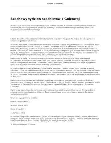 GMINA DOMARADZ Szachowy tydzień szachistów z Golcowej W Gimnazjum w Golcowej miniony tydzień stał pod znakiem szachów. W ostatnim tygodniu października drużyna szachowa golcowskiego gimnazjum szczęśliwie wywalczyła na zawodach Powiatowej Gimnazjady w szachach drużynowych awans finału rejonowego. Szkolny Związek Sportowy zaplanował zawody rejonowe na piątek 4 listopada. Na miejsce zawodów ponownie wybrano Zespół Szkół w Golcowej. W turnieju Powiatowej Gimnazjady awans wywalczyła drużyna w składzie: Wojciech Więcek i Jan Głowacki z kl. 3 oraz Olivier Wyskiel i Aneta Wacek z klasy 1. O ile Anetka, ma pewne miejsce w składzie i w szkole nie ma dla niej konkurencji, to chłopcy musieli o to miejsce powalczyć. Mianowicie, w przeciwieństwie do innych szkół powiatu, w których szachistów jest jak na lekarstwo, w naszej szkole mamy ich bogactwo. Jest w szkole wielu uczniów znających reguły gry, którzy potrafią zagrać partię szachową bez błędów i chcą rywalizować bez względu na reprezentowany poziom. Ten poziom gry jest dyskusyjny, ale najważniejszy jest zapał i szczere chęci. Od tego roku w klasie 1 w gimnazjum uczą się szachiści z ubiegłorocznej klasy VI ze Szkoły Podstawowej nr 2 z Różanki, którzy jeździli na turnieje i mieli chęć chodzić na kółko szachowe. To oni stali się konkurencją dla dotychczasowych reprezentantów - szachistów z klasy 3 gimnazjum, którzy poświęcają czas innym dyscyplinom sportu (niekiedy i dyscyplinom w świecie wirtualnej rzeczywistości). Po etapie powiatowym zwycięska czwórka zawodników ponownie z zapałem zabrała się za ”renowację wiedzy szachowej”, bo termin zawodów rejonowych okazał się być bardzo bliski. W ciągu kilku dni nasi zawodnicy pracowicie ćwiczyli debiuty i końcówki oraz z zapałem powtarzali zapomniane dawno schematy taktyczne niedowierzając sobie, że tyle już zapomnieli. Powątpiewając we własne możliwości, zastanawiali się na jak długo ta porcja wiedzy szachowej im wystarczy. Do Golcowej przyjechali zwycięzcy eliminacji powiatowych z powiatów: brzozowskiego, sanockiego, leskiego i bieszczadzkiego. Do zawodów stanęło 7 drużyn z gimnazjów z: Ustrzyk Dolnych, Bóbrki, Uherzec Mineralnych, Bóbrki, Tarnawy Dolnej, Sanoka (Gimnazjum nr 3), Brzozowa no i oczywiście nasza drużyna gospodarzy – Gimnazjum z Golcowej. Piątek zaczął się pechowo, bo zachorował nagle nasz szachista Jasiek Głowacki, który jeszcze dzień wcześniej z entuzjazmem rozgrywał debiut za debiutem. Za sprawą złośliwego wirusa los dał szansę zagrania Damianowi Szeligowskiemu z kl III. W turnieju wystąpiliśmy w składzie: Damian Szeligowski (kl 3) Wojciech Więcek (kl 3) Olivier Wyskiel (kl 1) Aneta Wacek (kl 1) W I rundzie przegraliśmy z Sanokiem 0:4. Jak się okazało przegraliśmy ze zwycięzcą turnieju i była to jedyna nasza przegrana w tym turnieju. Potem było lepiej. Do piątej rundy mieliśmy jedną wygraną i 3 remisy, z których jeden był szczęśliwym remisem, a dwa okazały się pechowymi, bo zwycięstwo było „o włos”. Przebieg turnieju jest na stronie: 1 GMINA DOMARADZ http://www.chessarbiter.com/turnieje/2016/tdr_6179/results.html?l=pl&tb=213_&rd=5_ Po V rundzie zajmowaliśmy III miejsce w klasyfikacji drużynowej i raczej nie liczyliśmy na nic więcej, bo zajmująca II miejsce drużyna z Tarnawy Dolnej miała 1 punkt przewagi. Nasi szachiści mieli do zagrania jeszcze mecz w VI rundzie, a w rundzie VII pauzowali. Mało prawdopodobne wydawało się, żeby golcowska drużyna w jednym meczu przeskoczyła dobrze grających szachistów z Tarnawy. Tymczasem w powietrzu powiało sensacją, ponieważ w VI rundzie Tarnawa przegrała z Sanokiem 4:0, a nasi szachiści wygrali 3:1 z Ustrzykami. Po tej rundzie Golcowa wskoczyła na II miejsce dzięki zdobytym 2 punktom za zwycięstwo oraz większej liczbie zdobytych tzw. „małych punktów” (jest to suma punktów zdobytych przez zawodników w kolejnych partiach). Do rozegrania została ostatnia runda, w której nasi szachiści mieli pauzować, a drużyna z Tarnawy Dolnej zagrać z Brzozowem. Utrzymanie II miejsca zależała od tego czy Tarnawa wygra czy zremisuje z Brzozowem. Na nasze szczęście Brzozów wywalczył remis. Dramatyczny przebieg szachowych pojedynków to ogromny wysiłek umysłowy i wielkie wyzwanie dla psychiki ucznia. Każdy uczeń przystępując do gry mocno koncentruje się i przeżywa każde zagranie, zarówno dobre jaki złe. Na zdjęciach z turnieju można zobaczyć poważne, skupione twarze oraz emocje towarzyszące grze oraz szelmowskie uśmiechy po udanej kombinacji i przechytrzeniu przeciwnika. Dziecko grające partię szachów całym ciałem przeżywa przebieg partii. Zwycięska drużyna z Gimnazjum nr 3 z Sanoka złożona jest z uczniów , którzy grają w klubie Komunalni Sanok. W tym samym klubie gra większość szachistów z Tarnawy Dolnej. W bezpośrednich pojedynkach zawodników z „amatorami” od razu widać różnicę wytrenowania, wiedzy oraz opanowania i radzenia sobie ze stresem. Umiejętności szachistów którzy uczą się grać w szachy w warunkach szkolnych są inne niż zawodników którzy trenują w klubie i na szachy w klubie poświęcają co najmniej dwa popołudnia w tygodniu lub mają indywidualne treningi z trenerem. Tym bardziej uczniom którzy zostają po zajęciach w szkole i mają motywację do dodatkowych ćwiczeń należą sie duże słowa uznania. Nasza drużyna, zajmując II miejsce w rejonie, awansowała do zawodów wojewódzkich Gimnazjady w szachach drużynowych. Na tym etapie rozgrywek przyjdzie się z mierzyć w trudnej rywalizacji z drużynami szkół, w których grają zawodnicy trenujący w klubach szachowych z Przemyśla, Dębicy, Sokołowa, Mielca czy Rudnika nad Sanem. Co prawda golcowscy szachiści w przeszłości kilka razy grali w finałach wojewódzkich, ale to jest przeszłość. Jeszcze 5, 6 czy 7 lat temu golcowscy szachiści byli 
