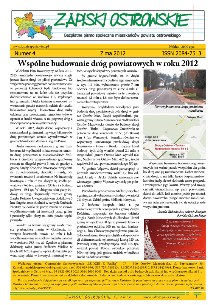 www.ludziezpasja.vixo.pl Nakład: 3000 egz. Numer 4 Zima 2012 ISSN 2084-7513 Wspólne budowanie dróg powiatowych w roku 2012 Wieloletni Plan Inwestycyjny na lata 20122015 samorządu powiatowego zawiera ciągle jeszcze liczne drogi do pilnej przebudowy. Ze względu na przewagę potrzeb nad możliwościami w pierwszej kolejności będą budowane lub remontowane te, na które uda się pozyskać dofinansowanie ze środków UE, rządowych lub gminnych. Dzięki takiemu sposobowi inwestowania powiat ostrowski oddaje do użytku kilkakrotnie więcej kilometrów dróg niżby oddawał przy prowadzeniu remontów tylko w oparciu o środki własne. A na poprawę dróg z niecierpliwością czekają mieszkańcy. W roku 2012, dzięki dobrej współpracy z samorządami gminnymi, najwięcej kilometrów dróg powiatowych zostało wybudowanych w gminach Szulborze Wielkie i Boguty-Pianki. Dzięki umowie podpisanej z gminą Szulborze na jej współudział w finansowaniu remontu drogi powiatowej w miejscowościach Szulborze i Grędzice przeprowadzono gruntowny remont na długości prawie 3 km, do granicy z gminą Zaręby Kościelne. Inwestycja uwzględnia m. in. odwodnienie, chodniki i zjazdy, odtworzenie rowów i oznakowanie. Na inwestycję kosztującą 2 mln 73 tys. złożyły się środki powiatowe - 760 tys., gminne - 630 tys. i z budżetu państwa - 584 tys. W ubiegłym roku plany budowy tej drogi obejmowały również gminę Zaręby Kościele. Uwzględniały one dodatkowe 6 km długości oraz chodniki w samych Zarębach. Niestety nie doszło do porozumienia w sprawie współfinansowania tej inwestycji przez gminę i pozostały tylko plany, na które powiat wydał pieniądze. Ponadto na terenie tej gminy miała miejsce przebudowa mostu w Gostkowie. Inwestycja kosztowała prawie 1,5 mln i była współfinansowana ze środków budżetu państwa w wysokości 583 tys. zł. Zgodnie z pisemną deklaracją wójta gminy Szulborze Wielkie, w latach 2013-2014 gmina wpłaci do budżetu powiatu swój udział w inwestycji mostowej w ra- tach, w wysokości połowy pozostałych kosztów. W gminie Boguty-Pianki, m. in. dzięki środkom finansowym z budżetu tego samorządu w wys. 1,1 mln, wybudowano prawie 7 km odcinek drogi powiatowej za sumę 4 mln zł. Samorząd powiatowy wyłożył na tę inwestycję również 1,1 mln a 1,8 mln było dofinansowaniem z budżetu państwa. Kolejnymi przykładami współpracy przy budowie dróg powiatowych były drogi w gminie Ostrów Maz. Dzięki współdziałaniu powiatu, gminy Ostrów Mazowiecka i Nadleśnictwa Ostrów Mazowiecka doszło do budowy drogi Ostrów - Turka – Nagoszewo. Umożliwiło to połączenie dróg krajowych nr 50 (do Broku) i nr 8 (do Warszawy). Ponadto, również we współpracy, kontynuacjo przebudowę drogi Nagoszewo - Fidury - Koziki. Łączny koszt budowy tych dróg wyniósł ponad 2,1 mln, z czego udział gminy Ostrów Maz. wyniósł 826 tys., Nadleśnictwa Ostrów Maz. 492 tys., środki rządowe 246 tys. i powiatu ostrowskiego 550 tys. W gminie Wąsewo, dzięki partycypacji w kosztach zmodernizowany został 1,7 km odcinek Grądy – Dybki. Udziały samorządu powiatowego i gminy Wąsewo wyniosły po połowie z 630 tys. Przy drodze powiatowej w Małkini, wspólnie z gminą, został wybudowany chodnik o wartości 211,5 tys. zł. Udział gminy Małkinia 100 tys. zł. Z końcem listopada 2012 r., po wielomiesięcznych negocjacjach z gminą Zaręby Kościelne, rozpoczęła się budowa odcinka drogi z Zarąb Kościelnych do Skłodów. Udział gminy w wysokości 50 tys. zł pozwolił tylko na przebudowę odcinka 600 m, zamiast koniecznego 1,1 km. Chciałabym podziękować panu M. Skłodowskiemu, który przychylił się do propozycji dofinansowania tej inwestycji kwotą 125 tys. Pozostałą sumę przedsięwzięcia, czyli 165 tys., wyłożył powiat. Powiat wybuduje pozostałe 500m tej drogi jeśli gmina znajdzie w budżecie środki na dofinansowanie. Nowowybudowana droga powiatowa w Szulborzu Wspieranie finansowe budowy dróg powiatowych jest ważne przede wszystkim dla gmin, bo służą one jej mieszkańcom. Dobra nawierzchnia drogi, to nie tylko lepsze bezpieczeństwo i komfort jazdy, ale też skrócenie czasu przejazdu i zmniejszenie jego kosztu. Weźmy pod uwagę czynnik ekonomiczny, np. przy przewożeniu dzieci do szkół. Jeśli autobus jedzie po równej, dobrej nawierzchni zużyje znacznie mniej paliwa niż jadąc po wertepach i to się opłaci przede wszystkim gminom. Urszula Wołosiewicz, członek Zarządu Powiatu Ostrowskiego Wydawca pisma: Ostrowskie Stowarzyszenie „LUDZIE Z PASJĄ”, 07 – 300 Ostrów Mazowiecka, ul. Partyzantów 35. Kontakt: [email protected] ; tel. 501 039 096, NIP 7591718513; REGON 1142159510; KRS 31429968. Konto bankowe: Bank Spółdzielczy w Ostrowi Maz., 03 8923 0008 0026 3014 2000 0001. Redakcja: zespół osób będących członkami lub współpracownikami Stowarzyszenia. Pismo finansowane jest ze składek członkowskich i darowizn. Redakcja zastrzega sobie prawo skracania tekstów. Bardzo serdecznie dziękujemy za wszelkiego rodzaju wsparcie. Jeśli uznacie Państwo, że podejmowana przez nasze pismo tematyka jest Państwu bliska zapraszamy do współpracy. Jeśli możliwe byłoby wsparcie tego przedsięwzięcia – prosimy o darowizny na podane wyżej konto REDAKCJA z tytułem wpłaty „ZAPISKI”. ZAPISKI OSTROWSKIE 4/2012 www.ludziezpasja.vixo.pl 1 Między Bugiem a Narwią - ludzie, przyroda, kultura Ludzie z Pasją - rozpoczynamy 5. rok działalności Ostrowskie Stowarzyszenie LUDZIE Z PASJĄ, to grupa osób od lat zaangażowanych w sprawy społeczne na terenie powiatu ostrowskiego. Chcemy rozpoznawać, opisywać, popularyzować i pielęgnować lokalny dorobek zbudowany na wartościach, które sami cenimy. Chcemy też być dla siebie nawzajem grupą wsparcia w podejmowanych na różnych polach inicjatywach. Nie pozostawiamy spraw ważnych innym – próbujemy, na miarę swoich możliwości, włączać się w życie publ