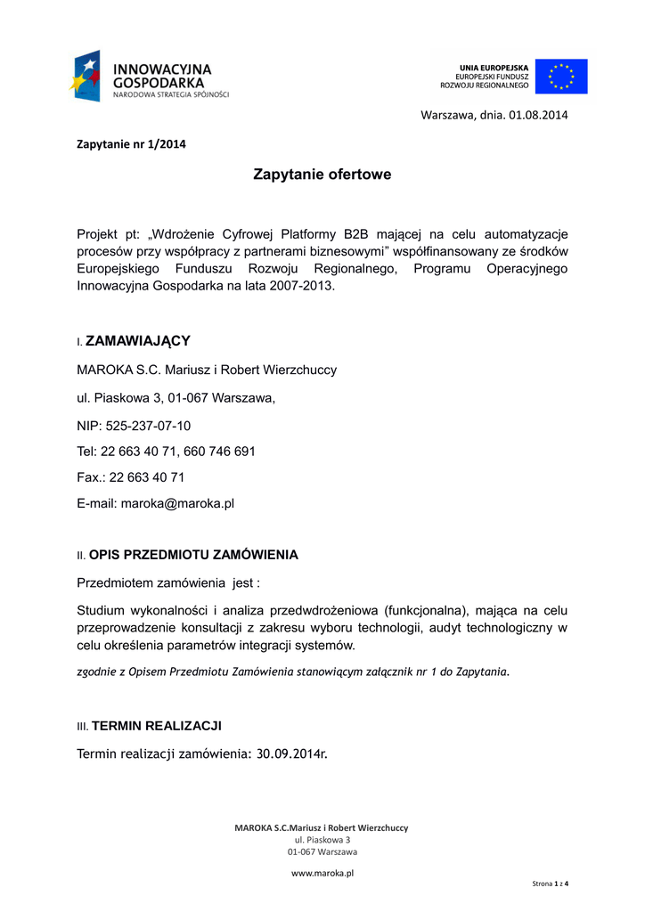 Warszawa, dnia. 01.08.2014 Zapytanie nr 1/2014 Zapytanie ofertowe Projekt pt: „Wdrożenie Cyfrowej Platformy B2B mającej na celu automatyzacje procesów przy współpracy z partnerami biznesowymi” współfinansowany ze środków Europejskiego Funduszu Rozwoju Regionalnego, Programu Operacyjnego Innowacyjna Gospodarka na lata 2007-2013. I. ZAMAWIAJĄCY MAROKA S.C. Mariusz i Robert Wierzchuccy ul. Piaskowa 3, 01-067 Warszawa, NIP: 525-237-07-10 Tel: 22 663 40 71, 660 746 691 Fax.: 22 663 40 71 E-mail: [email protected] II. OPIS PRZEDMIOTU ZAMÓWIENIA Przedmiotem zamówienia jest : Studium wykonalności i analiza przedwdrożeniowa (funkcjonalna), mająca na celu przeprowadzenie konsultacji z zakresu wyboru technologii, audyt technologiczny w celu określenia parametrów integracji systemów. zgodnie z Opisem Przedmiotu Zamówienia stanowiącym załącznik nr 1 do Zapytania. III. TERMIN REALIZACJI Termin realizacji zamówienia: 30.09.2014r. MAROKA S.C.Mariusz i Robert Wierzchuccy ul. Piaskowa 3 01-067 Warszawa www.maroka.pl Strona 1 z 4 IV. OPIS SPOSOBU PRZYGOTOWANIA OFERTY Oferta powinna zawierać: 1. dane teleadresowe firmy wraz ze wskazaną osobą do kontaktu w sprawie oferty (numer telefonu i e-mail osoby kontaktowej), numer NIP oraz REGON firmy, 2. kopię aktualnego dokumentu rejestrowego (dotyczy wyłącznie podmiotu, którego danych rejestrowych nie można ustalić na podstawie wydruku aktualnych informacji o podmiotach wpisanych do Rejestru udostępnionych przez Centralną Informację Krajowego Rejestru Sądowego na stronie internetowej https://ems.ms.gov.pl lub na podstawie zaświadczenia o wpisie w Centralnej Ewidencji i Informacji o Działalności Gospodarczej), 3. opis doświadczenia wykonawcy zawierający co najmniej: 3.1 doświadczenie w realizacji projektów o podobnym charakterze, 3.2 przedstawione opisy co najmniej 3 projektów o tematyce zbieżnej z zamówieniem 3.3 protokoły odbioru zamówienia. 3.4 udokumentowanie działalności na rynku przez okres nie krótszy niż 12 miesięcy, 4. opis koncepcji realizacji całości zamówienia zawierający co najmniej: 4.1 harmonogram realizacji zamówienia, 4.2 szczegółowy opis realizacji zamówienia zawierający: 4.2.1 wykaz osób oddelegowanych do realizacji zamówienia wraz z podziałem zadań oraz odpowiedzialności pomiędzy osoby realizujące zamówienie, 4.2.2 metody kontroli zapewniające najwyższą jakość prowadzonych prac, 4.2.3 sposób komunikacji pomiędzy Wykonawcą a Zamawiającym. 5. całkowitą cenę brutto za wykonanie przedmiotu umowy. 6. wykaz personelu oddelegowanego do realizacji zamówienia, zawierający m.in. doświadczenie zawodowe, uzyskane certyfikaty, udział w podobnych projektach. Ofertę należy przygotować na formularzu oferty stanowiącym załącznik nr 2 do zapytania ofertowego. MAROKA S.C.Mariusz i Robert Wierzchuccy ul. Piaskowa 3 01-067 Warszawa www.maroka.pl Strona 2 z 4 V. KRYTERIA OCENY OFERT Przy wyborze najkorzystniejszej oferty Zamawiający będzie kierować się następującymi kryteriami i ich znaczeniem oraz w następujący sposób będzie oceniać oferty w poszczególnych kryteriach: L.p. KRYTERIUM MAKSYMALNA LICZBA PUNKTÓW 1. Cena 70 2. Doświadczenie przy prowadzeniu podobnych zadań poparte referencjami. 30 RAZEM 100 1. W kryterium Cena maksymalną liczbę punktów otrzyma oferta zawierająca najniższą cenę. Liczba punktów dla każdej następnej oferty zostanie obliczona w następujący sposób: cena najniższa Liczba punktów = ------------------------------ X 70 cena oferty ocenianej Do wyliczenia punktów zostanie przyjęta zawarta w formularzu ofertowym cena brutto, wyliczona z dokładnością do dwóch miejsc po przecinku. 2. Kryterium – Doświadczenie przy prowadzeniu podobnych zadań poparte referencjami (skala 0-30 pkt.): W ramach tego kryterium zostanie ocenione doświadczenie Wykonawcy. Na ocenę będą składały się następujące czynniki: • doświadczenie przy prowadzeniu podobnych projektów , • dotychczasowe realizacje, • dostarczone referencje, • zakres prac przy przedstawionych realizacjach. MAROKA S.C.Mariusz i Robert Wierzchuccy ul. Piaskowa 3 01-067 Warszawa www.maroka.pl Strona 3 z 4 Zamawiający udzieli zamówienia Wykonawcy, sumarycznie największą liczbę punktów którego oferta uzyskała VI. TERMINY PŁATNOŚCI Wynagrodzenie zostanie wypłacone w terminie 7 dni od daty otrzymania przez Zamawiającego poprawnie wystawionej przez Wykonawcę faktury VAT. VII. MIEJSCE I TERMIN SKŁADANIA OFERT Ofertę należy przygotować w wersji elektronicznej i przesłać odpowiednio drogą emailową na adres: [email protected] lub dostarczyć osobiście do siedziby firmy. Ostateczny termin nadsyłania ofert opływa dnia 08.08.2014 roku Załączniki: Załącznik nr 1 – Opis Przedmiotu Zamówienia; Załącznik nr 2 – Formularz oferty; Załącznik nr 3 – Oświadczenie Wykonawcy. MAROKA S.C.Mariusz i Robert Wierzchuccy ul. Piaskowa 3 01-067 Warszawa www.maroka.pl Strona 4 z 4