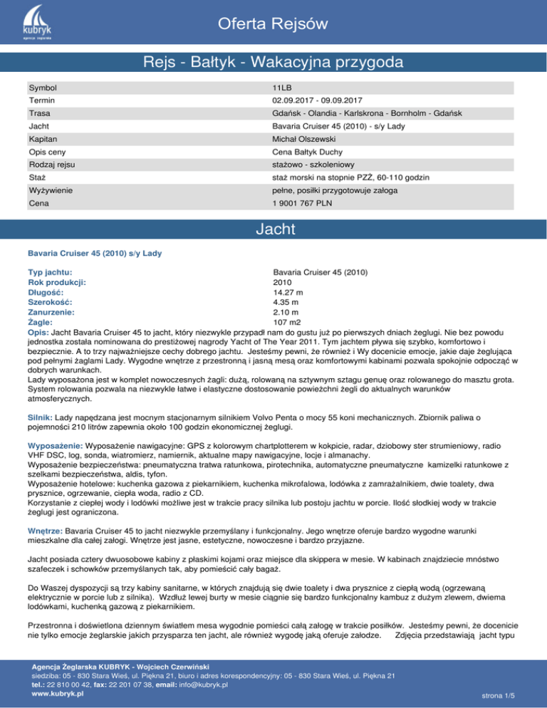 Oferta Rejsów Rejs - Bałtyk - Wakacyjna przygoda Symbol 11LB Termin 02.09.2017 - 09.09.2017 Trasa Gdańsk - Olandia - Karlskrona - Bornholm - Gdańsk Jacht Bavaria Cruiser 45 (2010) - s/y Lady Kapitan Michał Olszewski Opis ceny Cena Bałtyk Duchy Rodzaj rejsu stażowo - szkoleniowy Staż staż morski na stopnie PZŻ, 60-110 godzin Wyżywienie pełne, posiłki przygotowuje załoga Cena 1 9001 767 PLN Jacht Bavaria Cruiser 45 (2010) s/y Lady Typ jachtu: Bavaria Cruiser 45 (2010) Rok produkcji: 2010 Długość: 14.27 m Szerokość: 4.35 m Zanurzenie: 2.10 m Żagle: 107 m2 Opis: Jacht Bavaria Cruiser 45 to jacht, który niezwykle przypadł nam do gustu już po pierwszych dniach żeglugi. Nie bez powodu jednostka została nominowana do prestiżowej nagrody Yacht of The Year 2011. Tym jachtem pływa się szybko, komfortowo i bezpiecznie. A to trzy najważniejsze cechy dobrego jachtu. Jesteśmy pewni, że również i Wy docenicie emocje, jakie daje żeglująca pod pełnymi żaglami Lady. Wygodne wnętrze z przestronną i jasną mesą oraz komfortowymi kabinami pozwala spokojnie odpocząć w dobrych warunkach. Lady wyposażona jest w komplet nowoczesnych żagli: dużą, rolowaną na sztywnym sztagu genuę oraz rolowanego do masztu grota. System rolowania pozwala na niezwykle łatwe i elastyczne dostosowanie powieżchni żegli do aktualnych warunków atmosferycznych. Silnik: Lady napędzana jest mocnym stacjonarnym silnikiem Volvo Penta o mocy 55 koni mechanicznych. Zbiornik paliwa o pojemności 210 litrów zapewnia około 100 godzin ekonomicznej żeglugi. Wyposażenie: Wyposażenie nawigacyjne: GPS z kolorowym chartplotterem w kokpicie, radar, dziobowy ster strumieniowy, radio VHF DSC, log, sonda, wiatromierz, namiernik, aktualne mapy nawigacyjne, locje i almanachy. Wyposażenie bezpieczeństwa: pneumatyczna tratwa ratunkowa, pirotechnika, automatyczne pneumatyczne kamizelki ratunkowe z szelkami bezpieczeństwa, aldis, tyfon. Wyposażenie hotelowe: kuchenka gazowa z piekarnikiem, kuchenka mikrofalowa, lodówka z zamrażalnikiem, dwie toalety, dwa prysznice, ogrzewanie, ciepła woda, radio z CD. Korzystanie z ciepłej wody i lodówki możliwe jest w trakcie pracy silnika lub postoju jachtu w porcie. Ilość słodkiej wody w trakcie żeglugi jest ograniczona. Wnętrze: Bavaria Cruiser 45 to jacht niezwykle przemyślany i funkcjonalny. Jego wnętrze oferuje bardzo wygodne warunki mieszkalne dla całej załogi. Wnętrze jest jasne, estetyczne, nowoczesne i bardzo przyjazne. Jacht posiada cztery dwuosobowe kabiny z płaskimi kojami oraz miejsce dla skippera w mesie. W kabinach znajdziecie mnóstwo szafeczek i schowków przemyślanych tak, aby pomieścić cały bagaż. Do Waszej dyspozycji są trzy kabiny sanitarne, w których znajdują się dwie toalety i dwa prysznice z ciepłą wodą (ogrzewaną elektrycznie w porcie lub z silnika). Wzdłuż lewej burty w mesie ciągnie się bardzo funkcjonalny kambuz z dużym zlewem, dwiema lodówkami, kuchenką gazową z piekarnikiem. Przestronna i doświetlona dziennym światłem mesa wygodnie pomieści całą załogę w trakcie posiłków. Jesteśmy pewni, że docenicie nie tylko emocje żeglarskie jakich przysparza ten jacht, ale również wygodę jaką oferuje załodze. Zdjęcia przedstawiają jacht typu Agencja Żeglarska KUBRYK - Wojciech Czerwiński siedziba: 05 - 830 Stara Wieś, ul. Piękna 21, biuro i adres korespondencyjny: 05 - 830 Stara Wieś, ul. Piękna 21 tel.: 22 810 00 42, fax: 22 201 07 38, email: [email protected] www.kubryk.pl strona 1/5 Oferta Rejsów Bavaria Cruiser 45 z rocznika 2010. Nie są to zdjęcia s/y Lady. Trasa Gdańsk - Olandia - Karlskrona - Bornholm - Gdańsk Morze daje nieograniczone możliwości. Gdy tylko wsłuchamy się w jego rytm i zaakceptujemy jego prawa, odkryje przed nami całe swoje piękno i sprawi, że rejs stanie się niezapomnianą przygodą. Nie zwlekaj. Pozwól sobie na realizację marzeń już dziś. Dołącz do załgoi Kubryka i płyń w rejs! Dzień pierwszy W sobotę o 16:00 spotykamy się na kei w Marinie Gdańsk tuż przy starówce. Nasz skipper przywita Was i zaprosi na pokład jachtu. Po pierwszym zapoznaniu z jachtem przyjdzie czas na rozpakowanie własnych rzeczy w kabinach i mesie oraz sztauowanie prowiantu. Przed wypłynięciem skipper przeprowadzi obowiązkowe szkolenie z zasad bezpieczeństwa i z obsługi jachtu, podzieli załogę na wachty, omówi plan rejsu i aktualną prognozę pogody. Po szkoleniu będzie czas na wieczór integracyjny lub jeżeli Neptun będzie sprzyjał, wypłynięcie w pierwszy etap rejsu. Rejs - dokąd dopłyniemy? Tygodniowy rejs rozpoczynający się i kończący w Gdańsku ma niezliczoną możliwość konfiguracji. Bornholm, Christianso i Karlskrona lub Karlskrona, Kalmar i Olandia ewentualnie Olandia, Kłajpeda i Lipawa. Wszystko zależy od tego, z jakiego kierunku i z jaką siłą powieje nam wiatr. Po drodze jest wiele marin i porcików, które swoim urokiem zachwycą nawet najbardziej zatwardziałych. Żeglarstwo morskie rządzi się swoimi prawami. Uzależnione jest od warunków atmosferycznych. Zdarza się, że wiatr i morze mają inne niż my plany i nie udaje się zrealizować założonej wcześniej trasy. Jednak Bałtyk jest tak ciekawym akwenem, że niezależnie w którą stronę popłyniemy, to trafimy do miejsc wyjątkowych i przeżywając niezapomnianą przygodę, zakosztujemy prawdziwego żeglarstwa. Czy Neptun pozwoli na realizację takiego planu? Przekonamy się podczas rejsu. KUBRYKOWY PRZEWODNIK Bornholm Bornholm to niezwykle piękna i spokojna duńska wyspa, która ze względu na bliskość polskiego wybrzeża jest popularnym celem kubrykowych rejsów. Kształt i położenie Bornholmu są dla żeglarzy bardzo ważne. Niezależnie od kierunku wiatru, wyspa zawsze daje bardzo dobrą osłonę od fal po swojej zawietrznej stronie. Dlatego to głównie wiatr decyduje, czy opływamy Bornholm od zachodniej czy wschodniej strony. Na zachodnim wybrzeżu wyspy