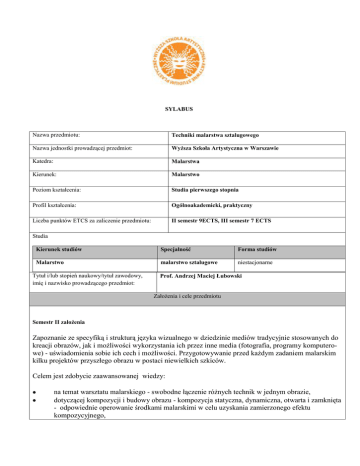 SYLABUS Nazwa przedmiotu: Techniki malarstwa sztalugowego Nazwa jednostki prowadzącej przedmiot: Wyższa Szkoła Artystyczna w Warszawie Katedra: Malarstwa Kierunek: Malarstwo Poziom kształcenia: Studia pierwszego stopnia Profil kształcenia: Ogólnoakademicki, praktyczny Liczba punktów ETCS za zaliczenie przedmiotu: II semestr 9ECTS, III semestr 7 ECTS Studia Kierunek studiów Specjalność Forma studiów Malarstwo malarstwo sztalugowe niestacjonarne Tytuł i/lub stopień naukowy/tytuł zawodowy, imię i nazwisko prowadzącego przedmiot: Prof. Andrzej Maciej Łubowski Założenia i cele przedmiotu Semestr II założenia Zapoznanie ze specyfiką i strukturą języka wizualnego w dziedzinie mediów tradycyjnie stosowanych do kreacji obrazów, jak i możliwości wykorzystania ich przez inne media (fotografia, programy komputerowe) - uświadomienia sobie ich cech i możliwości. Przygotowywanie przed każdym zadaniem malarskim kilku projektów przyszłego obrazu w postaci niewielkich szkiców. Celem jest zdobycie zaawansowanej wiedzy: na temat warsztatu malarskiego - swobodne łączenie różnych technik w jednym obrazie, dotyczącej kompozycji i budowy obrazu - kompozycja statyczna, dynamiczna, otwarta i zamknięta - odpowiednie operowanie środkami malarskimi w celu uzyskania zamierzonego efektu kompozycyjnego, dotyczącej zasad kompozycji i budowy obrazu. Opanowanie: - znajomości techniki olejnej, akrylowej i temperowej. - umiejętności świadomego komponowania elementów obrazu. - umiejętności posługiwania się warsztatem malarskim pozwalająca na wierne oddanie założenia obrazu. Semestr III założenia: Znajomość warsztatu malarskiego, perspektywy, zasad kompozycji. Przygotowanie przed każdym zadaniem malarskim kilku projektów przyszłego obrazu w postaci niewielkich szkiców. Wymagania wstępne Zgodnie z planem studiów w danym roku akademickim i semestrze studiów. Zamierzony efekt kształcenia Symbol efektu kształcenia na poziomie kierunku Opis efektów kształcenia na poziomie przedmiotu K_W01 Umie dostosować technologie i materiały malarskie do zaplanowanego projektu lub kreacji. K_W03 Rozumie znaczenie fachowej terminologii oraz potrafi zastosować ją w działaniu. K_W04 Rozumie znaczenie zagadnień warsztatowych oraz technologicznych z pokrewnych dyscyplin artystycznych. K_W13 Umie w sposób odpowiedni rozpoznawać i stosować technologii stosowanych w swoich projektach plastycznych. K_U01 Umie świadomie wykonać swoje projekty artystyczne oraz zawodowe ze szczególnym podkreśleniem znaczenia zagadnień związanych z malarstwem. K_U02 Jest zdolny do twórczego wykorzystania wyobraźni oraz ekspresji artystycznej przy realizacji projektów zarówno indywidualnych jak i zespołowych. K_U03 Potrafi zrozumieć wzajemne relacje zachodzące pomiędzy formą dzieła plastycznego a niesionym przez nie komunikatem K_U5 Umie świadomie i swobodnie poruszać się w obszarze malarstwa i rysunku oraz swobodnie łączyć różne techniki 2 Weryfikacja efektu kształcenia Egzamin / zaliczenie na ocenę Przegląd prac malarskie w jednym obrazie oraz potrafi wykorzystać zdobytą wiedzę z zakresu anatomii, kompozycji, proporcji, koloru i perspektywy, oraz w obrębie trójwymiarowych i dwuwymiarowych kompozycji przestrzennych. K_U10 Umie współpracować z innymi osobami w ramach pracy i projektów zespołowych także tych o charakterze interdyscyplinarnym. K_U20 Umie świadomie i odpowiedzialnie wykonać prezentacje swojego projektu w formie prezentacji multimedialnej i strony internetowej. K_K01 Jest zdolny do prawidłowego zbudowania planu oraz warsztatu swojej pracy podczas realizowania projektów zespołowych i interdyscyplinarnych. K_K03 Jest zdolny do uczenia i pogłębiania swojej wiedzy dotyczących dotyczącej kompozycji i budowy obrazu, swobodnego łączenia różnych technik w jednym obrazie oraz wykorzystania jej w promocji swoich pracach i projektach artystycznych. Potrafi efektywnie wykorzystać wyobraźnię, intuicję, twórczą postawę i samodzielne myślenie w celu samodzielnej promocji własnych osiągnięć artystycznych, znajomość terminologii w dziedzinie sztuk pięknych. Liczba godzin dydaktycznych i formy zajęć i punkty ECTS: K_K04 Liczba godzin dydaktycznych (w tym): Przedmioty Razem Forma zajęć: (W - wykład, Ć - ćwiczenia, K konwersatorium) Ć W K Techniki malarstwa sztalugowego Rok I Rok II Semestr I W Ć K Semestr II ECTS R W Ć 8 E 18 54 K Rok III Semestr III ECTS R W Ć 9 Zo 18 54 K Semestr IV EC TS R 7 E W Ć K Semestr V ECTS R W Ć K Semestr VI ECTS R – rygor (egzamin, - E, zaliczenie z oceną –Zo, zaliczenie - Z Treści programowe nauczania [ treść zajęć] SEMESTR II 3 Rok IV R W Ć K Semestr VII ECTS R W Ć K ECTS R Wykład 1 – 2 [ 4h] Techniki olejne malarstwa sztalugowego. Charakterystyka techniki. Podobrazia, narzędzia, spoiwa, farby olejne i ich podział. Materiały malarskie, poobrazia, spoiwa, kleje, grunty, przykładowe przygotowanie gruntów, rodzaje pędzli, fiksatywy, werniksy, sykatywy, balsamy, żywice. Wykład 3 – 4 [4h] Przypomnienie zastosowania technik farb wodnych. Podłoże, farby, pędzle, sposób malowania. Wprowadzenie do technik farb olejnych. Przykładowe sposoby przygotowywania gruntów, przygotowanie płótna, Ćwiczenie 1 Praca w technice farb wodnych. Potrzebne materiały: tektura zagruntowana, farby wodne. Kompozycja umożliwiająca wykorzystanie poznanych materiałów. Wykład 5 -6 [ 6h] Wprowadzenie do technik farb olejnych. Przykładowe sposoby przygotowywania gruntów, przygotowanie płótna, Ćwiczenie 2 Praca w technice farb olejnych. Potrzebne materiały: tektura zagruntowana, farby olejne. Kompozycja umożliwiająca wykorzystanie poznanych materiałów. Wykład 5 Przedstawienie materiałów najczęściej używanych w malarstwie olejnym. Ćwiczenie 3 Praca w technice farb olejnych. Potrzebne materiały: tektura zagruntowana, farby olejne. Kompozycja umożliwiająca wykorzystanie poznany