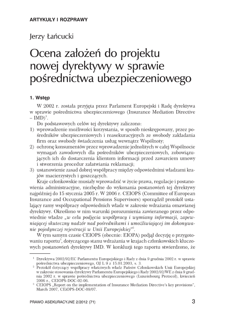 A R T Y K U ŁY I R O ZPR AW Y Jerzy Łańcucki Ocena założeń do projektu nowej dyrektywy w sprawie pośrednictwa ubezpieczeniowego 1. Wstąp W 2002 r. została przyjęta przez Parlam ent Europejski i Radę dyrektywa w sprawie pośrednictwa ubezpieczeniowego (Insurance Mediation Directive - IMD)1. Do podstawowych celów tej dyrektywy zaliczono: 1) wprowadzenie możliwości korzystania, w sposób nieskrępowany, przez po średników ubezpieczeniowych i reasekuracyjnych ze swobody zakładania firm oraz swobody świadczenia usług wewnątrz Wspólnoty; 2) ochronę konsumentów przez wprowadzenie jednolitych w całej Wspólnocie wymagań zawodowych dla pośredników ubezpieczeniowych, zobowiązu jących ich do dostarczenia klientom informacji przed zawarciem umowy i stworzenia procedur załatwiania reklamacji; 3) ustanowienie zasad dobrej współpracy między odpowiednimi władzami kra jów macierzystych i goszczących. Kraje członkowskie musiały wprowadzić w życie prawa, regulacje i postano wienia administracyjne, niezbędne do wykonania postanowień tej dyrektywy najpóźniej do 15 stycznia 2005 r. W 2006 r. CEIOPS (Committee of European Insurance and Occupational Pensions Supervisors) sporządził protokół usta lający ramy współpracy odpowiednich władz w zakresie wdrażania omawianej dyrektywy. Określono w nim warunki porozumienia zawieranego przez odpo wiednie władze ,,w celu podjęcia współpracy i w ym iany informacji, zapew niającej skuteczny nadzór nad pośrednikami i umożliwiającej im dokonywa nie pojedynczej rejestracji w Unii Europejskiej,a. W tym samym czasie CEIOPS (obecnie: EIOPA) podjął decyzję o przygoto waniu raportu3, dotyczącego stanu wdrażania w krajach członkowskich kluczo wych postanowień dyrektywy IMD. W konkluzji tego raportu stwierdzono, że 1 Dyrektywa 2002/92/E C P a rlam en tu Europejskiego i Rady z dnia 9 grudnia 2002 r. w sprawie pośrednictw a ubezpieczeniow ego, OJ L 9 z 15.01.2003, s. 3. 2 Protokół dotyczący w spółpracy w łaściw ych władz Państw Członkow skich U nii Europejskiej w zakresie stosow ania dyrektywy P a rlam en tu Europejskiego i Rady 2002/92/W E z d nia 9 gru d n ia 2002 r. w spraw ie pośrednictw a ubezpieczeniow ego (L uxem bourg Protocol), kwiecień 2006 r., CEIO PS-D O C -02-06. 3 CEIO PS „Report on th e im p lem en tatio n of In su ra n ce M ediation D irective’s key provisions”, M arch 2007, C EiO PS-D O C-09/07. PRAWO ASEKURACYJNE 2/2012 (71) 3 A R T Y K U ŁY I R O ZPR AW Y wszystkie kraje członkowskie przyjęły minimalne standardy zawarte w dyrekty wie. Jednak w niektórych przypadkach zdecydowały się one na surowsze regu lacje dotyczące wysokości sumy gwarancyjnej, odnoszącej się do ich odpowie dzialności cywilnej za błąd w sztuce oraz wymagań informacyjnych dostarcza nych klientowi. W konsekwencji, w krajowych regulacjach krajów członkow skich powstała swoista „mozaika regulacyjna”, która w sposób znaczący zróżni cowała osiągany w poszczególnych krajach poziom ochrony konsumentów. Pierwotnie Komisja Europejska planowała przedstawić projekt nowej dyrek tywy (IMD II) wiosną 2011 r4. Przewiduje się, że nastąpi to w najbliższym czasie. 2. Przestanki zmian w obowiązującej dyrektywie w sprawie pośrednictwa ubezpieczeniowego Najczęściej, za najistotniejszą przesłankę podjęcia prac zmierzających do wprowadzenia zmian do dyrektywy w sprawie pośrednictwa ubezpieczeniowe go uważa się treść zapisu w jednym z punktów preambuły dyrektywy Solvency II5, w którym stwierdza się, że przyjęcie tej dyrektywy zmienia profil ryzyka zakładu ubezpieczeń w stosunku do ubezpieczającego. W związku z tym zobo wiązuje się Komisję Europejską do przedstawienia, najpóźniej do końca 2010 r., wniosku dotyczącego przeglądu dyrektywy w sprawie pośrednictwa ubezpieczeniowego „z uwzględnieniem konsekwencji, jakie niniejsza dyrekty wa będzie miała dla ubezpieczających”. Za drugą, istotną przesłankę można uznać konieczność dokonania wyboru określonego poziomu harmonizacji, czyli poziomu pomiędzy minimalnym a maksymalnym jej wymiarem, w związku z obecną sytuacją w całym sektorze finansowym i decyzjami regulacyjnymi, podejmowanymi w odniesieniu do in nych usług finansowych. Według raportu CEIOPS, analiza procesu im plem en tacji dyrektywy w sprawie pośrednictwa ubezpieczeniowego, który - jak już wcześniej wspomniano - formalnie zakończył się 15 stycznia 2005 r., wyraźnie wskazuje na to, że w rezultacie minimalnej harmonizacji ustanowionej tą dyre ktywą, szereg jej postanowień zostało implementowanych w państwach człon kowskich w sposób jakościowo zróżnicowany, szczególnie w obszarze ochrony konsumenta. Stanowisko to podziela Komisja Europejska. Zdaniem Karela van Hulle6, minimalna harmonizacja, sama w sobie, stanowi instrum ent rynkowych wypa czeń, co znalazło odzwierciedlenie w wielu skargach kierowanych do Komisji Europejskiej. Wystąpiło w niektórych krajach zjawisko tzw. goldplatingu, czyli 4 C om m unication from th e Com m ission to the E u ro p ean P arlam ent, the Concil, the E uropean E conom ic a n d Social C om m ittee and the E u ro p ean C entral Bank. Regulating financial services for sustainable growth, Brussels, 2.06.2010, Anex1, C 0M /2010/301/final. 5 Dyrektywa P a rlam en tu E uropejskiego i Rady 2 009/138/U E z dnia 25 listopada 2009 r.w sp ra wie podejm ow ania i prow adzenia działalności ubezpieczeniow ej i reasekuracyjnej (W ypłacal ność II). Dz. U. UE L 335, s. 1. 6 H ead of the In su ra n ce & P ensions U nit at the DG In tern a l M arket & Services of the E uropean Com m ission. 4 PRAWO ASEKURACYJNE 2/2012 (71) Ocena założeń do projektu nowej dyrektywy w sprawie pośrednictwa sytuacja, w której krajowe przepisy nałożyły na pośredników większe rygory, niż wynikałoby to z przepisów wspólnotowych7. Komisja uznała, że wyższy poziom harmonizacji leży zatem w interesie wszystki