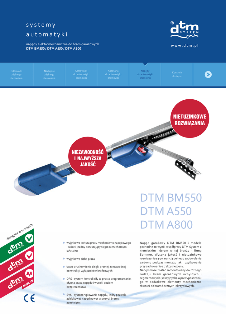 systemy automatyki napędy elektromechaniczne do bram garażowych DTM BM550 / DTM A550 / DTM A800 Odbiorniki zdalnego sterowania Nadajniki zdalnego sterowania Sterowniki do automatyki bramowej www.dtm.pl Akcesoria do automatyki bramowej Napędy do automatyki bramowej Kontrola dostępu NIETUZINKOWE ROZWIĄZANIA NIEZAWODNOŚĆ I NAJWYŻSZA JAKOŚĆ DTM BM550 DTM A550 DTM A800 h: jac yw rs we pn ę ost d wyjątkowa kultura pracy mechanizmu napędowego - wózek jezdny poruszający się po nieruchomym łańcuchu 8 86 wyjątkowo cicha praca łatwe uruchomienie dzięki prostej, niezawodnej konstrukcji wyłączników krańcowych M TI UL DPS - system kontroli siły to proste programowanie, płynna praca napędu i wysoki poziom bezpieczeństwa SVS - system ryglowania napędu, który pozwala zablokować napęd nawet w pozycji bramy zamkniętej Napęd garażowy DTM BM550 i modele pochodne to wynik współpracy DTM System z niemieckim liderem w tej branży - firmą Sommer. Wysoka jakość i nietuzinkowe rozwiązania są gwarancją pełnego zadowolenia zarówno podczas montażu jak i użytkowania przy zachowaniu atrakcyjnej ceny. Napęd może zostać zamontowany do różnego rodzaju bram garażowych uchylnych i segmentowych (sekcyjnych), a po wyposażeniu go w dodatkowe elementy mechaniczne również do bram bocznych i skrzydłowych. DTM BM550 / DTM A550 / DTM A800 napędy elektromechaniczne do bram garażowych DTM BM550 / DTM A550 / DTM A800 Parametry podstawowe zasilanie: klasa ochrony: intensywność pracy: temperatura pracy: zabezpieczenie termiczne: wbudowane oświetlenie / czas świecenia: wbudowane wyłączniki krańcowe: poziom hałasu generowany przez napęd: długość szyny jezdnej: maksymalna wysokość bramy segmentowej / uchylnej: 230VAC / 50Hz IP-20 15% -20 °C do +60°C 140°C 32,5V 34W / 15s mechaniczne, regulowane w szynie jezdnej 75dBA szyna łączona z solidnych i precyzyjnych elementów o łącznej długości 2550mm 2300 / 2550mm Parametry wyróżniające DTM BM550 i DTM A550 maksymalna / nominalna siła uciągu: maksymalna powierzchnia bramy: maksymalna szerokość bramy: pobór prądu: pobór mocy / pobór mocy w spoczynku: maksymalna prędkość ruchu bramy: 550N / 165N 8,25m2 3500mm 0,7A 60-220W (140W przy 165N) / 7W 160mm/s Parametry wyróżniające DTM A800 maksymalna / nominalna siła uciągu: maksymalna powierzchnia bramy: maksymalna szerokość bramy: pobór prądu: pobór mocy / pobór mocy w spoczynku: maksymalna prędkość ruchu bramy: 800N / 240N 12,6m2 6000mm 0,8A 80-450W (160W przy 240N) / 2W 150mm/s Parametry sterowania radiowego serii DTM433MHz / DTM868MHz moduł radiowy: zabezpieczenie transmisji: rodzaj modulacji, częstotliwość: antena: pojemność pamięci: możliwość kasowania całej pamięci: możliwość kasowania pojedynczego pilota: możliwość wpisania pilota bez konieczności dostępu do sterownika: blokada zdalnego dopisywania: zintegrowany, superheterodynowy, zapewniający wysoką niezawodność 64-bit KeeLoq® / 104-bit IRS ASK, 433MHz / FSK, 868MHz wewnętrzna (złącze w sterowniku do podłączenia anteny zewnętrznej) 35 pilotów serii DTM433MHz lub DTM868MHz tak tak, konieczność posiadania usuwanego pilota tak, funkcja zdalnego dopisywania pilota - tylko piloty DTM System tak Parametry funkcjonalne interfejs użytkownika: mechanizm napędowy: możliwość ręcznego otwarcia / zamknięcia i zaryglowania bramy: potrzeba dodatkowego ryglowania bramy: programowanie siły sterownika: możliwość podłączenia dodatkowych akcesoriów: sterowanie z przycisku typu NO: sterownik: wbudowana lampa sygnalizacyjno-oświetleniowa: bezpieczeństwo: możliwość zastosowania do bram różnych producentów: zabezpieczenie przed zgnieceniem: programowanie funkcji wejścia dodatkowego: tryby pracy wbudowanej lampy: funkcja "skok w tył" po zamknięciu: funkcja zamknij / otwórz na osobnych przyciskach: otwarcie częściowe bramy: w oparciu o diody LED, przyciski typu SWITCH i opcjonalnie DIP-SWITCH wózek jezdny z silnikiem tak, również w pozycji bramy zamkniętej nie, mechanizm samohamowny układ elektroniczny DPS - precyzyjnie dobrane parametry elektryczne zapewniające szybką, cichą pracę z łagodnym startem i zatrzymaniem tak, fotokomórki, w DTM A550/A800 dodatkowo lampa 24V max. 1A tak, w standardzie przycisk naścienny i podłączony do sterownika przewód o długości 5 metrów wtykowa płyta sterownicza ze zintegrowanym odbiornikiem radiowym tak spełnia wymagania restrykcyjnej normy europejskiej PN-EN 12453:2002 w zakresie bezpieczeństwa użytkowania bram z napędem certyfikaty zgodności z bramami znanych producentów wyjątkowo czuły, szybki, elektroniczny mechanizm wykrywania przeszkody, cofający o 100mm i zatrzymujący bramę (w DTM A550/A800 mozna włączyć funkcję całkowitego otwarcia bramy) zatrzymanie przy otwieraniu, cofnij lub powrót po foto, jako wejście C2, (funkcje dostępne tylko w modelach DTM A550/A800) miga lub świeci, świecenie wstępne (tylko modele DTM A550/A800) tak, od 1 do 5mm (tylko modele DTM A550/A800) tak, C1 - otwórz, C2 - zamknij (tylko modele DTM A550/A800) tak (tylko modele DTM A550/A800) Dostępne akcesotria: okucie do bramy segmentowej regulowane, wysprzęglenie kluczykowe z linką, cięgno Bowdena, podwieszenie sufitowe, przedłużenie prowadnicy 800mm, mocowanie sufitowe, żarówka 32,5V/34W. Więcej informacji udziela nasz dział handlowy. systemy automatyki DTM System, ul. Brzeska 7, 85-145 Bydgoszcz tel./fax +48 52 340 15 83, e-mail: [email protected] www.dtm.pl