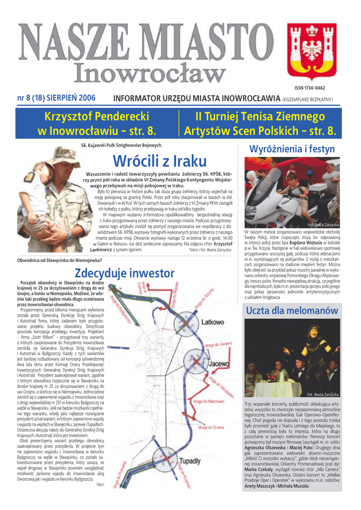ISSN 1734-0462 nr 8 (18) SIERPIEŃ 2006 INFORMATOR URZĘDU MIASTA INOWROCŁAWIA (EGZEMPLARZ BEZPŁATNY) Krzysztof Penderecki w Inowrocławiu - str. 8. II Turniej Tenisa Ziemnego Artystów Scen Polskich - str. 8. 56. Kujawski Pułk Śmigłowców Bojowych. Wrócili z Iraku Wzruszenie i radość towarzyszyły powitaniu ¿ołnierzy 56. KPŚB, którzy przez pół roku w składzie VI Zmiany Polskiego Kontyngentu Wojskowego przebywali na misji pokojowej w Iraku. Była to pierwsza w historii pułku tak du¿a grupa ¿ołnierzy, którzy wyjechali na misję pokojową za granicę Polski. Przez pół roku stacjonowali w bazach w Ad. Diwaniyah i w Al Kut. W tych samych bazach ¿ołnierzy z VI Zmiany PKW zastąpili ich koledzy z pułku, którzy przebywają w Iraku od kilku tygodni. W majowym wydaniu informatora opublikowaliśmy bezpośrednią relację z Iraku przygotowaną przez ¿ołnierzy z naszego miasta. Podczas przygotowywania tego artykułu zrodził się pomysł zorganizowania we współpracy z dowództwem 56. KPŚB, wystawy fotografii wykonanych przez ¿ołnierzy z naszego miasta podczas misji. Otwarcie wystawy nastąpi 12 września br. o godz. 14.00 w Galerii w Ratuszu. Ju¿ dziś serdecznie zapraszamy. Na zdjęciu chor. Krzysztof Lankiewicz z synem Igorem. Tekst i fot. Beata Zarzycka Obwodnica od Sławęcinka do Niemojewka? Zdecyduje inwestor Początek obwodnicy w Sławęcinku na drodze krajowej nr 25 za skrzy¿owaniem z drogą do wsi Gnojno, a koniec w Niemojewku. Mo¿liwe, ¿e właśnie taki przebieg będzie miała długo oczekiwana przez inowrocławian obwodnica. Przypomnijmy, przed kilkoma miesiącami wyłoniona została przez Generalną Dyrekcję Dróg Krajowych i Autostrad firma, której zadaniem było przygotowanie projektu budowy obwodnicy. Dotychczas powstała koncepcja przebiegu inwestycji. Projektant – firma „Scott Wilson” – przygotował trzy warianty, o których zaopiniowanie do Prezydenta Inowrocławia zwróciła się Generalna Dyrekcja Dróg Krajowych i Autostrad w Bydgoszczy. Ka¿dy z tych wariantów jest bardziej rozbudowany od koncepcji zatwierdzonej dwa lata temu przez Komisję Oceny Przedsięwzięć Inwestycyjnych Generalnej Dyrekcji Dróg Krajowych i Autostrad. Prezydent zaakceptował wariant, zgodnie z którym obwodnica rozpocznie się w Sławęcinku na drodze krajowej nr 25 za skrzy¿owaniem z drogą do wsi Gnojno, a skończy się w Niemojewku. Jednocześnie zwrócił się o zapewnienie wyjazdu z Inowrocławia oraz z drogi wojewódzkiej nr 251 w kierunku Bydgoszczy na węźle w Sławęcinku. Jeśli nie będzie mo¿liwości spełnienia tego warunku, wtedy jako najlepsze rozwiązanie prezydent uznał wariant, w którym zapewniono wjazdy i wyjazdy na węzłach w Sławęcinku, Jacewie i Tupadłach. Ostateczna decyzja nale¿y do Generalnej Dyrekcji Dróg Krajowych i Autostrad, która jest inwestorem. Obok prezentujemy wariant przebiegu obwodnicy zaakceptowany przez prezydenta. W projekcie tym nie zapewniono wyjazdu z Inowrocławia w kierunku Bydgoszczy na węźle w Sławęcinku, co zostało zakwestionowane przez prezydenta, który uwa¿a, ze węzeł drogowy w Sławęcinku powinien uwzględniać mo¿liwość zarówno wjazdu do Inowrocławia ulicą Dworcową jak i wyjazdu w kierunku Bydgoszczy. (bez) Wyró¿nienia i festyn Fot. Beata Zarzycka W naszym mieście zorganizowano wojewódzkie obchody Święta Policji, które rozpoczęto mszą św. odprawioną w intencji policji przez bpa Bogdana Wojtusia w kościele p.w. Św. Krzy¿a. Następnie w hali widowiskowo-sportowej przygotowano uroczystą galę, podczas której odznaczono m.in. wyró¿niających się policjantów. Z myślą o mieszkańcach zorganizowano na stadionie miejskim festyn. Mo¿na było obejrzeć na przykład pokaz musztry paradnej w wykonaniu orkiestry wojskowej Pomorskiego Okręgu Wojskowego, tresury psów. Ponadto niewątpliwą atrakcją, szczególnie dla najmłodszych, była m.in. prezentacja sprzętu policyjnego oraz pokaz sprawności jednostek antyterrorystycznych z udziałem śmigłowca. Uczta dla melomanów Fot. Beata Zarzycka Trzy wspaniałe koncerty, publiczność oklaskująca artystów, wszystko to stworzyło niezapomnianą atmosferę tegorocznej Inowrocławskiej Gali Operowo-Operetkowej. Choć pogoda nie dopisała i z tego powodu trzeba było przenieść galę z Teatru Letniego do Miejskiego, to z całą pewnością była to impreza, która na długo pozostanie w pamięci melomanów. Pierwszy koncert poświęcony był muzyce filmowej (wystąpili m. in. soliści Agnieszka Olszewska i Maciej Puto) Drugiego dnia gali zaprezentowano widowisko słowno-muzyczne „Miłość Ci wszystko wybaczy”, gdzie obok niezastąpionej Inowrocławskiej Orkiestry Promenadowej pod dyr. Marka Czekały, wystąpił równie¿ chór „Alla Camera” oraz Agnieszka Olszewska. Ostatni koncert to „Wielkie Przeboje Oper i Operetek” w wykonaniu m.in. solistów: Anety Maszczyk i Michała Musiała. 2 nr 8 (18) NASZE MIASTO INOWROCŁAW SIERPIEŃ 2006 Inwestycje. Co? Gdzie? Kiedy? W sierpniowym wydaniu informatora wyjaśniamy jakich formalności nale¿y dopełnić, aby uzyskać decyzję zatwierdzającą projekt podziału geodezyjnego nieruchomości na terenie naszego miasta. Wydanie decyzji zatwierdzającej wspomniany projekt następuje w oparciu o wcześniej zatwierdzone postanowienie o zgodności projektowanego podziału z planem miejscowym zagospodarowania przestrzennego, z urzędu lub na wniosek. Wymagane dokumenty: - odręcznie napisany wniosek wskazujący daną nieruchomość, - postanowienie o zgodności projektowanego podziału, - końcowy projekt podziału nieruchomości sporządzony przez uprawnionego geodetę. Koszty: Wnioski i załączniki opisowo-graficzne zwolnione są z opłat skarbowych. W przypadku odwołania od decyzji obowiązuje opłata skarbowa w wysokości: od odwołania – 5 zł, od ka¿dego załącznika – 0,50 zł. Termin realizacji: Sprawę rozpatruje się w terminie 30 dni, zaś w sprawie wymagaj