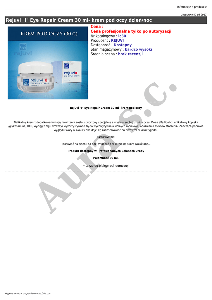 Informacje o produkcie Utworzono 02-03-2017 Rejuvi "I" Eye Repair Cream 30 ml- krem pod oczy dzień/noc Cena : Cena profesjonalna tylko po autoryzacji s. c. Nr katalogowy : ic30 Producent : REJUVI Dostępność : Dostępny Stan magazynowy : bardzo wysoki Średnia ocena : brak recenzji Rejuvi "I" Eye Repair Cream 30 ml- krem pod oczy Delikatny krem z dodatkową funkcją nawilżania został stworzony specjalnie z myślą o suchej okolicy oczu. Kwas alfa lipolic i unikatowy kopleks /glykosamine, HCL, wyciąg z alg i drożdży/ wykorzystywane są do wychwytywania wolnych rodników i opóźniania efektów starzenia. Znacząca poprawa wyglądu skóry w okolicy oka daje się zaobserwować na przestrzeni kilku tygodni. Zastosowanie: a Stosować na dzień i na noc. Wklepać delikatnie na skórę wokół oczu. Produkt dostępny w Profesjonalnych Salonach Urody Au r Pojemność 30 ml. * także do pielęgnacji domowej Wygenerowano w programie www.oscGold.com